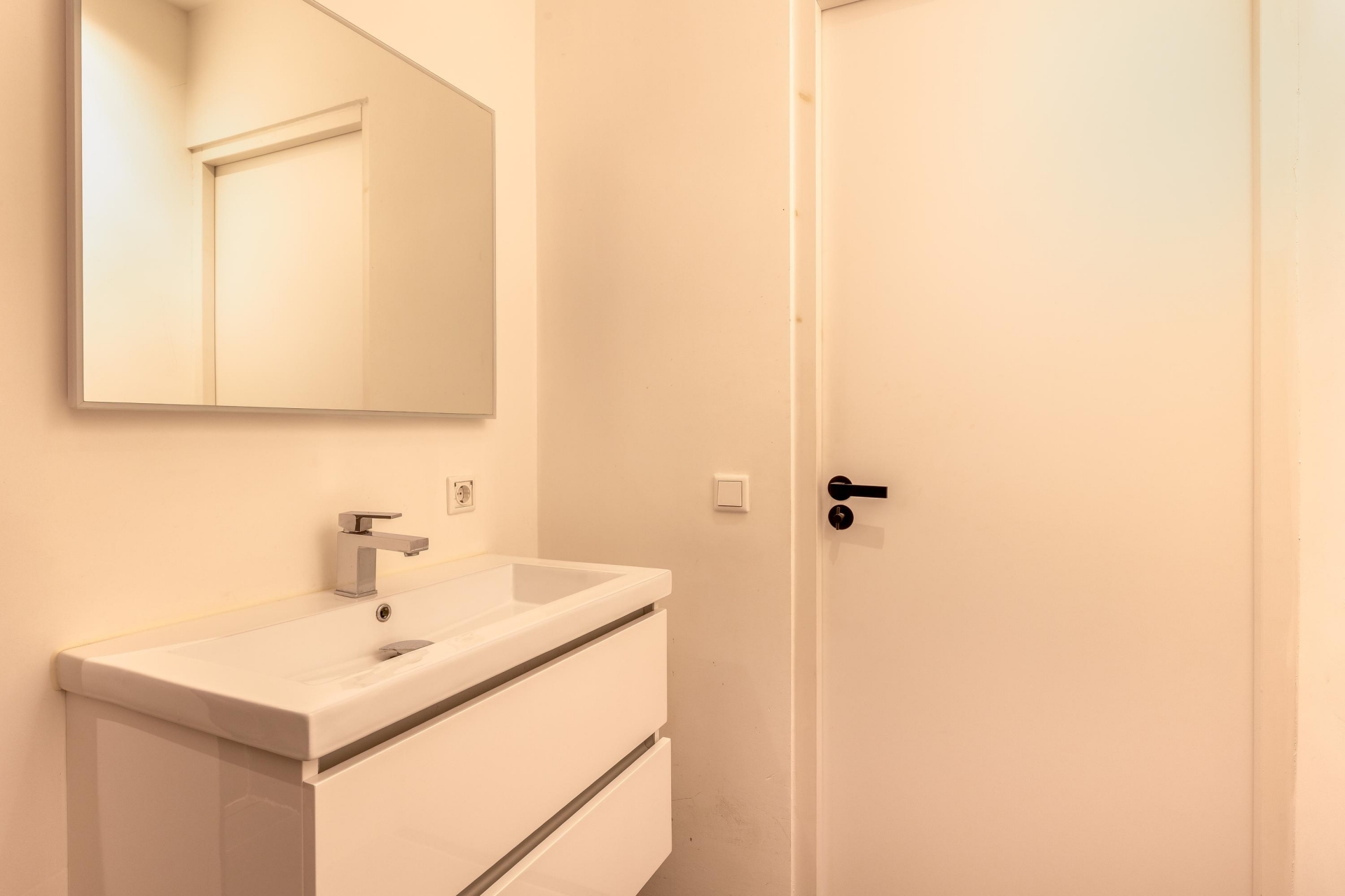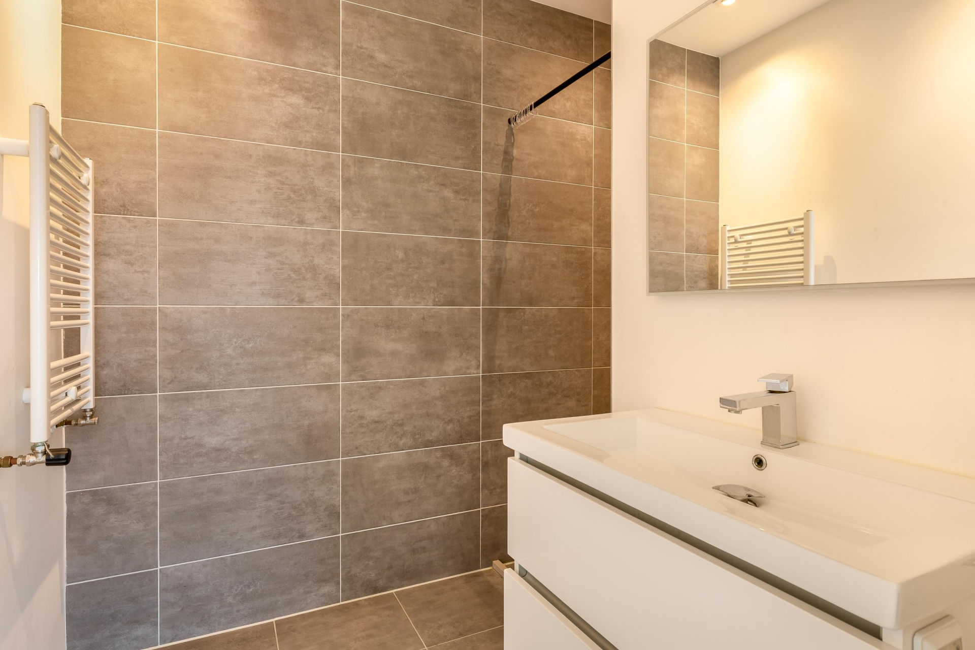 De moderne badkamer is voorzien van een inloopdouche, wastafel en spiegel, en het toilet bevindt zich separaat tussen de woon- en slaapkamer. In de hal is bovendien een vaste kast met extra bergruimte aanwezig.