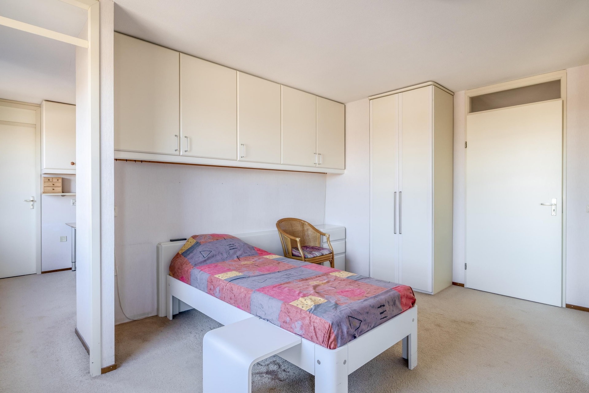 Vanuit de hobbyruimte is ook een doorloop naar de tweede slaapkamer, welke ook vanuit de gang en vanuit de keuken bereikbaar is. Deze (slaap)kamer is voorzien van een vaste kastenwand en meet ca. 13.5m².