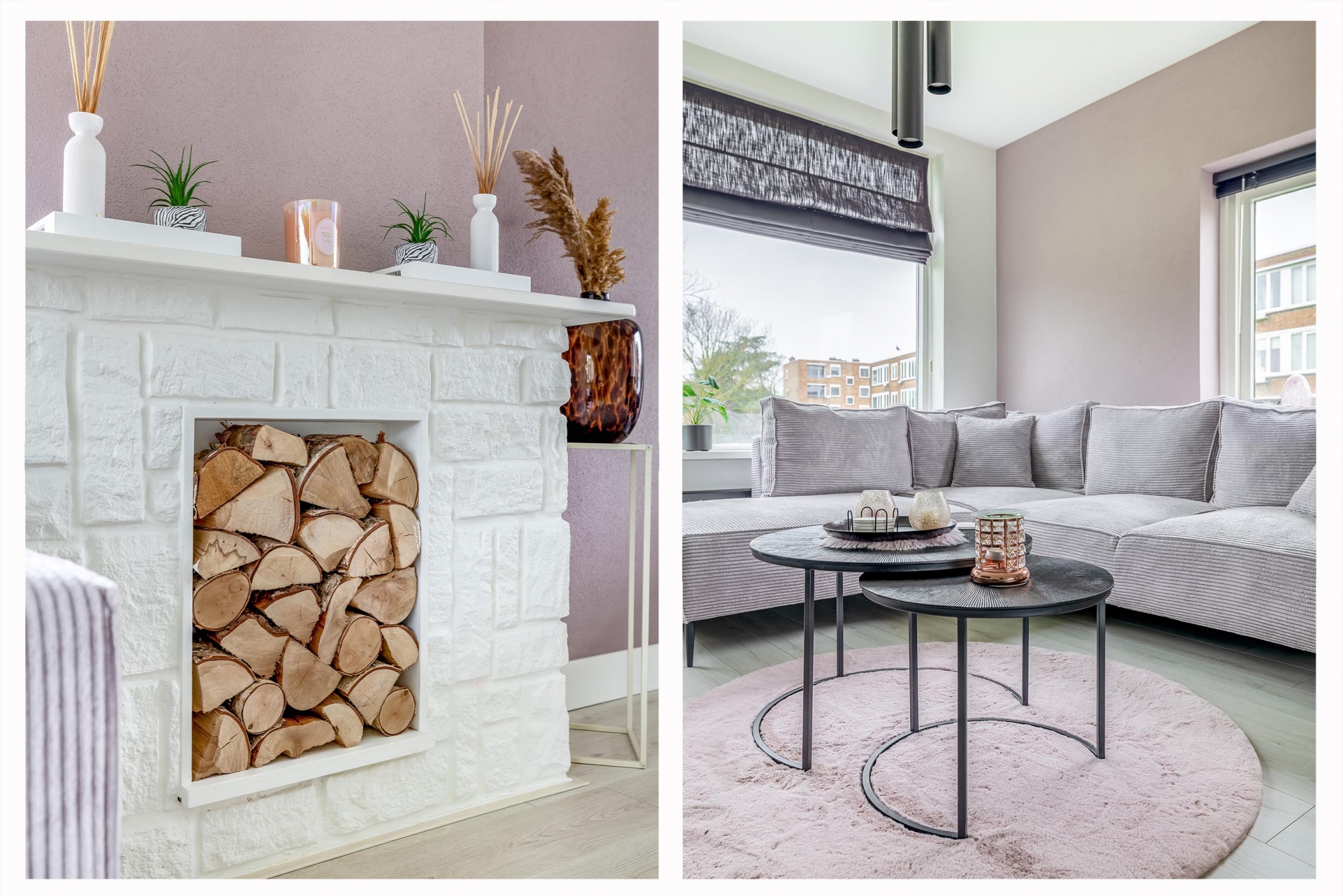 De eethoek ligt aan de achterzijde, vlakbij de toegang tot het balkon. Hierdoor loopt binnen en buiten op een natuurlijke manier in elkaar over. De schouw met rookkanaal geeft karakter aan de ruimte en biedt mogelijkheden voor wie sfeer wil toevoegen.