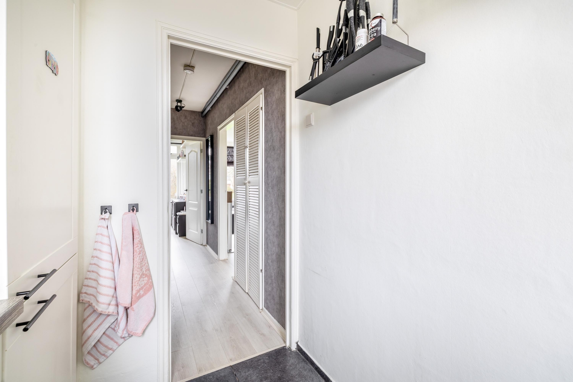 De keuken is modern uitgevoerd in een lichte kleurstelling met strak tegelwerk. Compact, maar praktisch ingedeeld en voorzien van diverse inbouwapparatuur. Dankzij het raam is er prettig daglicht en natuurlijke ventilatie tijdens het koken.