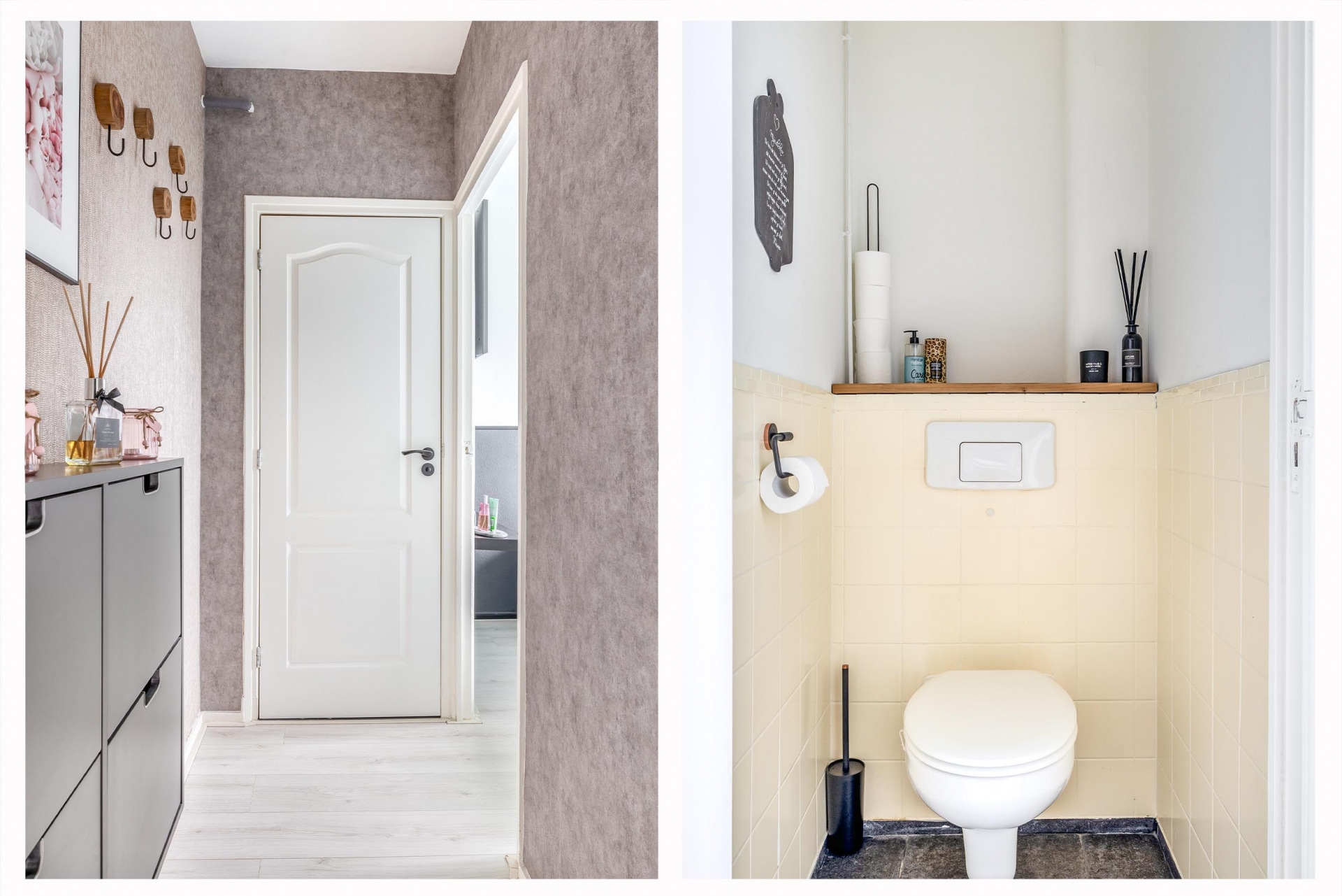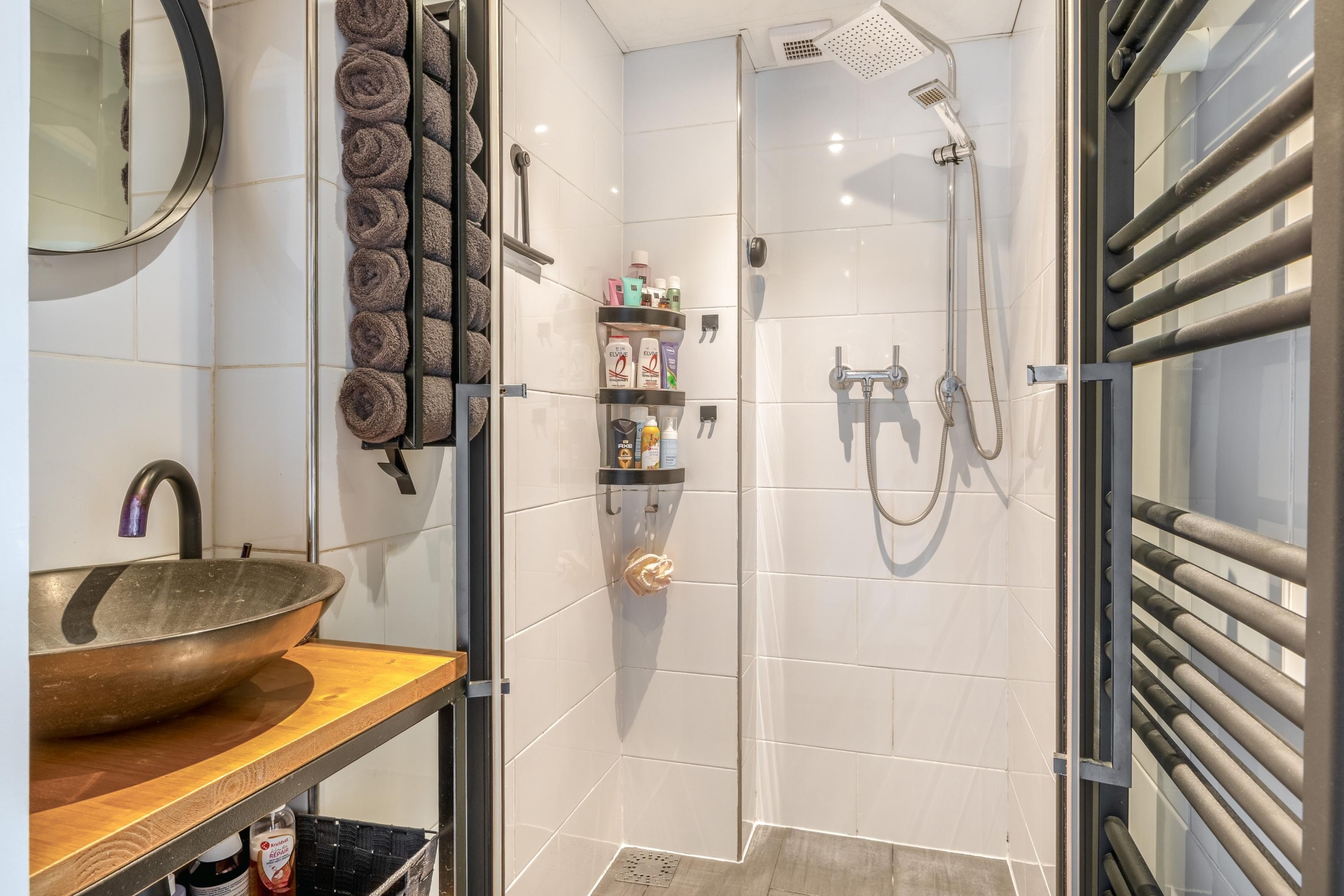 De badkamer is verzorgd en modern afgewerkt met een inloopdouche en een wastafelmeubel. De combinatie van witte wandtegels en donkere accenten geeft het geheel een eigentijdse uitstraling. Daarnaast is er een separaat toilet, wat altijd prettig is – zeker als je bezoek hebt.