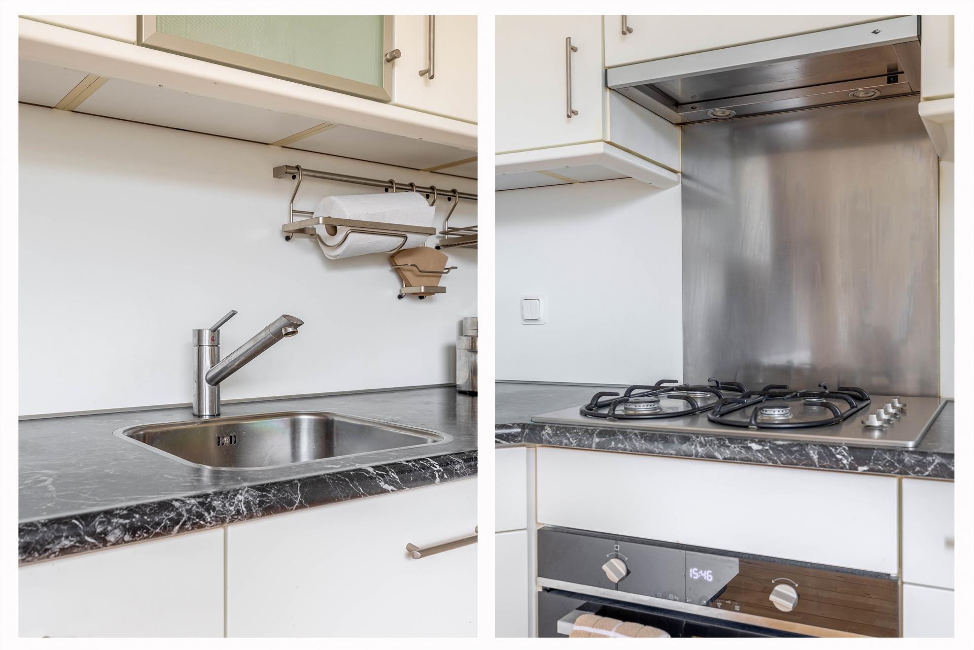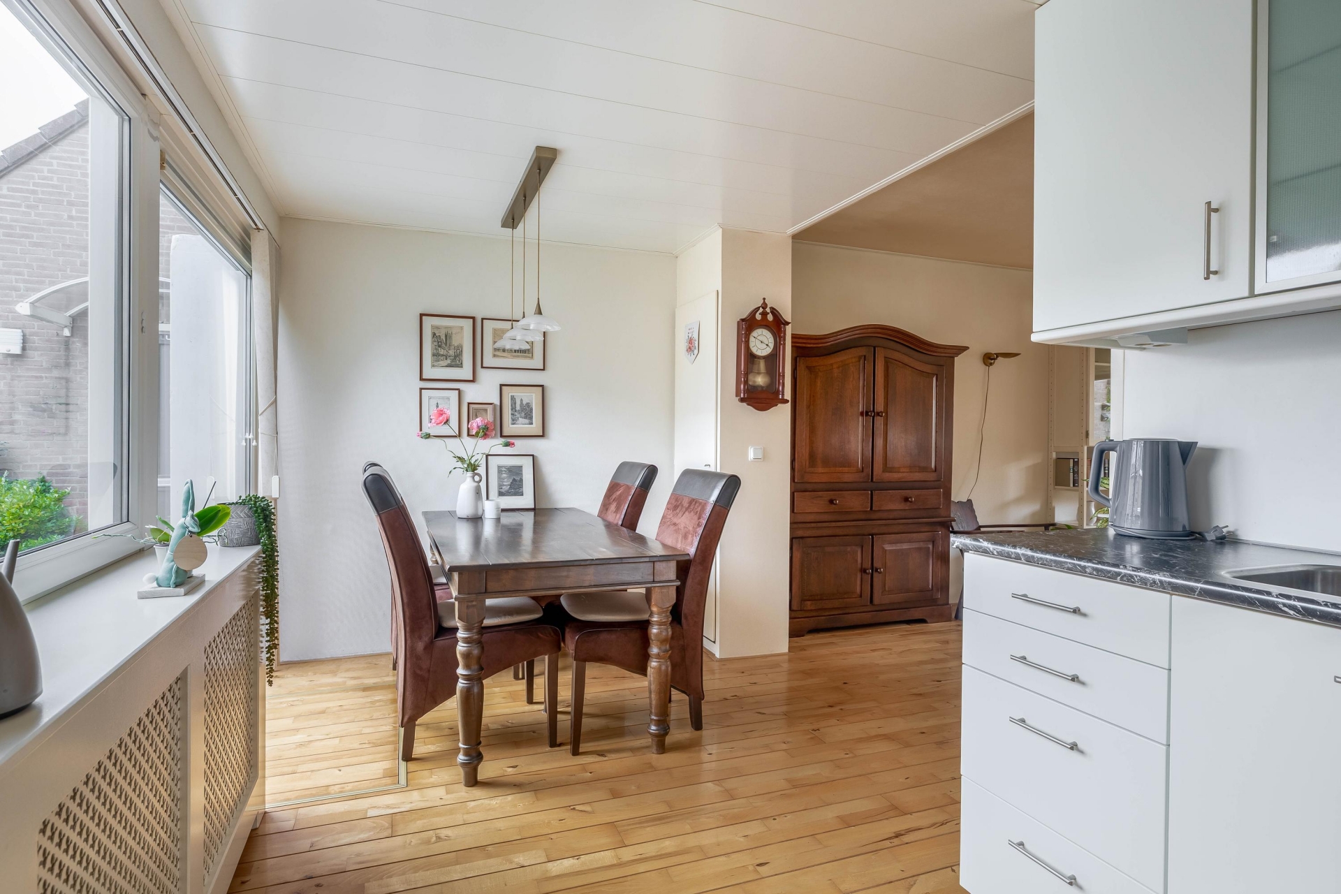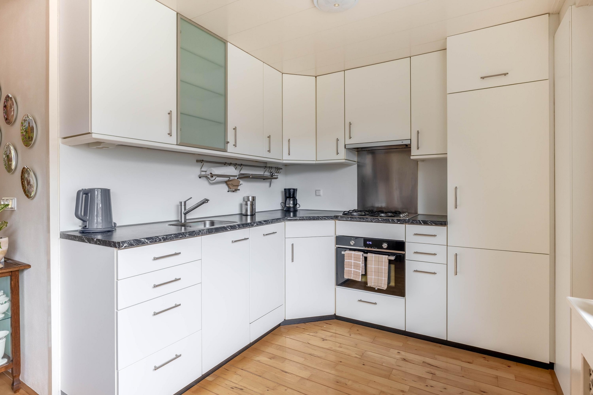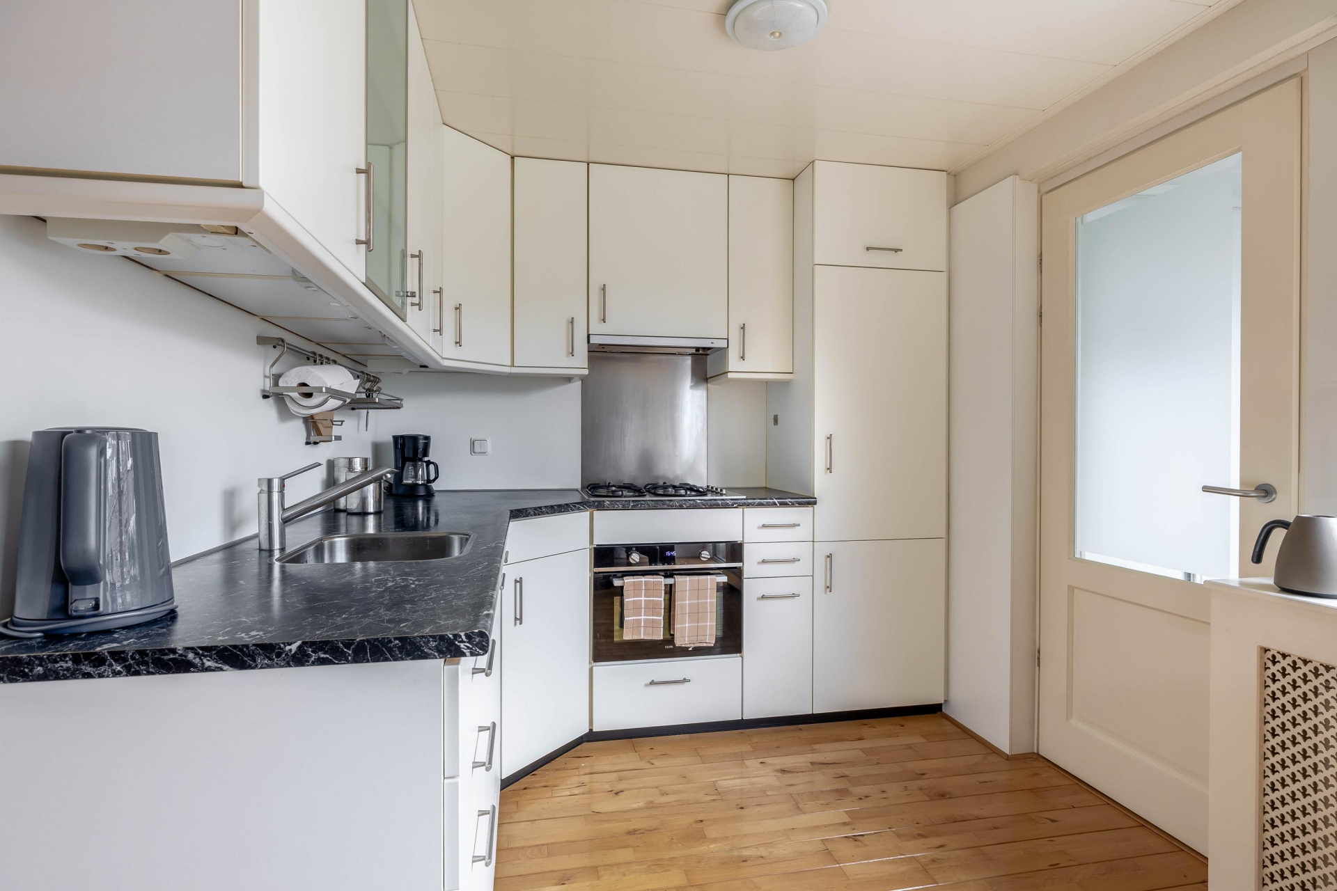 Aan de voorzijde van het huis vind je de verzorgde keuken, met een slimme hoekopstelling die zorgt voor veel werkruimte én opbergruimte. De keuken is uitgerust met diverse inbouwapparatuur zoals een gaskookplaat, oven, afzuigkap, vaatwasser en koel-/vriescombinatie. De lichte kleurstelling, het donkere werkblad en de houten vloer zorgen voor een tijdloze uitstraling die past in elk interieur.