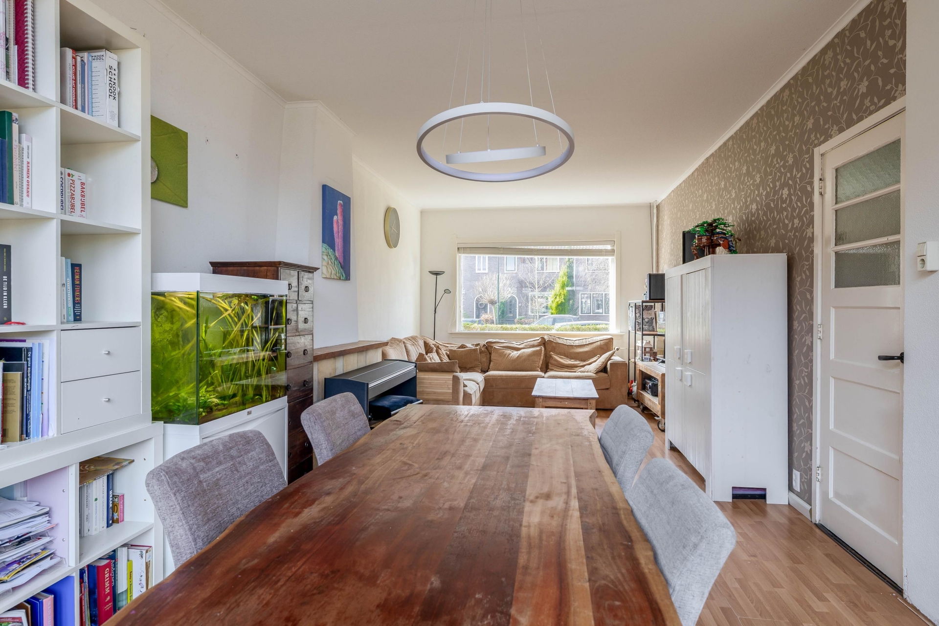 Bij binnenkomst valt direct de prettige indeling op. De doorzon woonkamer zorgt voor een mooie lichtinval gedurende de dag, met aan de voorzijde uitzicht op de brede straat en aan de achterzijde zicht op de tuin. Dit is zo’n ruimte waar je makkelijk een gezellige zithoek en een ruime eethoek kwijt kunt.