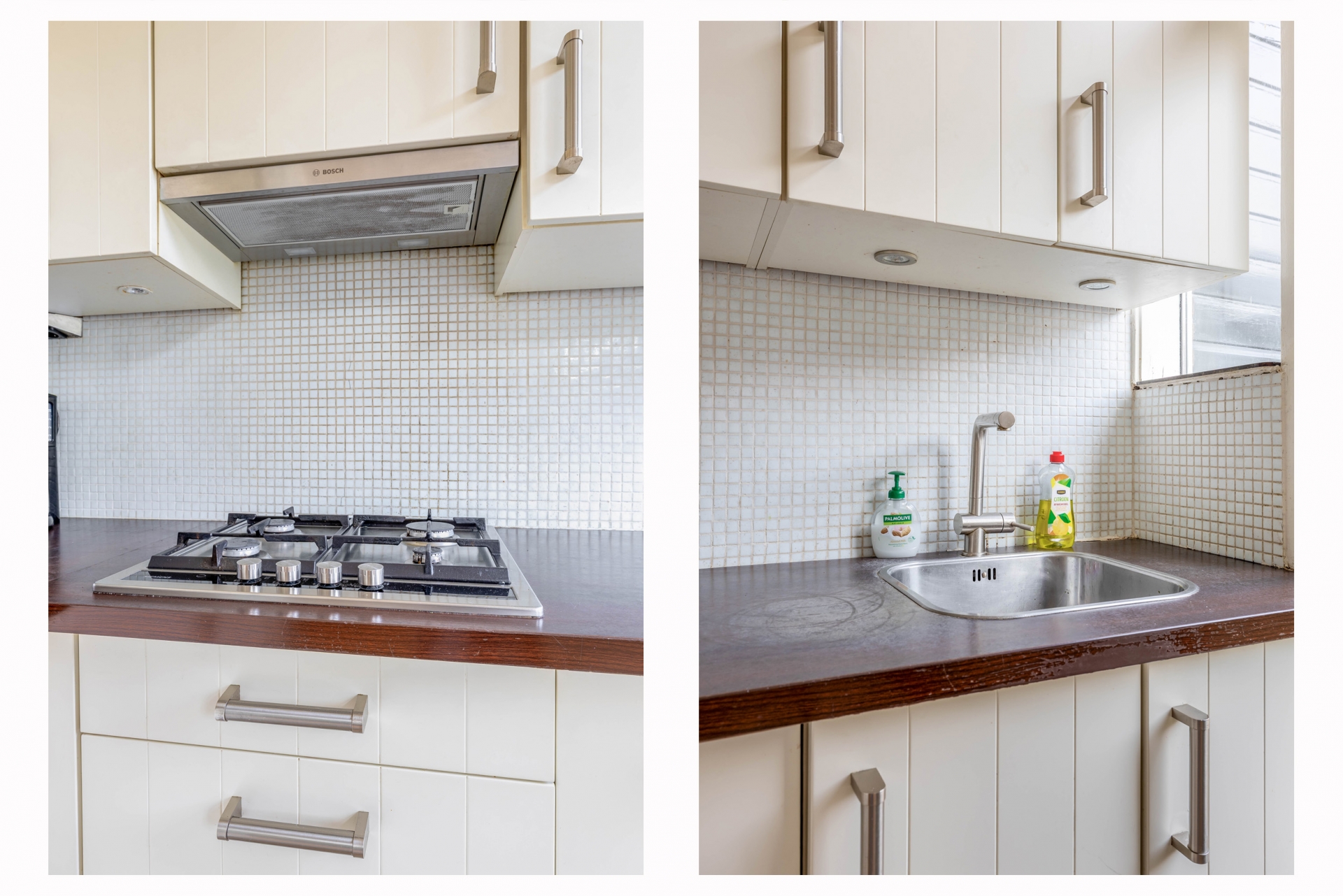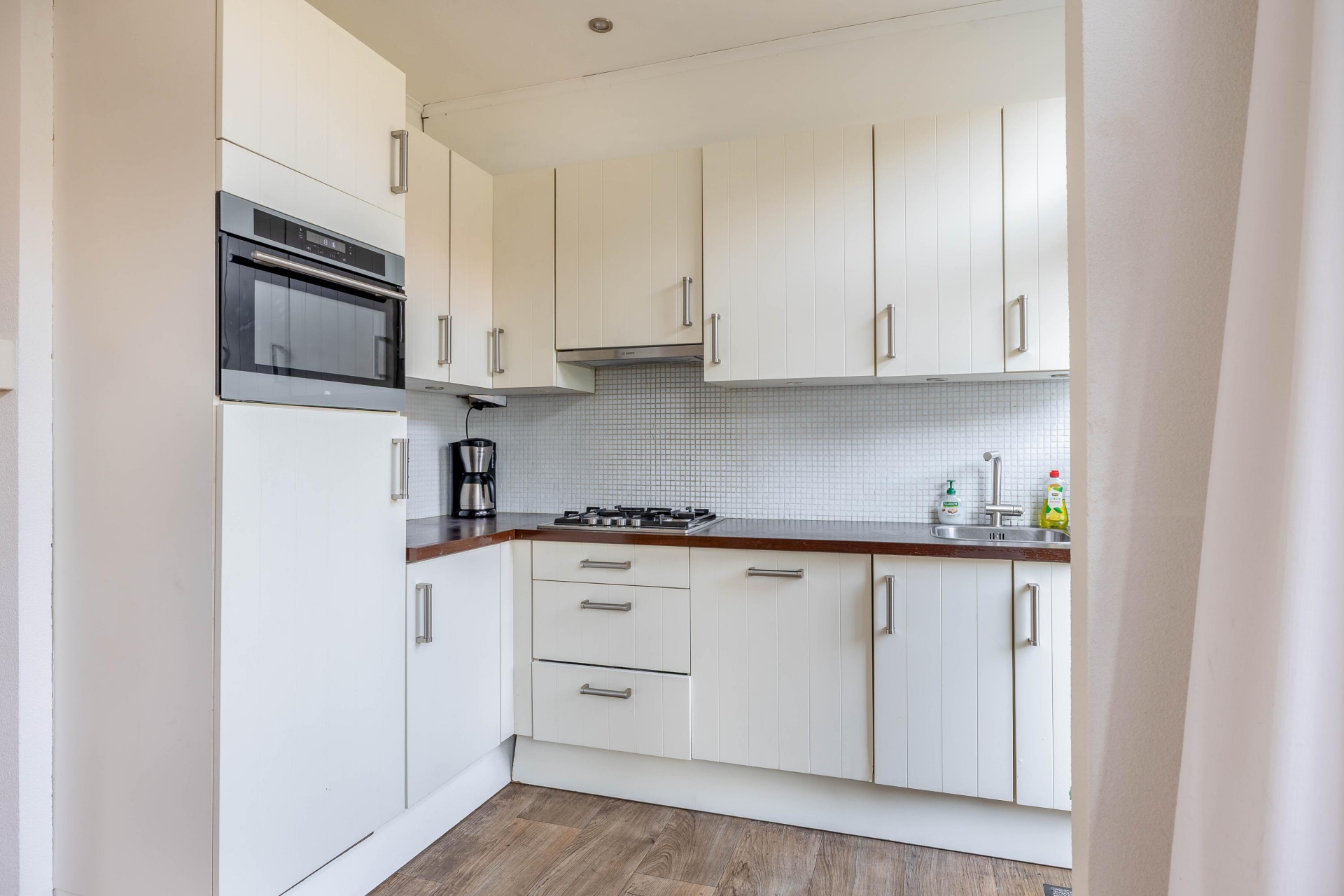 De keuken is praktisch ingericht en uitgevoerd in een lichte kleurstelling, wat zorgt voor een frisse uitstraling. Je hebt hier voldoende werk- en opbergruimte en alle benodigde apparatuur waaronder een vaatwasser, gasfornuis, afzuiging, koel-vriescombinatie en oven/magnetron aanwezig is.