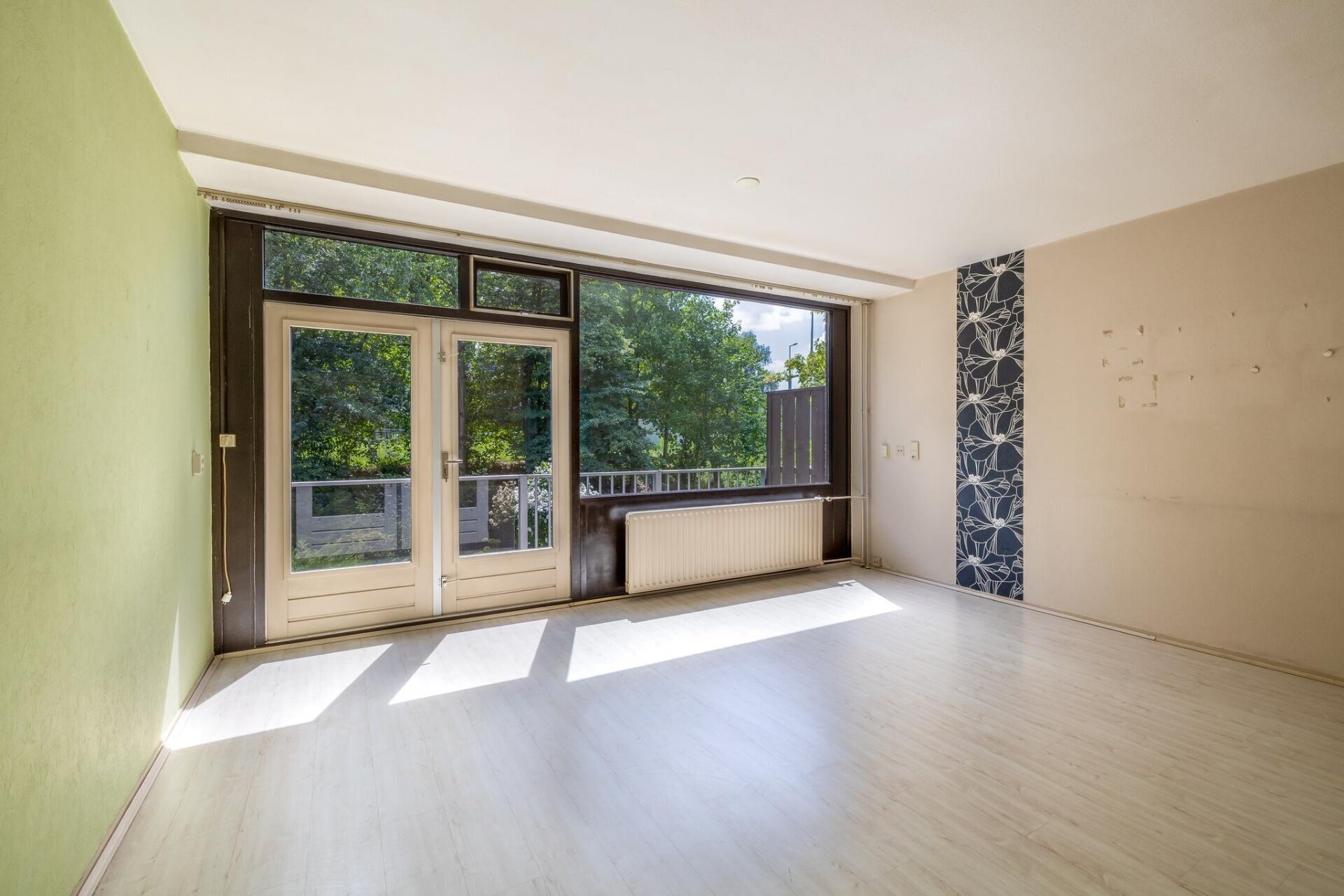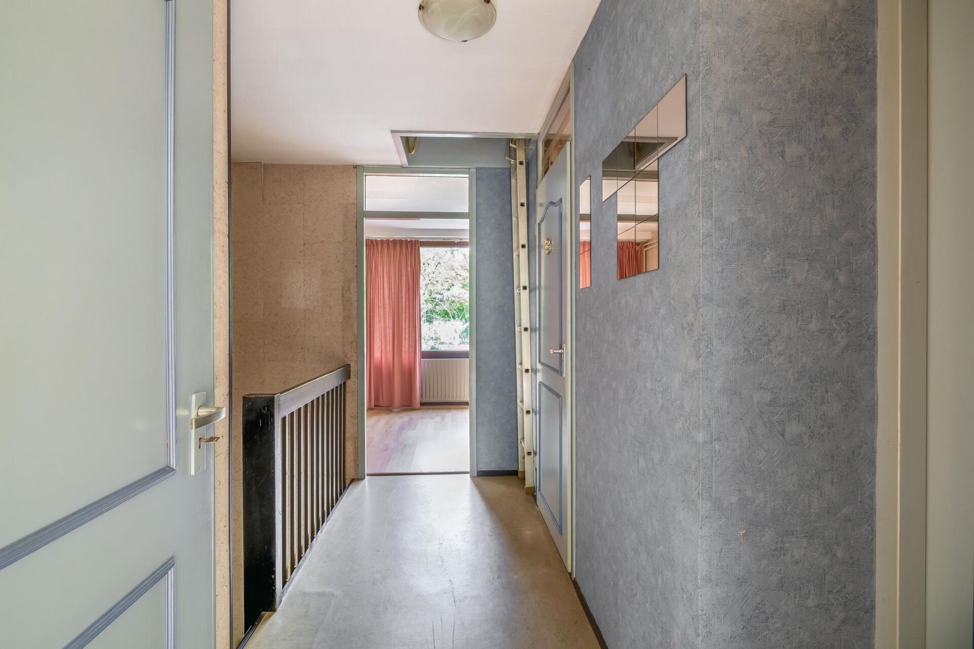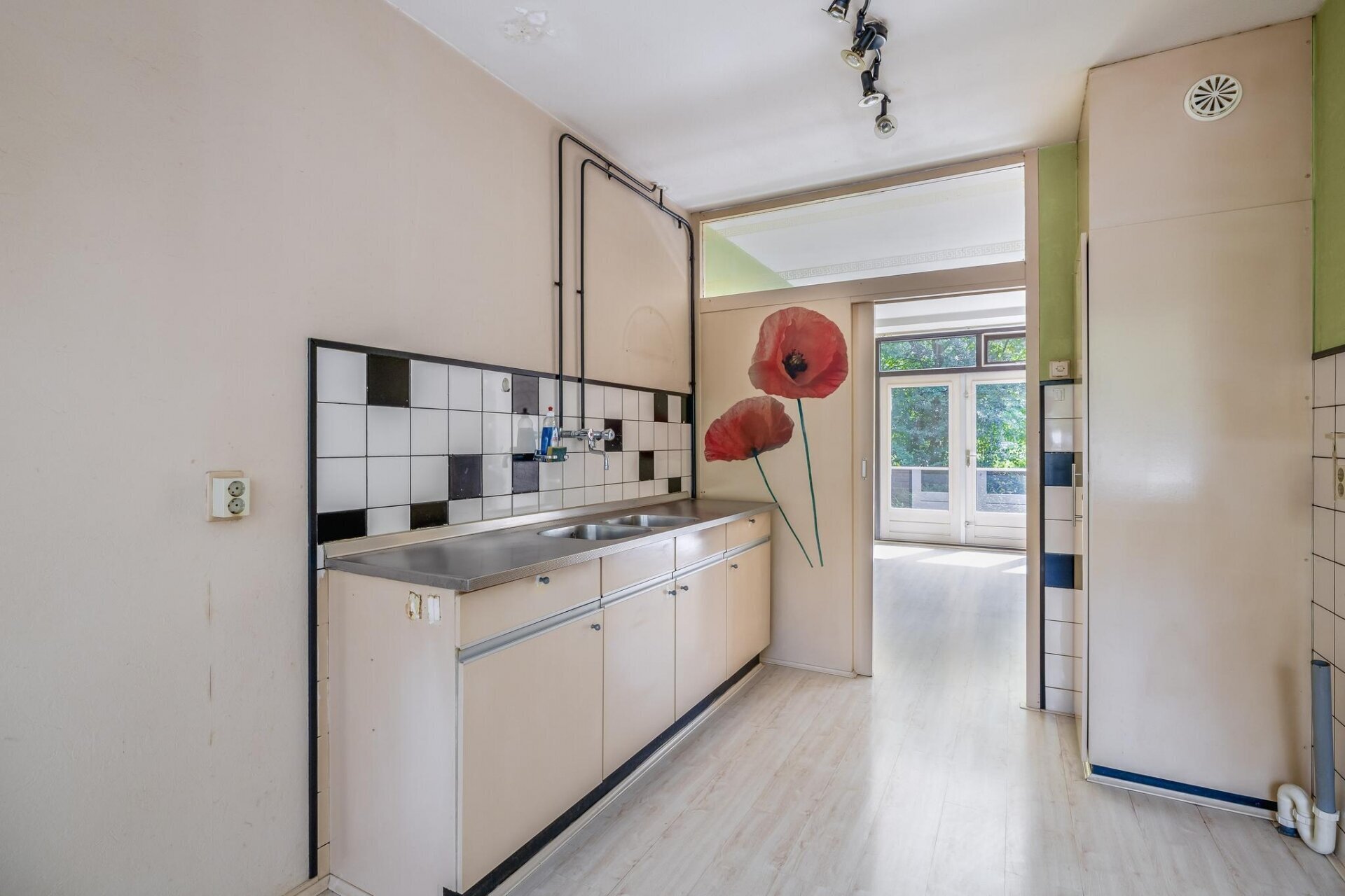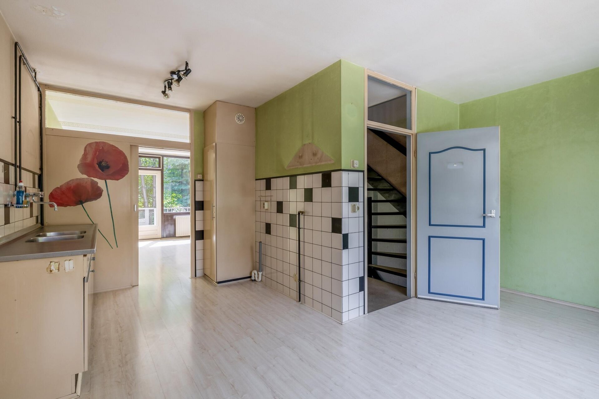 Op de eerste verdieping vind je de woonkamer aan de achterzijde, met grote raampartijen en openslaande deuren naar het balkon van ca. 7 m2 op het zuiden. Je kijkt hier uit op het groen achter de woning, wat zorgt voor een heerlijk vrij gevoel. De keuken bevindt zich aan de voorzijde en is eenvoudig uitgevoerd, maar biedt alle ruimte om te moderniseren tot een eigentijdse woonkeuken van 20m2. Dankzij de gunstige zonligging is dit een heerlijke plek om binnen én buiten te genieten. De achtertuin is circa 60 m2 groot en door de diepte en ligging op het zuiden een fijne plek voor zonaanbidders en tuinliefhebbers.