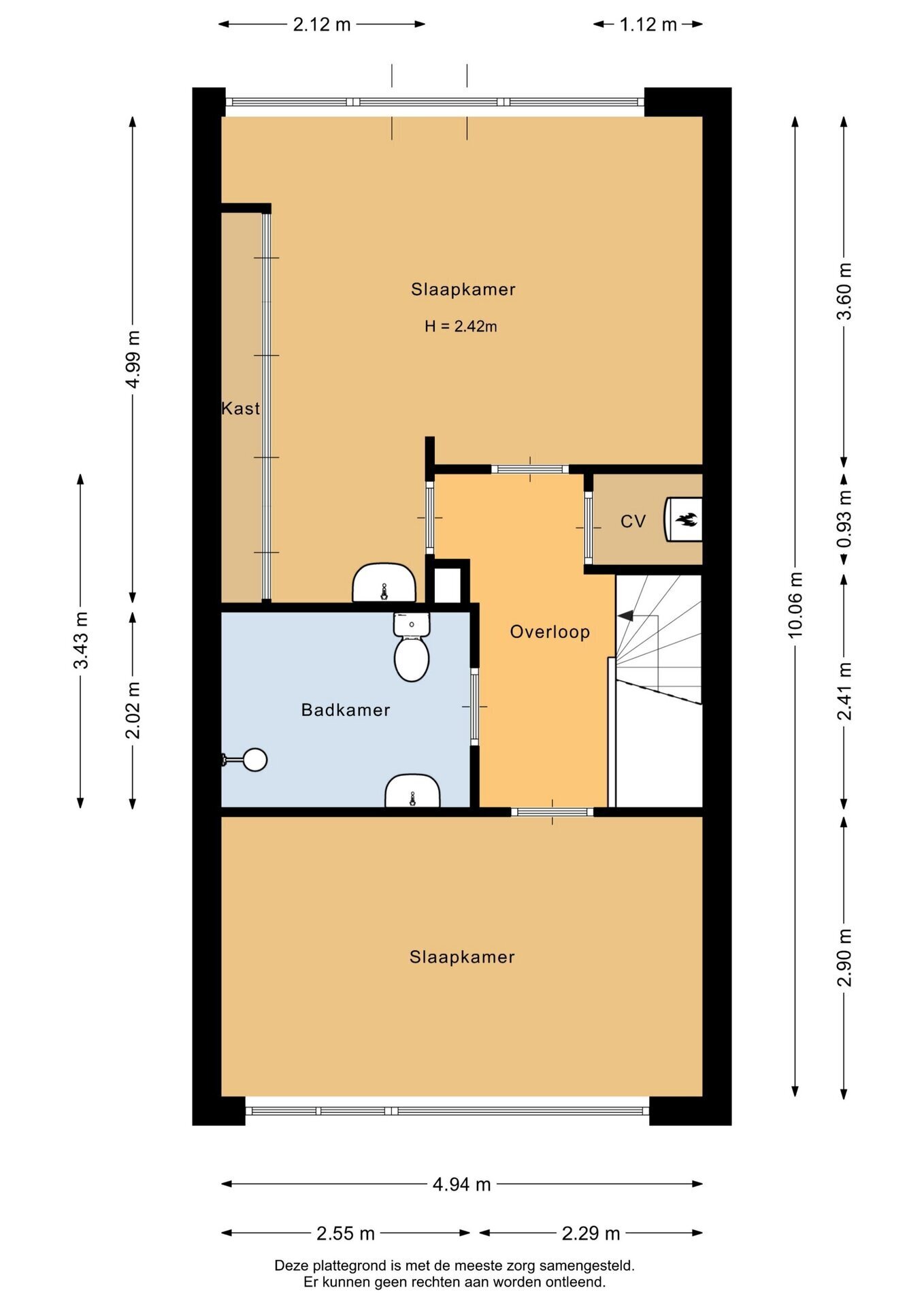 Op de tweede verdieping zijn twee royale slaapkamers gesitueerd, voorheen waren dit drie slaapkamers en dit is eenvoudig weer in oorspronkelijk staat terug te brengen. De badkamer is functioneel ingedeeld met douche, toilet en wastafel, en biedt mogelijkheden voor modernisering. De slaapkamers zijn voorzien van grote ramen, wat zorgt voor veel daglicht en een prettige sfeer. Ook vind je hier een aparte ruimte met de opstelplaats voor de cv-ketel.