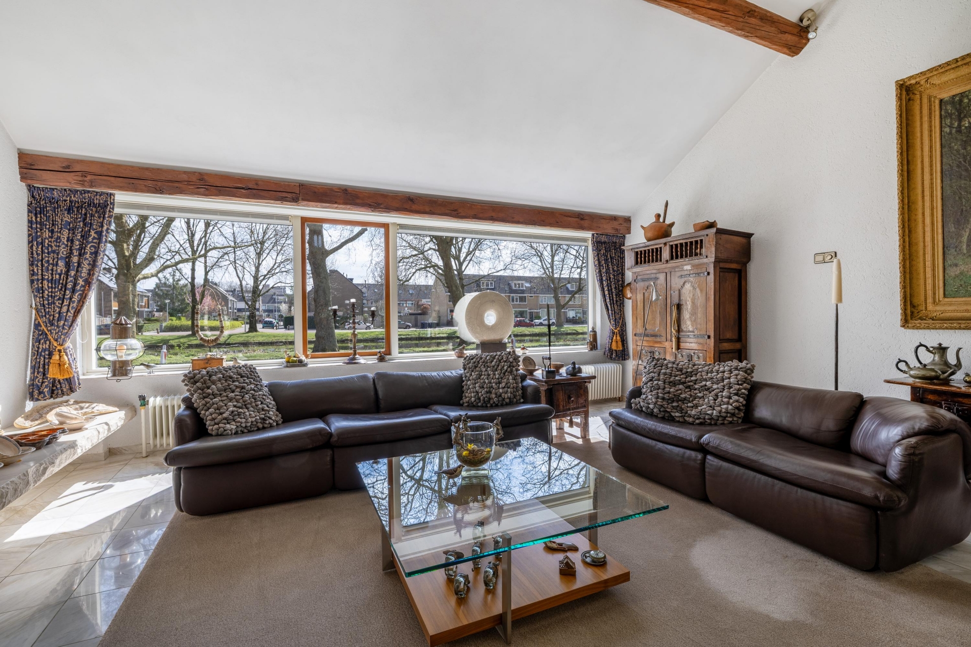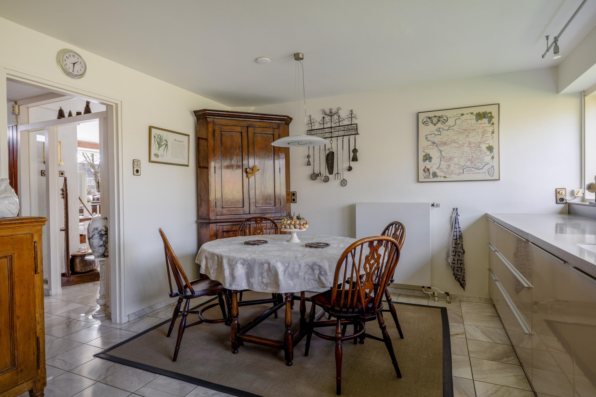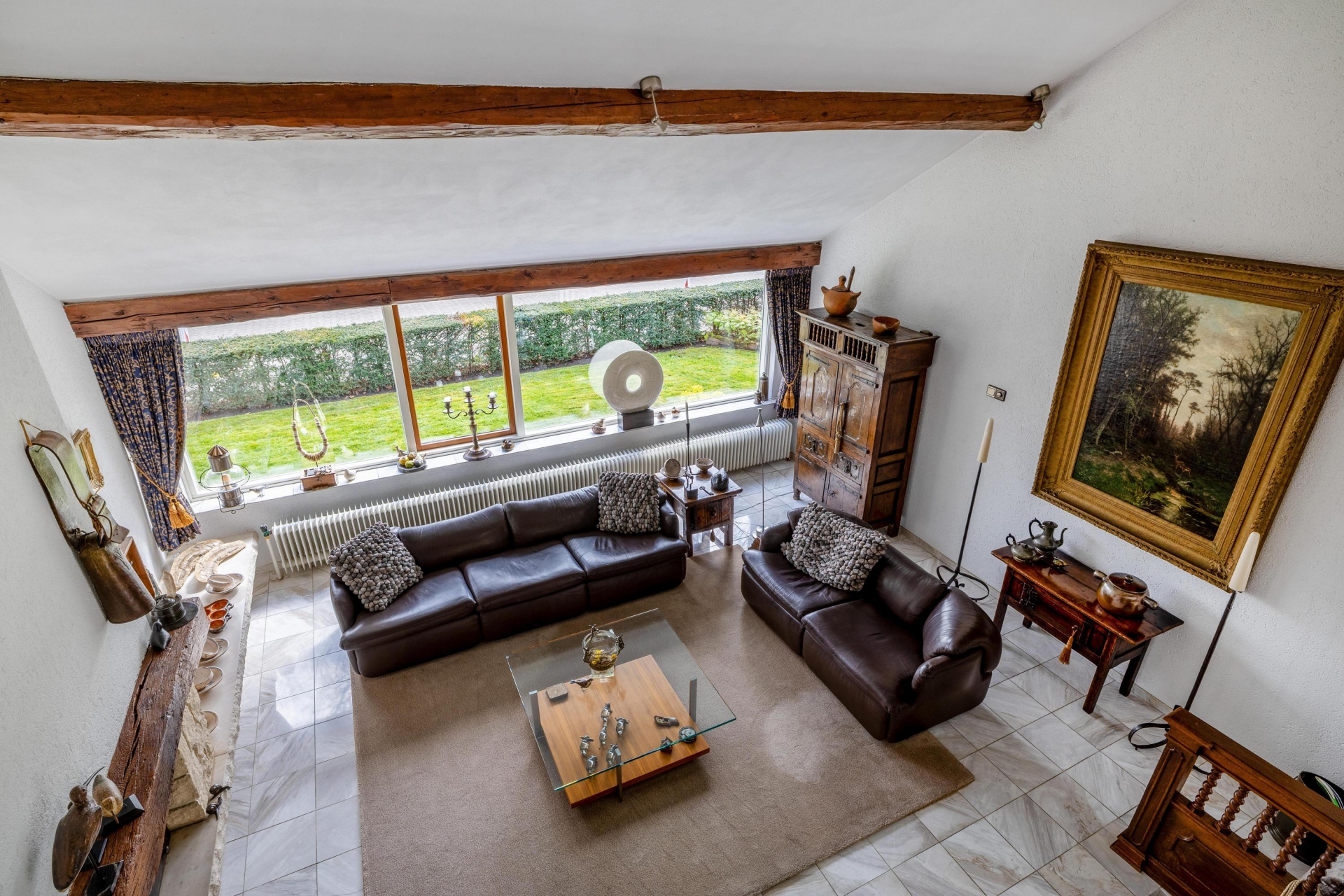 De grote raampartijen trekken het groen als het ware naar binnen en zorgen voor een prachtige lichtinval gedurende de dag. Vanuit de zithoek heb je een vrij uitzicht naar buiten, wat het gevoel van ruimte nog eens versterkt. De haard vormt een sfeervol middelpunt en maakt deze ruimte compleet.