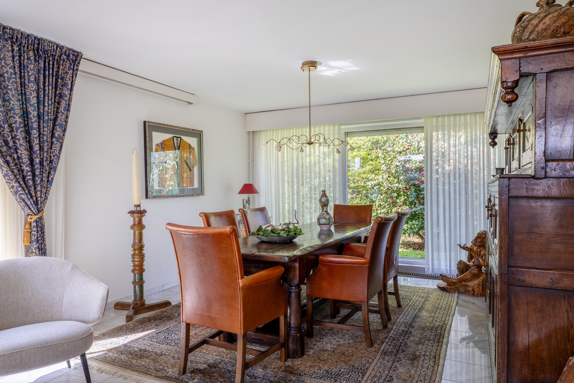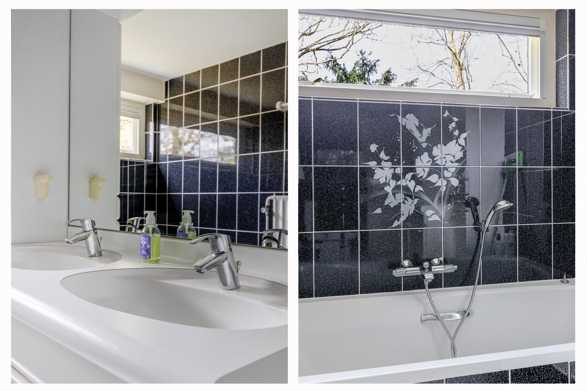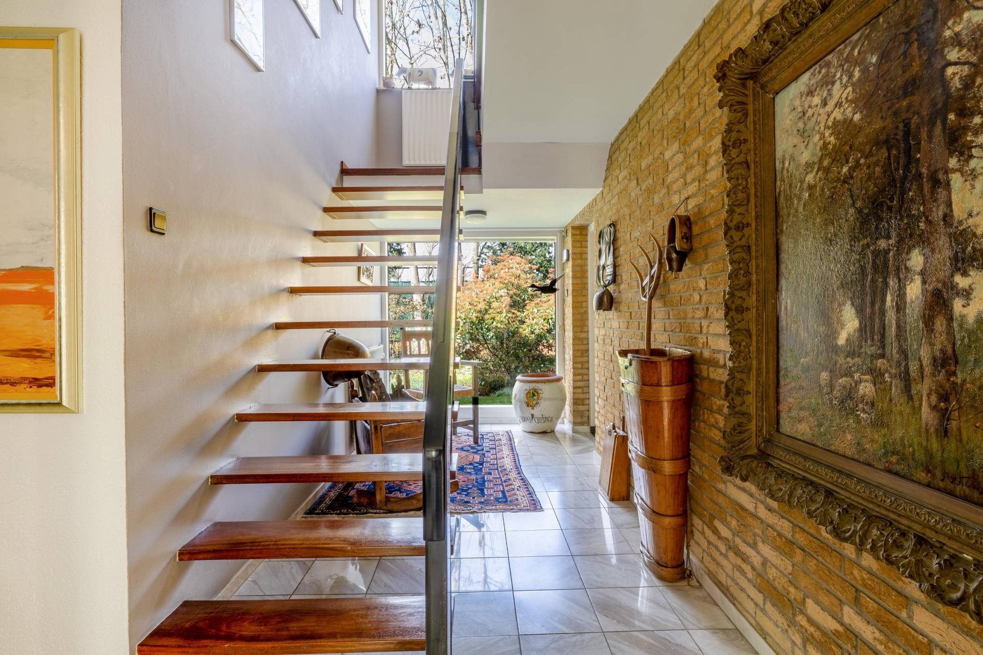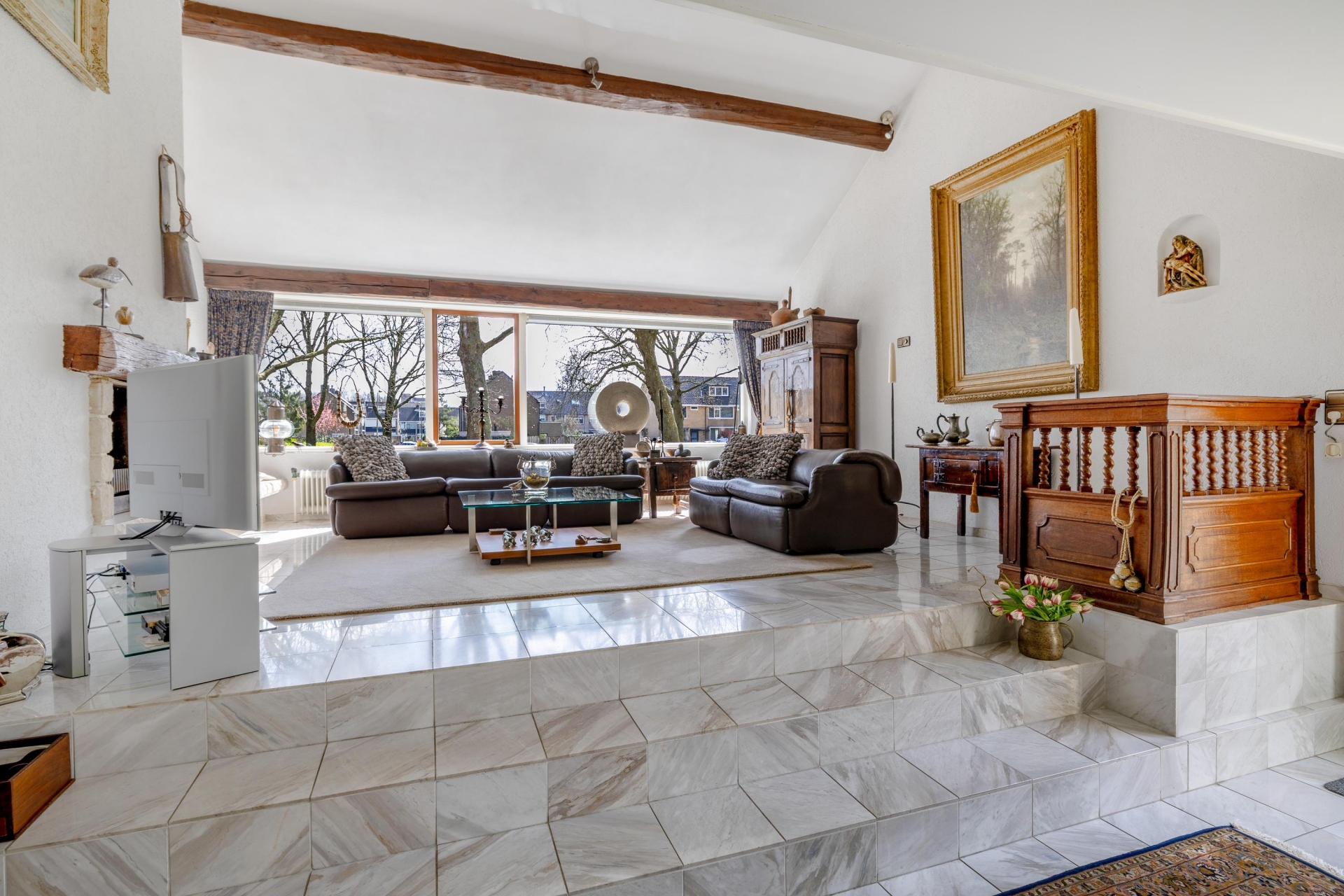 De grote raampartijen trekken het groen als het ware naar binnen en zorgen voor een prachtige lichtinval gedurende de dag. Vanuit de zithoek heb je een vrij uitzicht naar buiten, wat het gevoel van ruimte nog eens versterkt. De haard vormt een sfeervol middelpunt en maakt deze ruimte compleet.