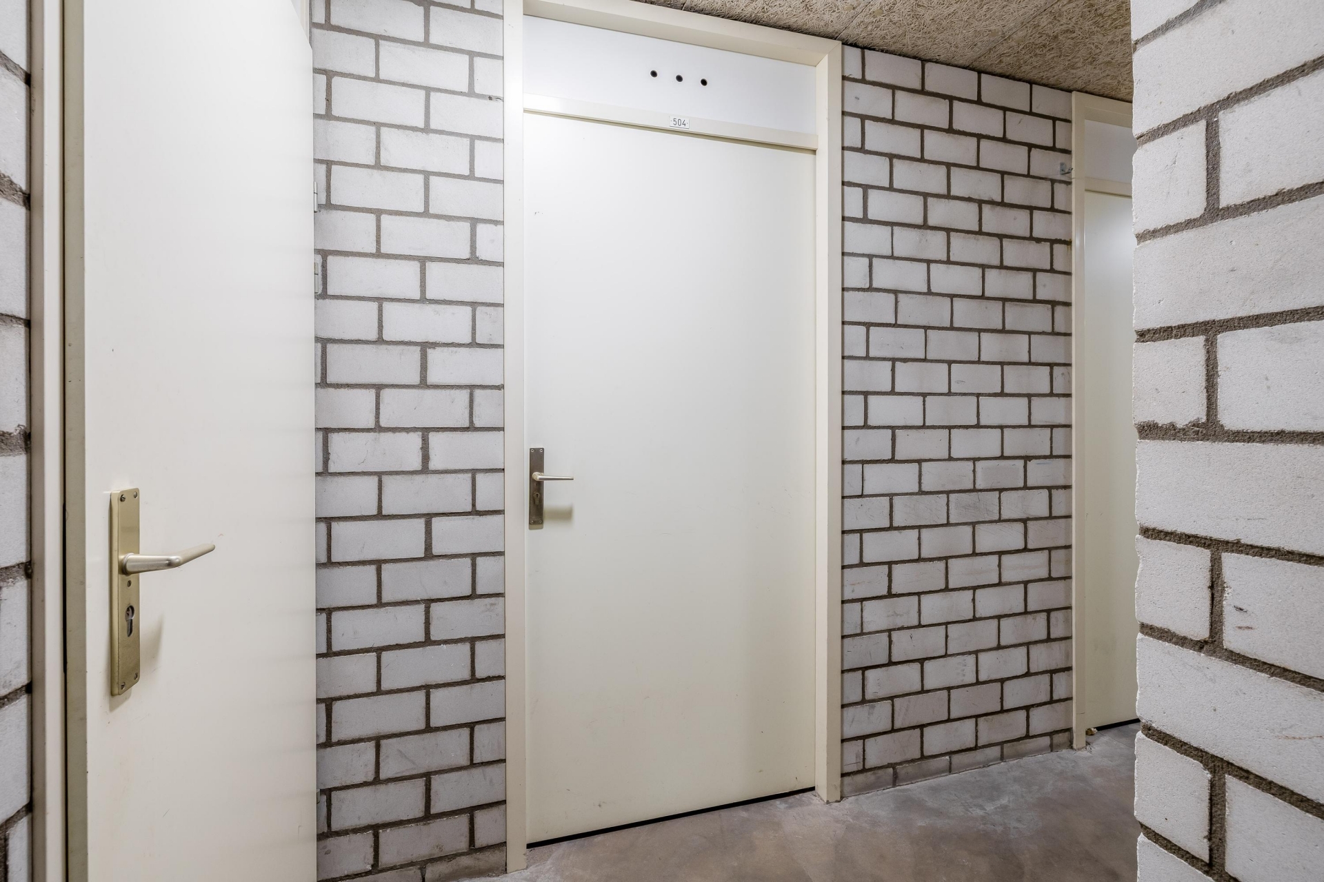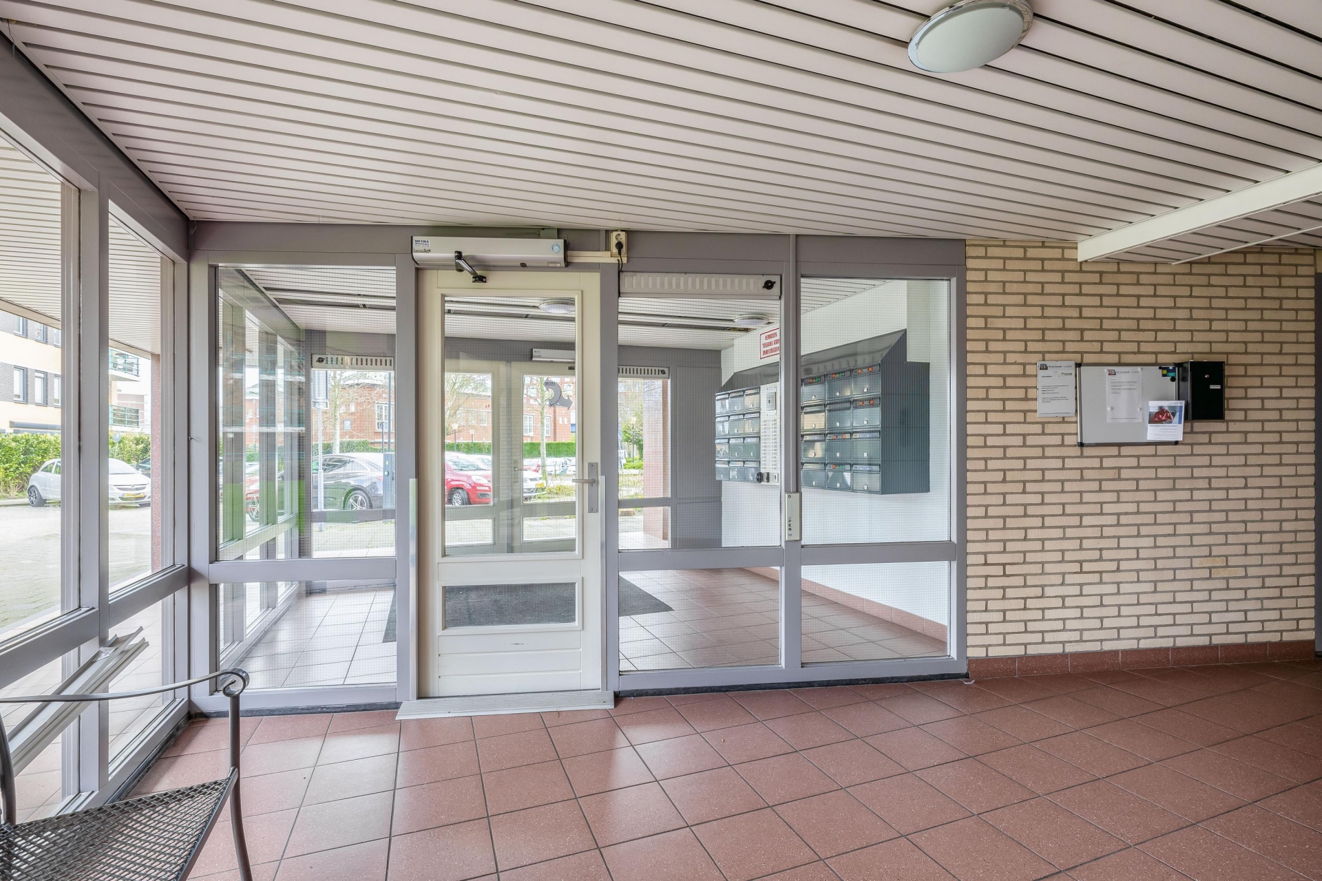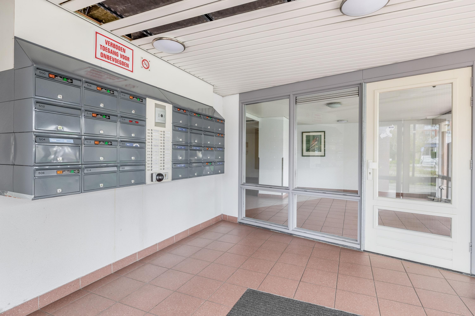 Afgesloten entree met bellentableau, brievenbussen, trappenhuis en liftinstallatie.