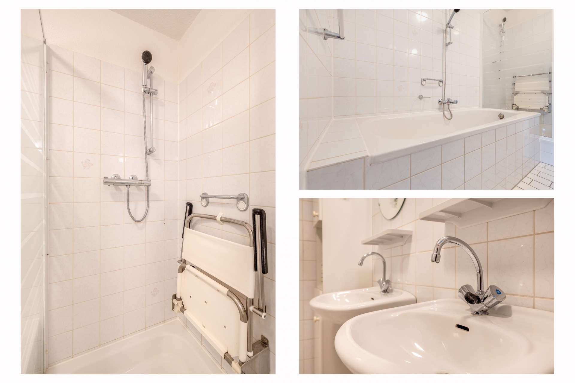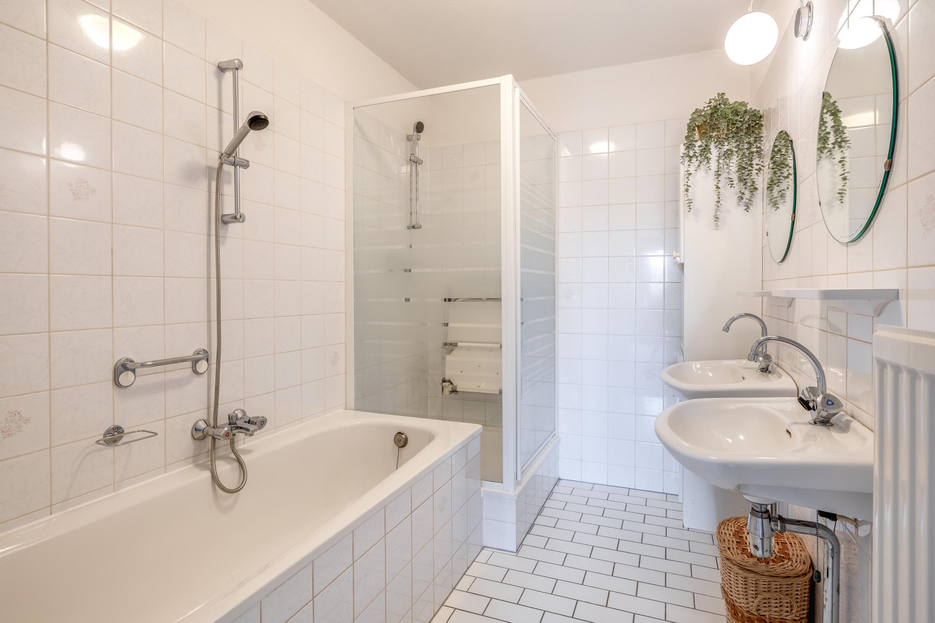 De badkamer is voorzien van een douchecabine, dubbele wastafel en een ligbad. Separaat is er een toilet aanwezig.