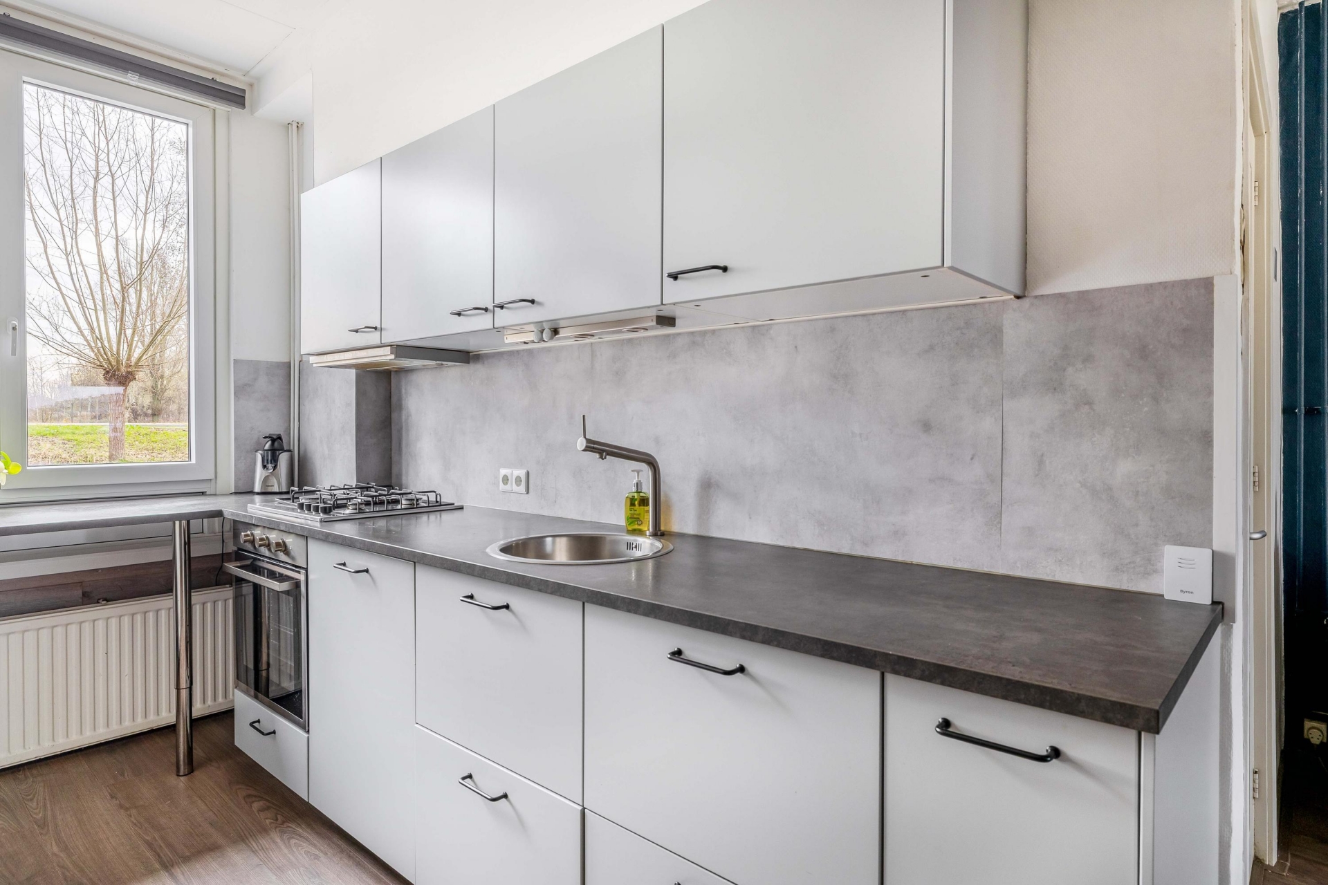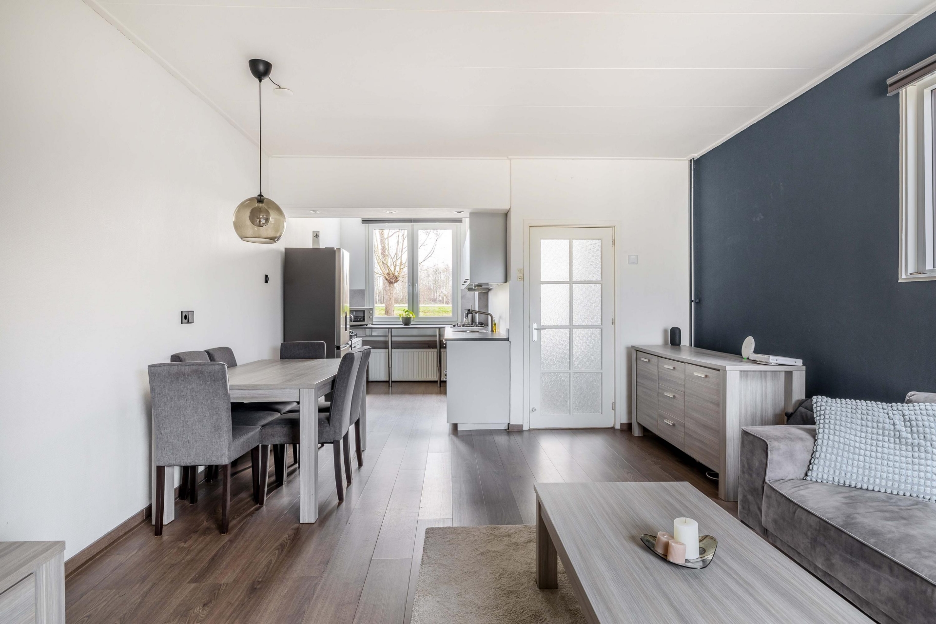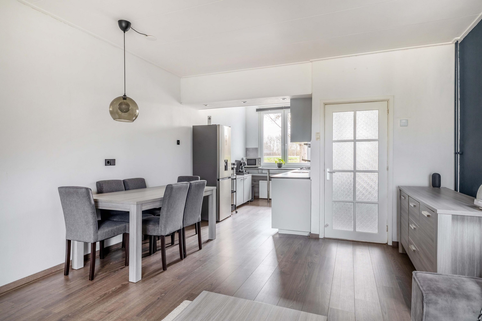 De woonkamer is licht en sfeervol, met voldoende ruimte voor een zit- én eethoek. Vanuit de open keuken kijk je vrij weg aan de voorzijde, de moderne keuken is strak en neutraal uitgevoerd, praktisch ingericht gelegen aan de voorzijde. Dankzij het raam boven het aanrecht werk je altijd met daglicht. De vloeren zijn keurig afgewerkt en het geheel is fris, netjes en verzorgd: je kunt hier zó intrekken. Aan de achterzijde is toegang tot de praktische bijkeuken alwaar de aansluiting voor de wasmachine en droger en tevens toegang tot de aangebouwde praktische berging.