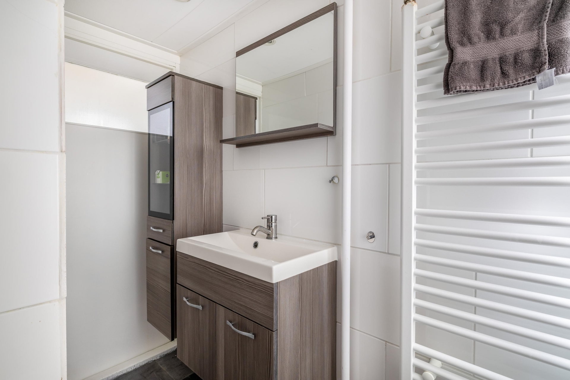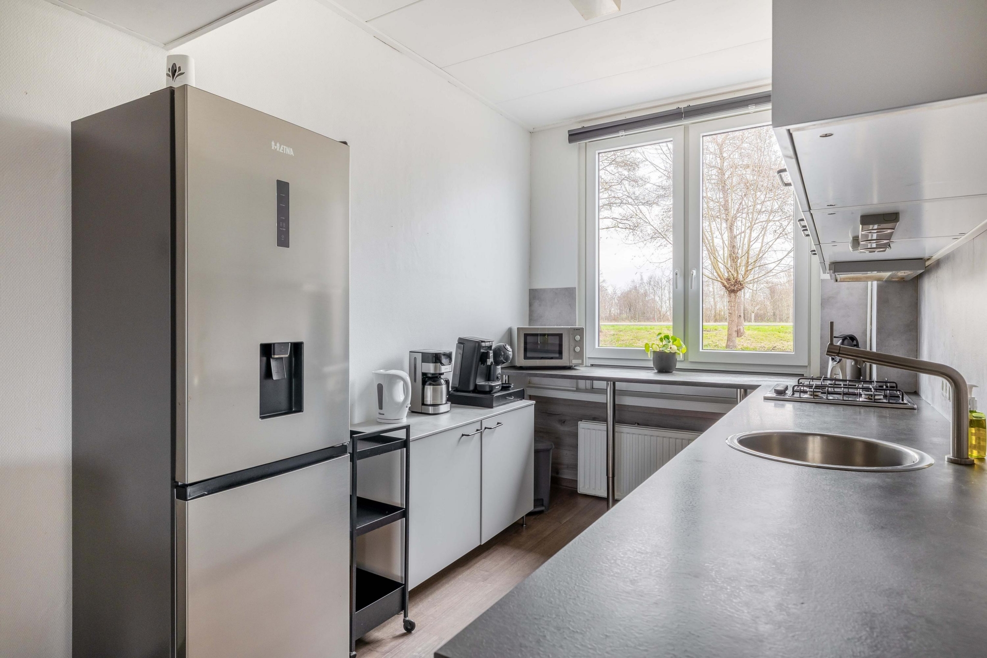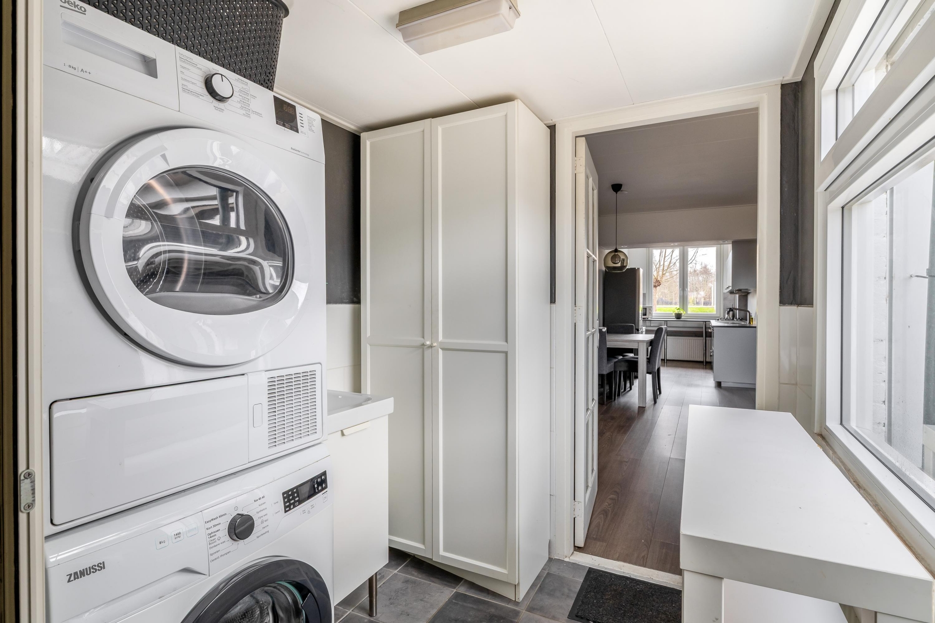 De woonkamer is licht en sfeervol, met voldoende ruimte voor een zit- én eethoek. Vanuit de open keuken kijk je vrij weg aan de voorzijde, de moderne keuken is strak en neutraal uitgevoerd, praktisch ingericht gelegen aan de voorzijde. Dankzij het raam boven het aanrecht werk je altijd met daglicht. De vloeren zijn keurig afgewerkt en het geheel is fris, netjes en verzorgd: je kunt hier zó intrekken. Aan de achterzijde is toegang tot de praktische bijkeuken alwaar de aansluiting voor de wasmachine en droger en tevens toegang tot de aangebouwde praktische berging.