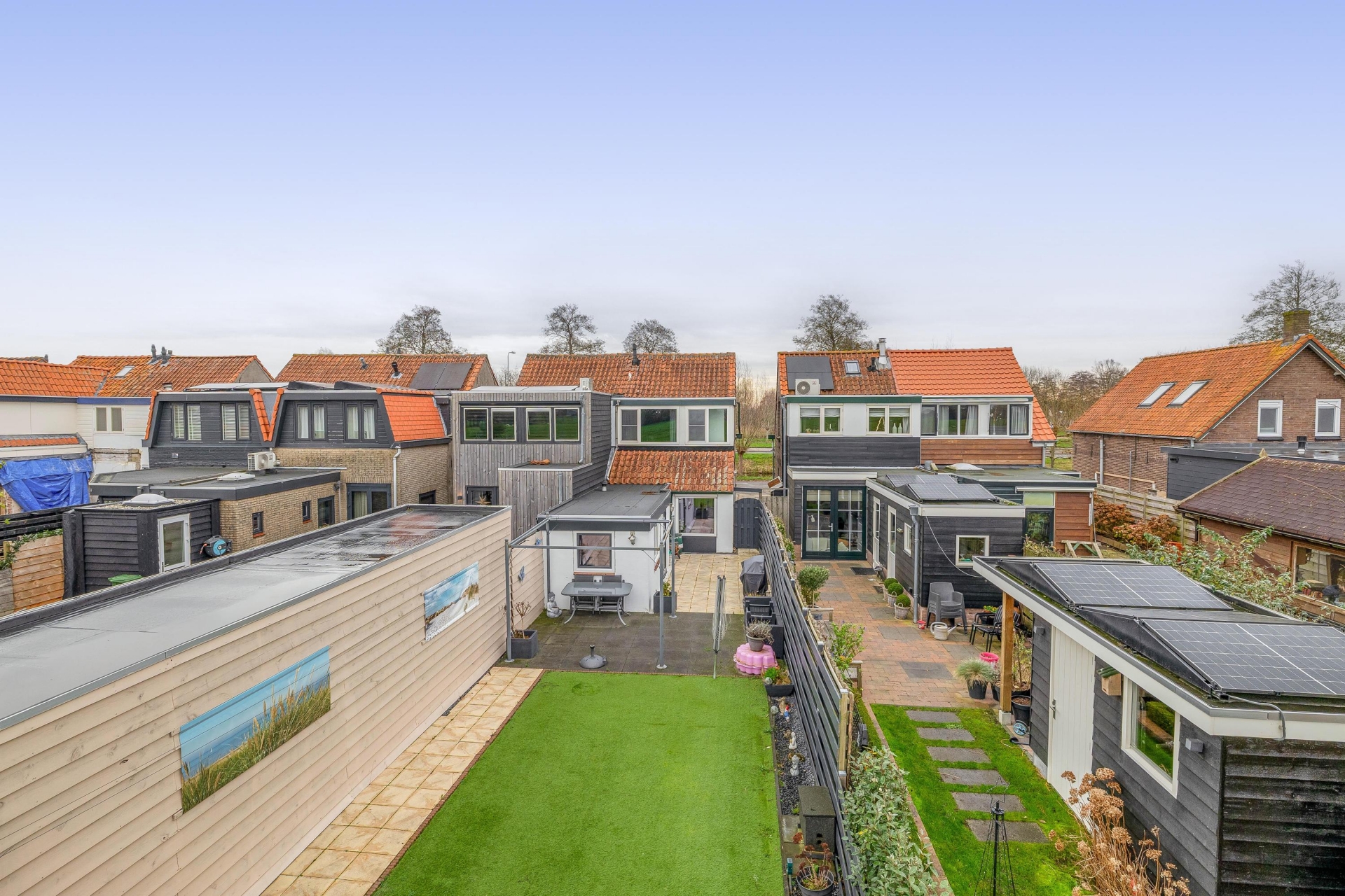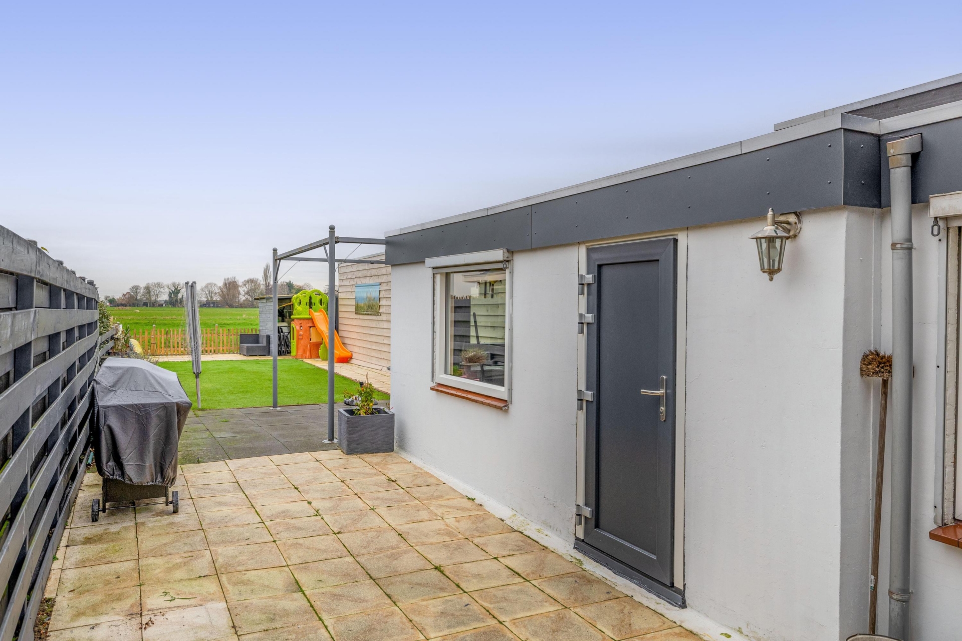 De achtertuin is misschien wel het grootste pluspunt van dit huis. Door de ligging aan de weilanden heb je hier geen directe achterburen, wat zorgt voor veel privacy en een vrij gevoel. De tuin is onderhoudsvriendelijk ingericht met een terras en een fijne zitplek in de zon. De ligging op het westen betekent dat je hier vanaf de middag tot in de avond kunt genieten van de zon – perfect voor een barbecue of een borrel na het werk.