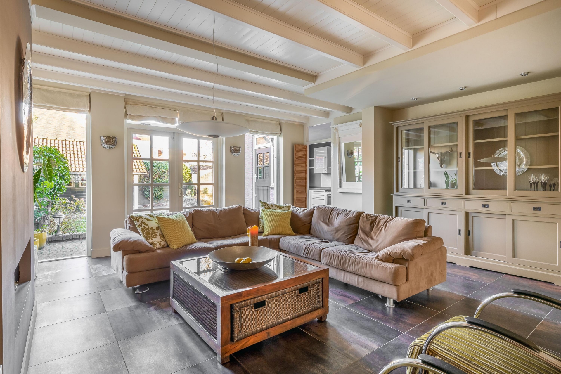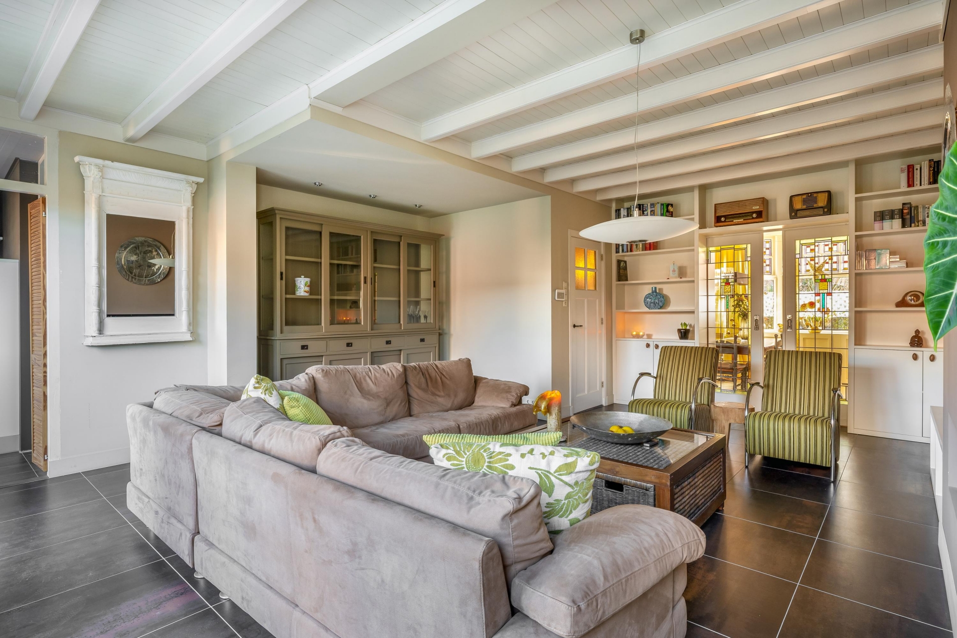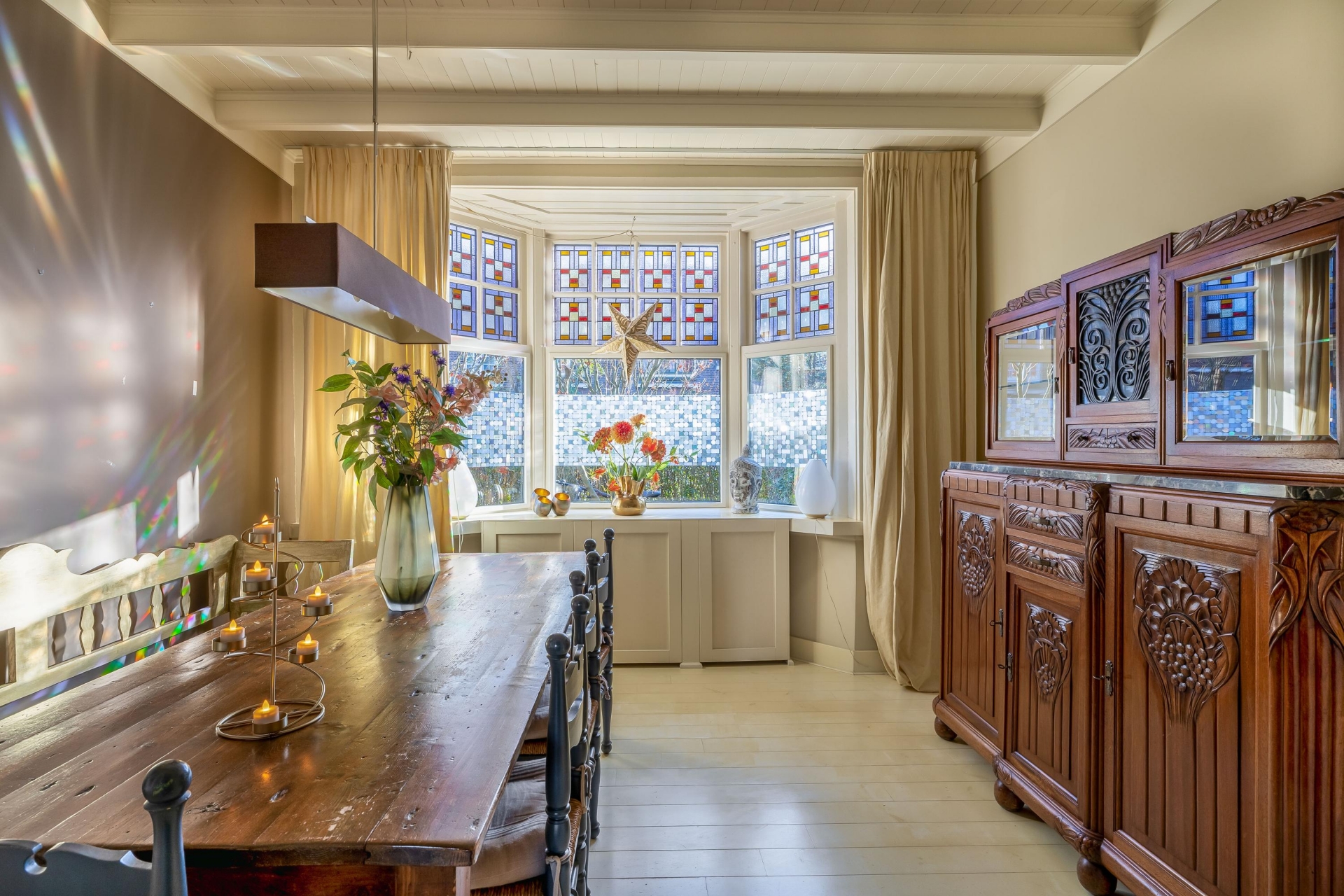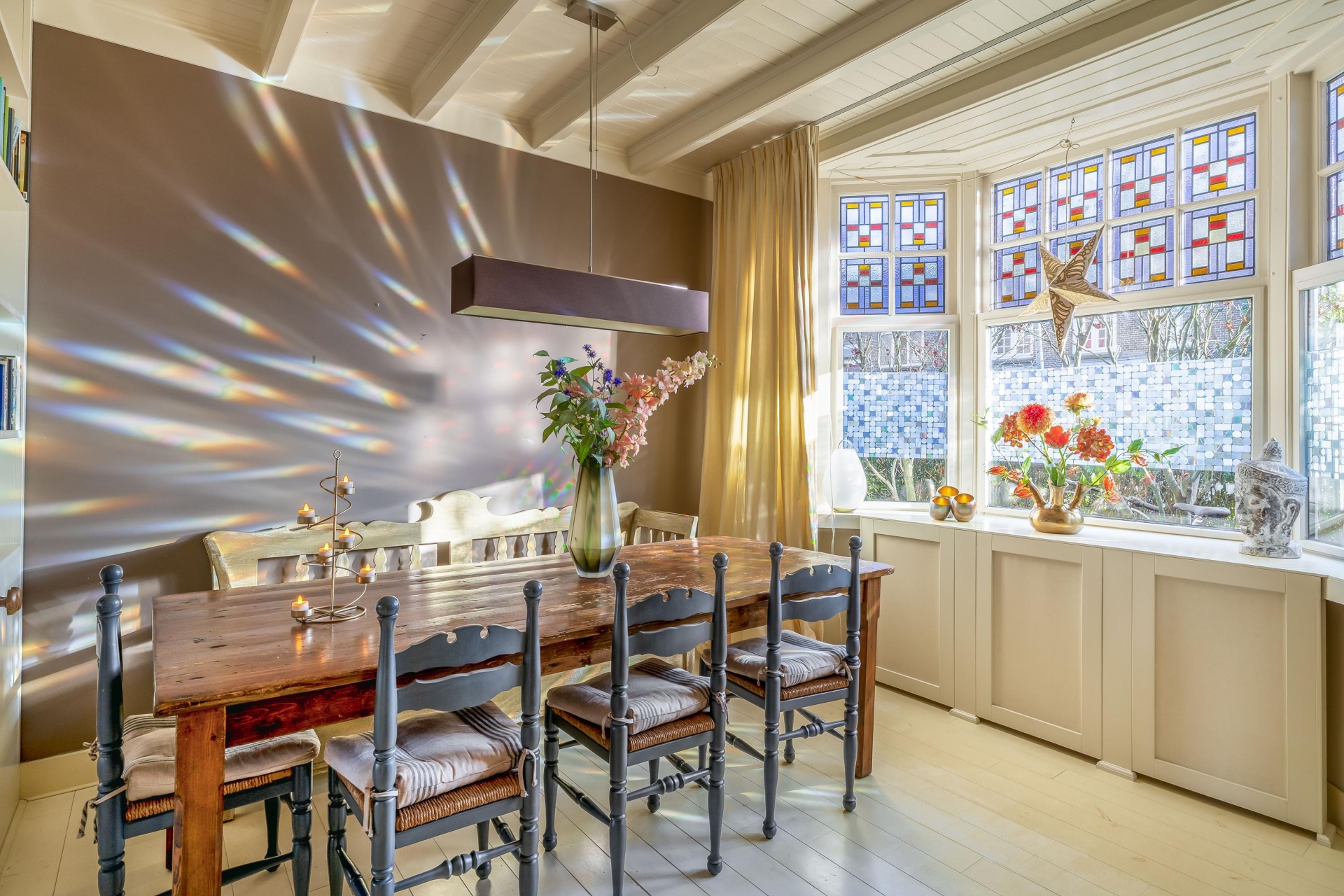 De sfeer in huis is direct voelbaar zodra je binnenstapt. De woonkamer is uitgebouwd en voelt dankzij de zichtbare balken, openslaande deuren, strak afgewerkte wanden en de combinatie van authentieke details en moderne afwerking, warm en uitnodigend aan. De eetkamer aan de voorzijde heeft een charmante erker met glas-in-loodramen; een fijne plek voor lange diners of een goed boek in de zon.