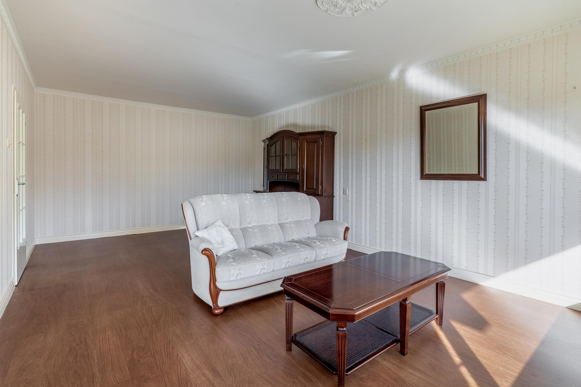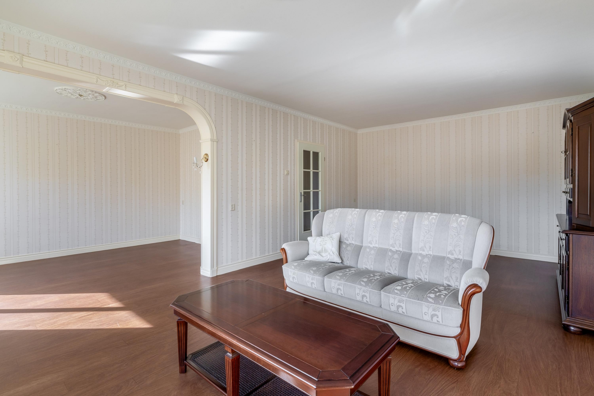 De woonkamer heeft een L-vorm en biedt volop ruimte voor zowel een zit- als eethoek. Grote raampartijen zorgen voor veel daglicht en versterken het gevoel van ruimte.