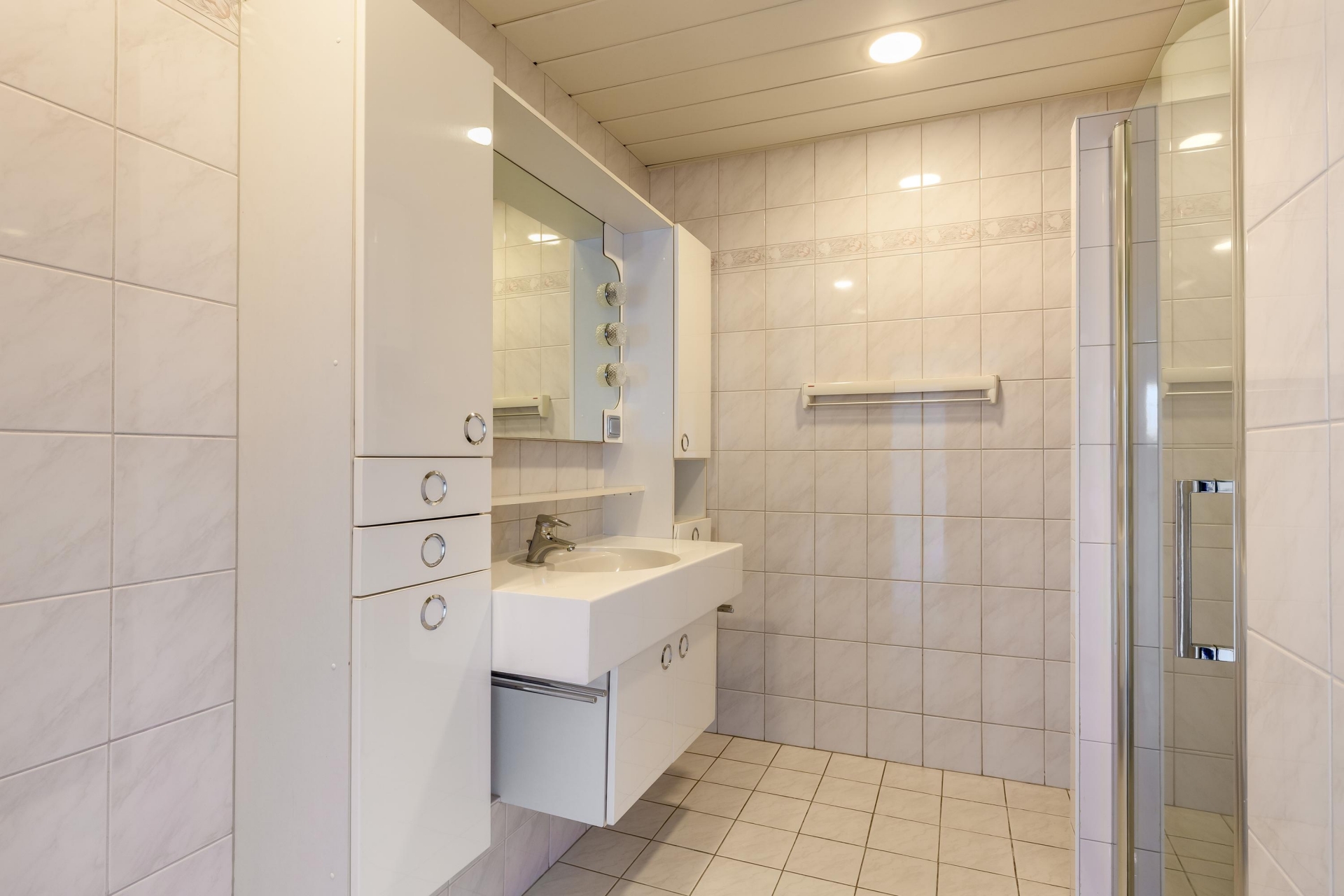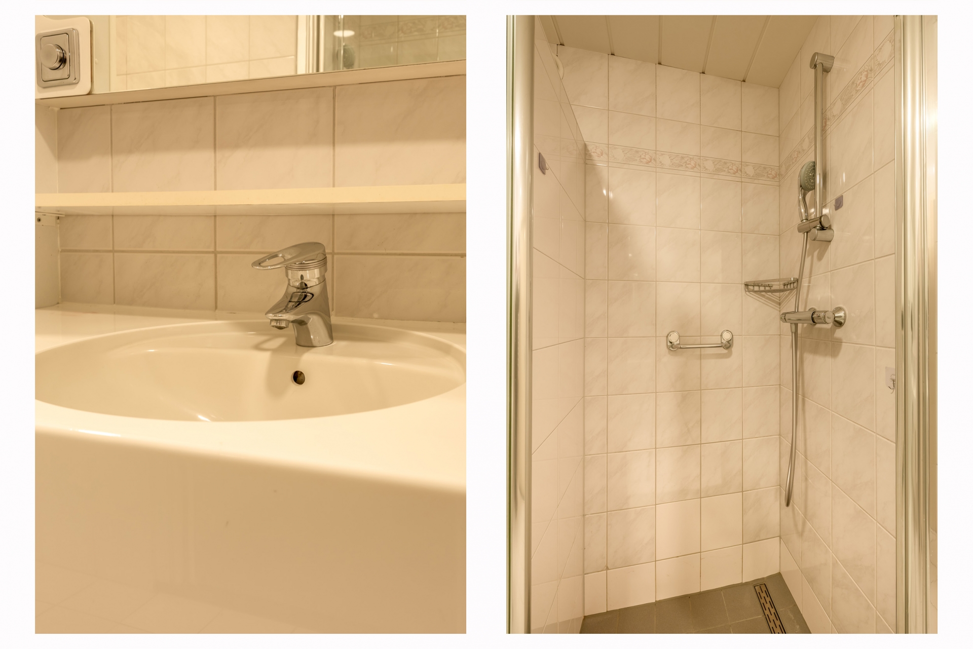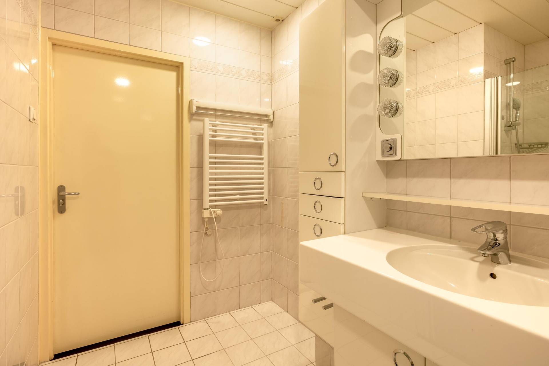 De badkamer is compleet ingericht met een douche, een brede wastafel met spiegel en een aansluiting voor de wasmachine. Daarnaast is er een huurboiler aanwezig, elektrische verwarming en mechanische ventilatie.