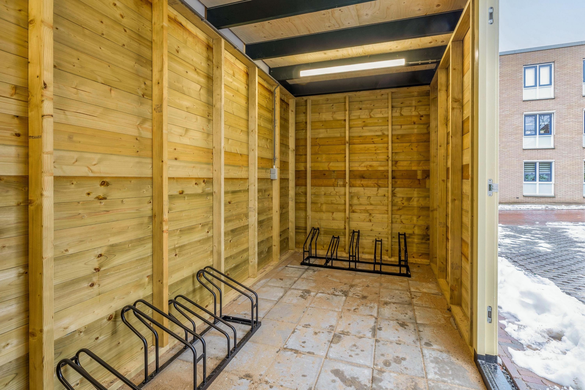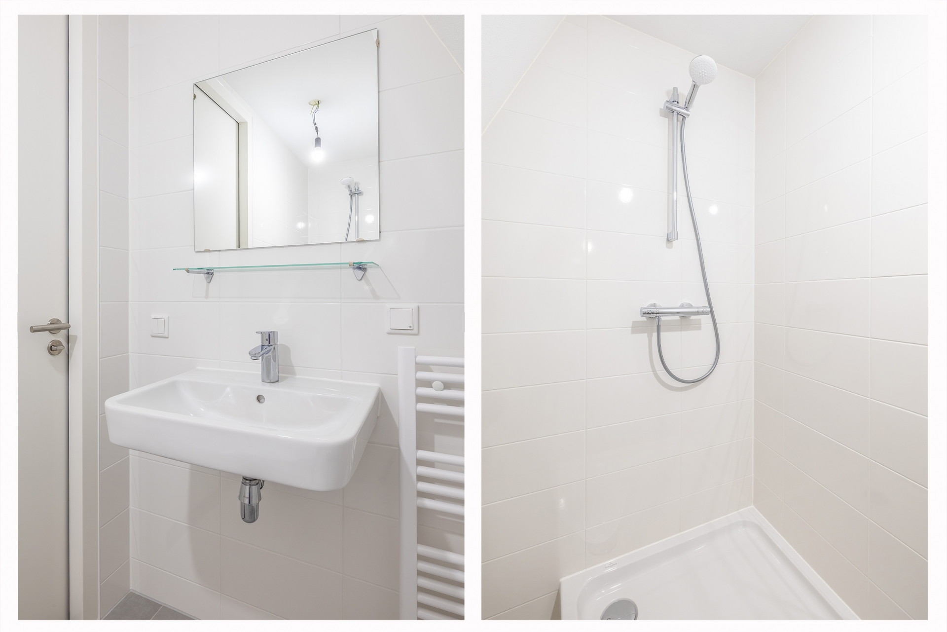 De slaapkamer biedt voldoende plek voor een tweepersoonsbed en kastruimte. De badkamer is modern afgewerkt en voorzien van een inloopdouche, wastafel en aansluiting voor de wasmachine. Een apart toilet maakt het geheel compleet.