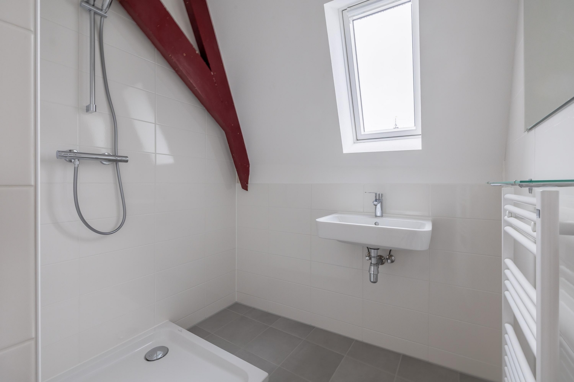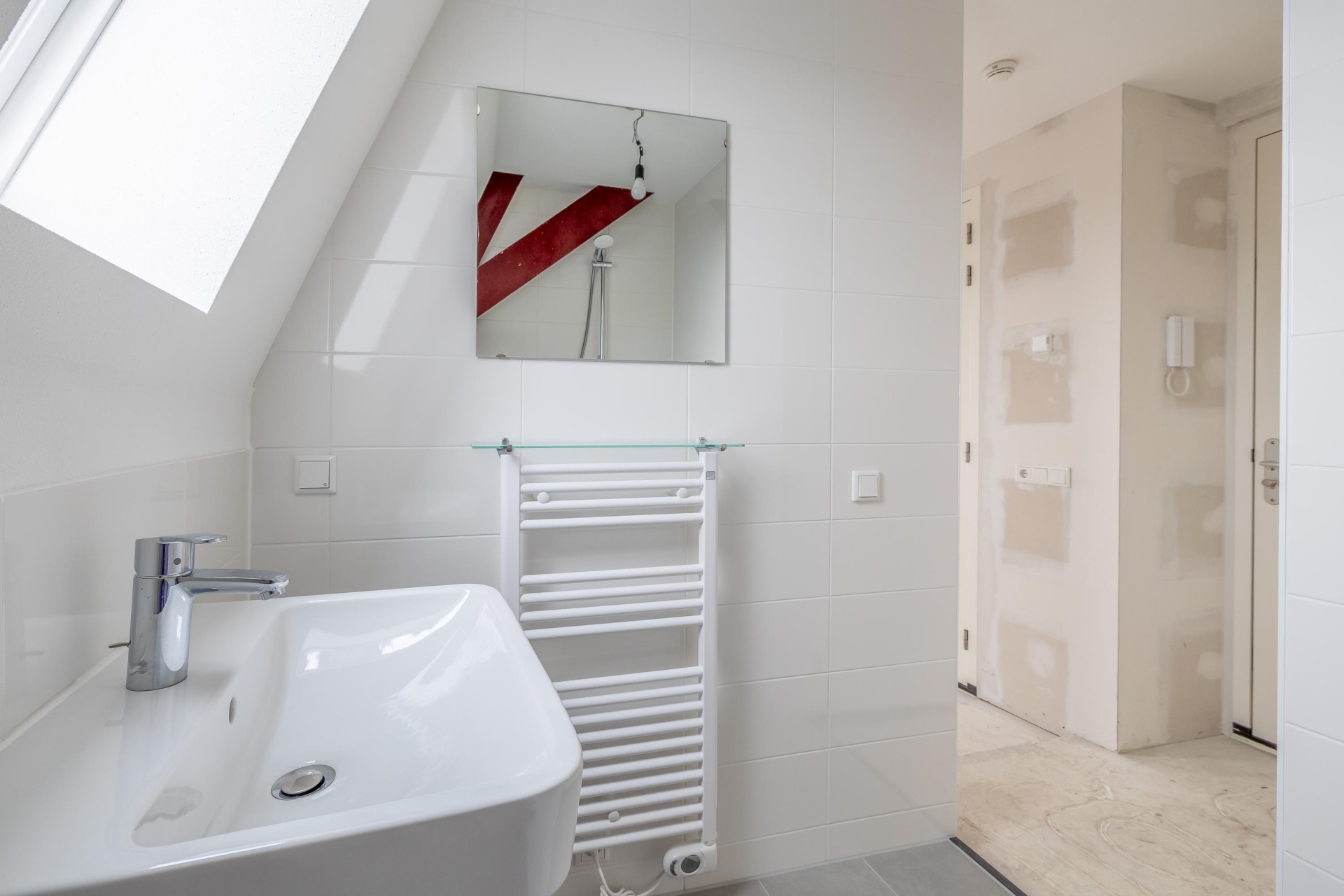 De badkamer is modern en strak afgewerkt met douche, wastafel en toilet. De keuken is nog niet geplaatst, maar de aansluitingen zijn al aanwezig. Je kunt dus zelf kiezen wat het beste bij je past. De wanden zijn behangklaar afgewerkt, waardoor je snel jouw eigen stijl kunt doorvoeren.