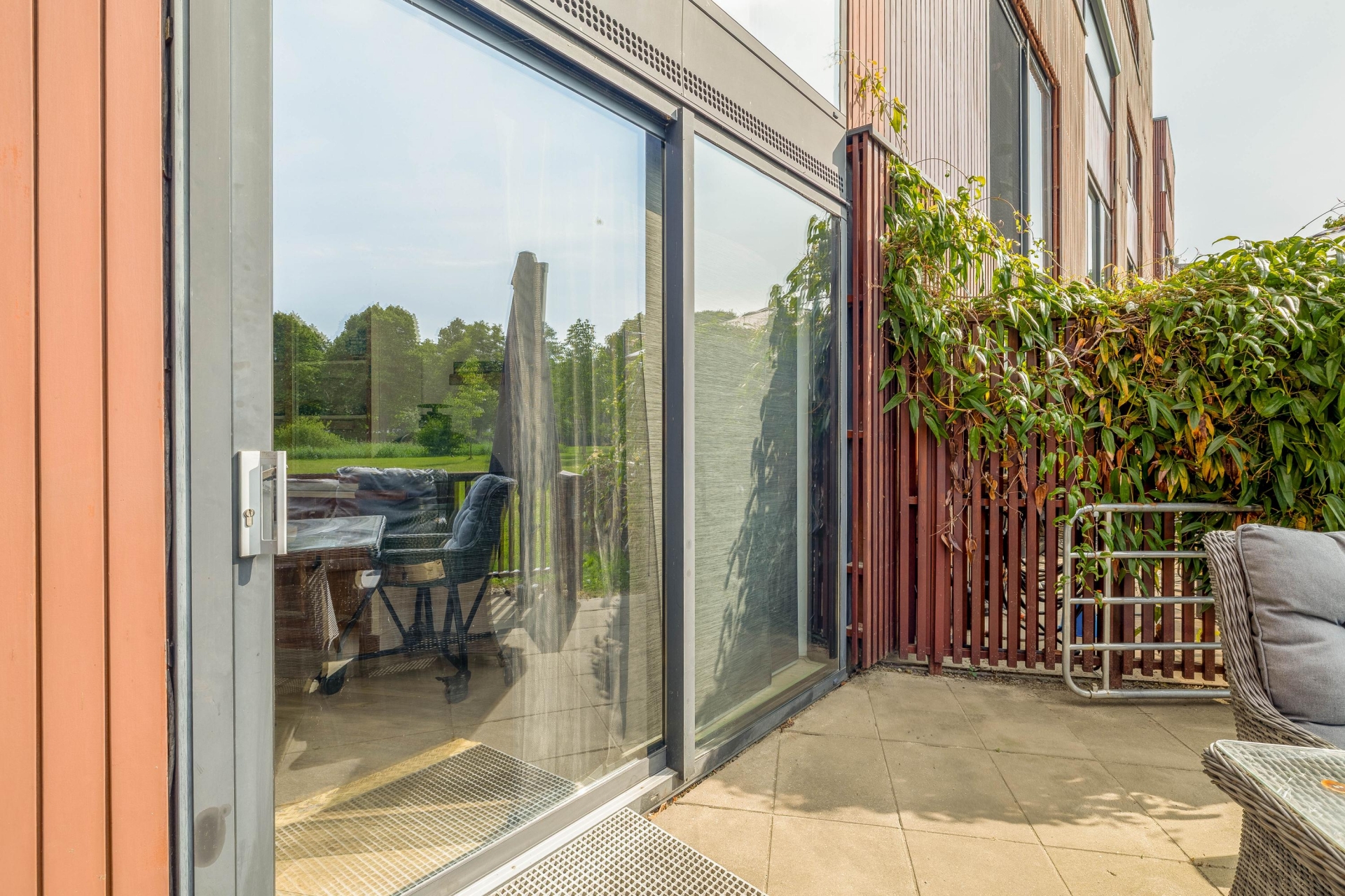 Via de eigen entree kom je binnen in een ruim opgezette hal van 12 m². Hier vind je toegang tot de inpandige berging (3.10 x 2.00 m), het luxe toilet, en de royale woonkeuken aan de achterzijde. De keuken is uitgevoerd met een complete inbouwkeuken van het merk BAUKNECHT, en biedt alles wat je nodig hebt: veel werkruimte, moderne apparatuur en directe toegang via een schuifpui naar het terras van ca. 18 m² (4.50 x 4.00 m). Dit terras grenst direct aan het park en is daarmee een verlengstuk van je leefruimte – ideaal voor ontbijt in de ochtendzon of een borrel met uitzicht.