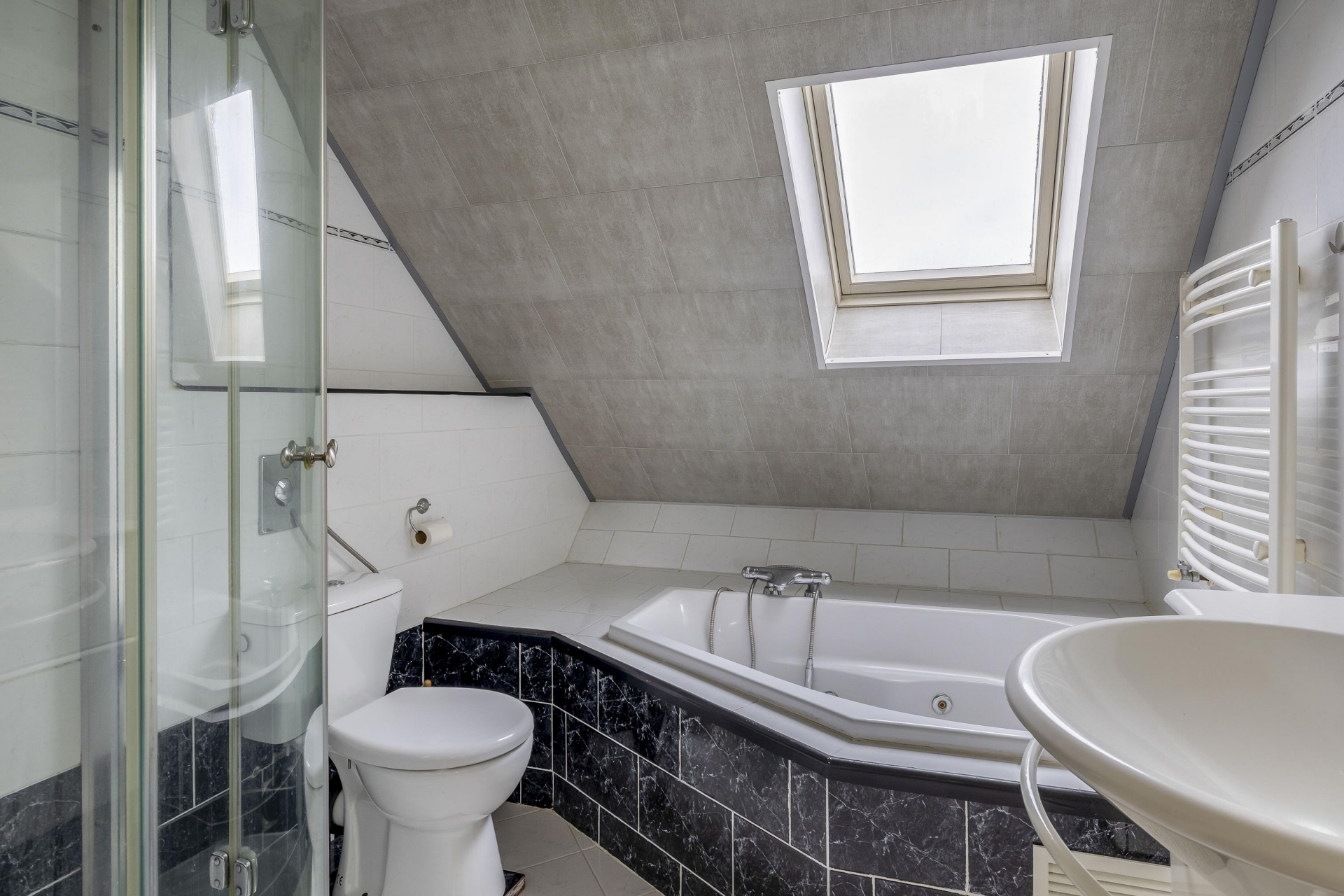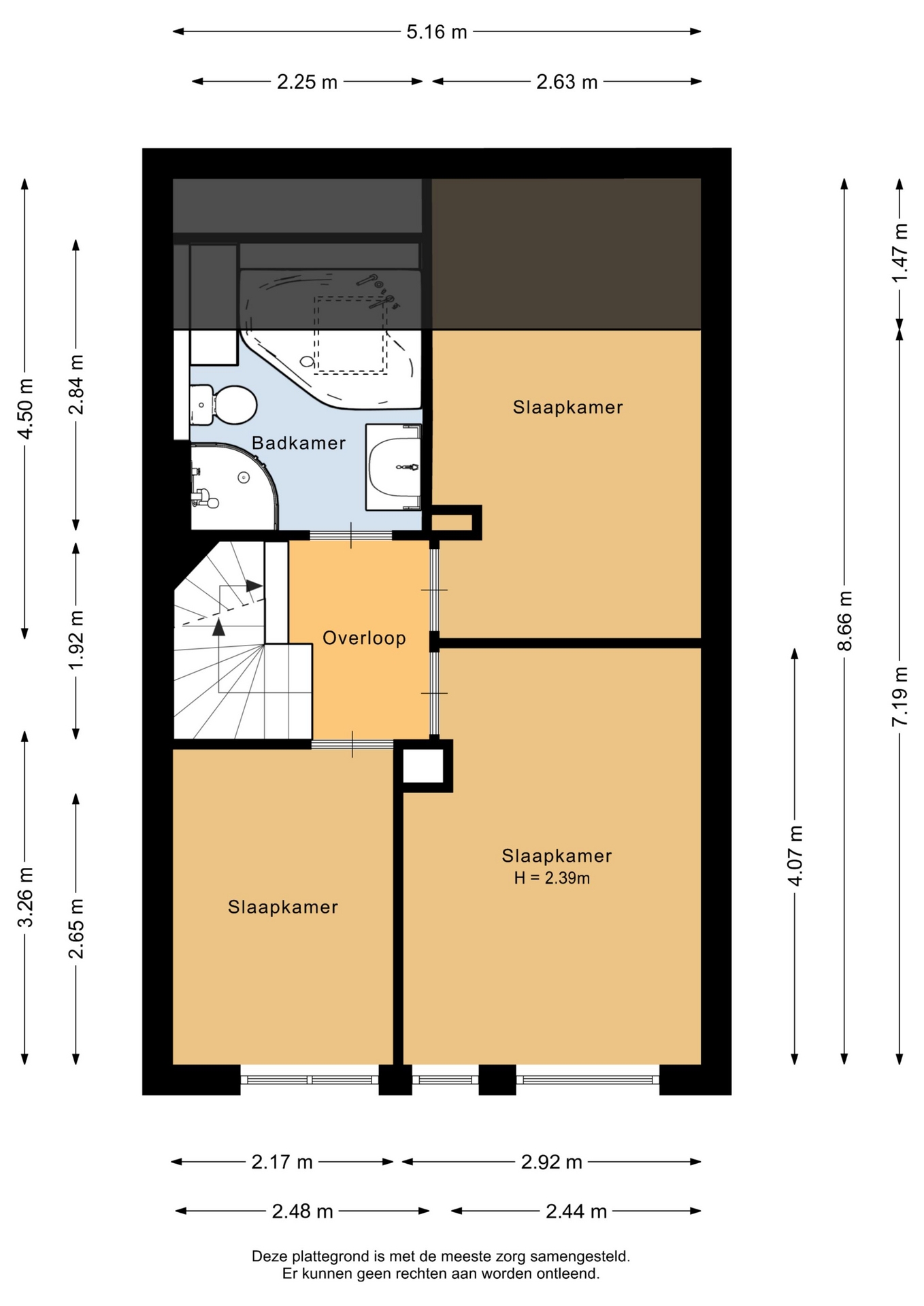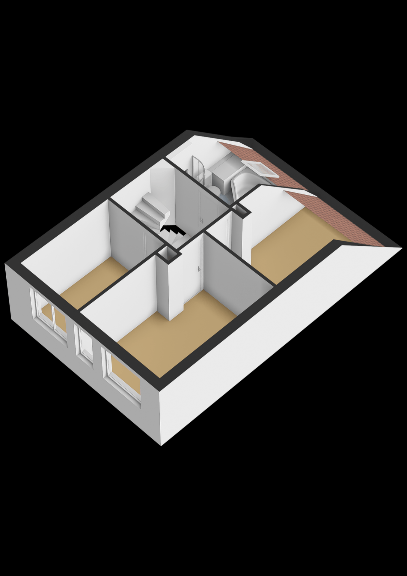 Vanuit de overloop zijn de 3 slaapkamers en badkamer bereikbaar. De 2 slaapkamers aan de voorzijde zijn ca. 5 m² en 12 m². Aan de achterzijde is de slaapkamer ca. 9 m² waarbij een dakraam is. De naastgelegen badkamer is volledig betegeld en voorzien van douche, ligbad, toilet en wastafelmeubel.