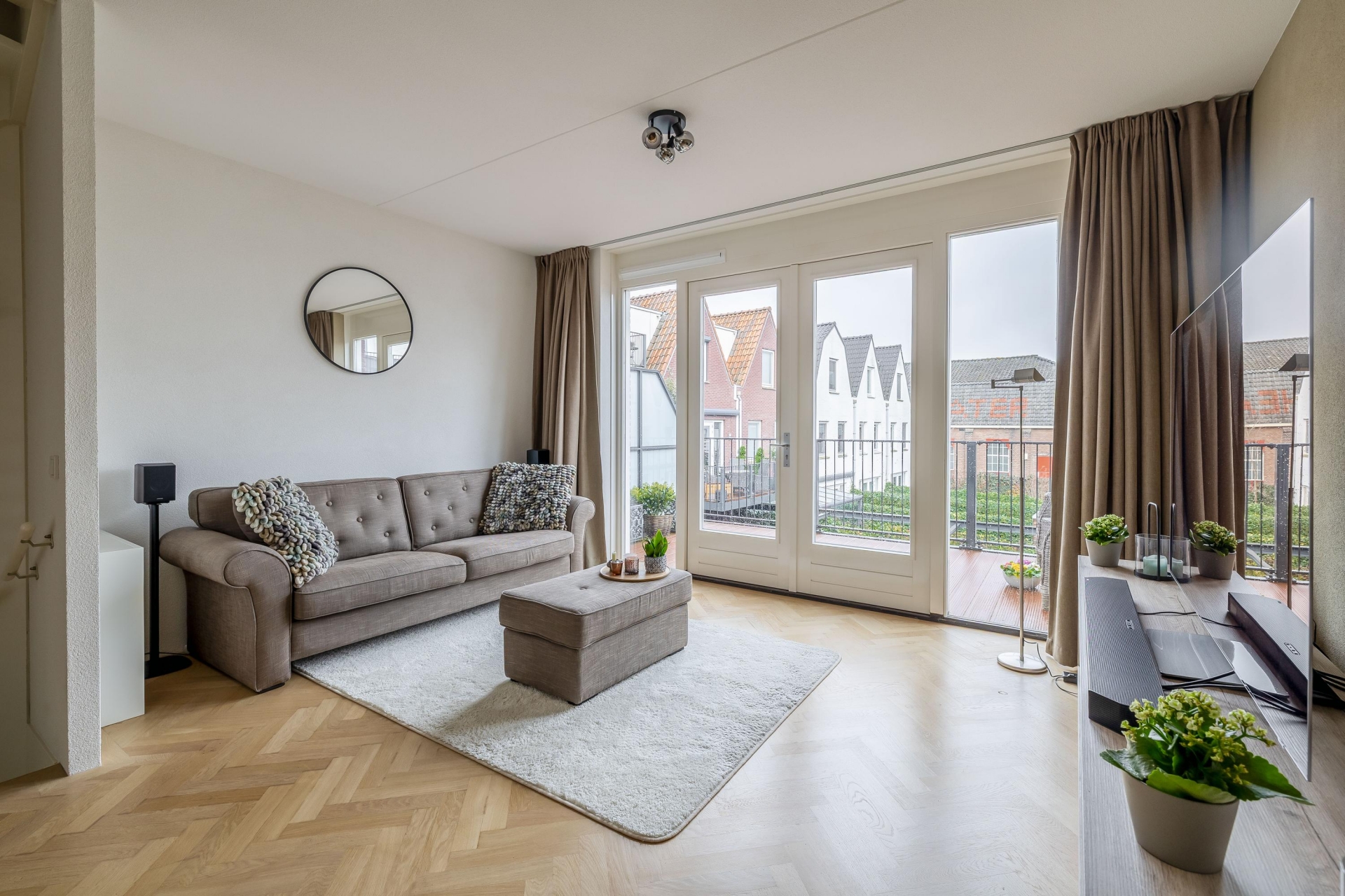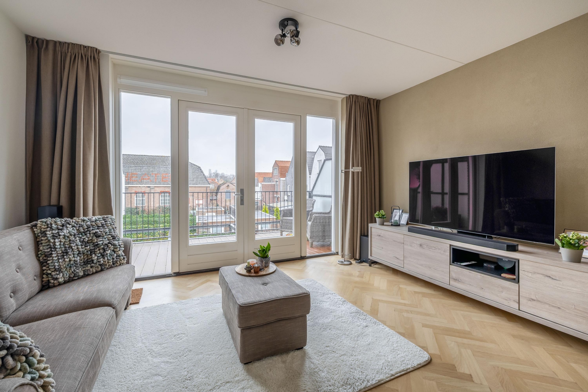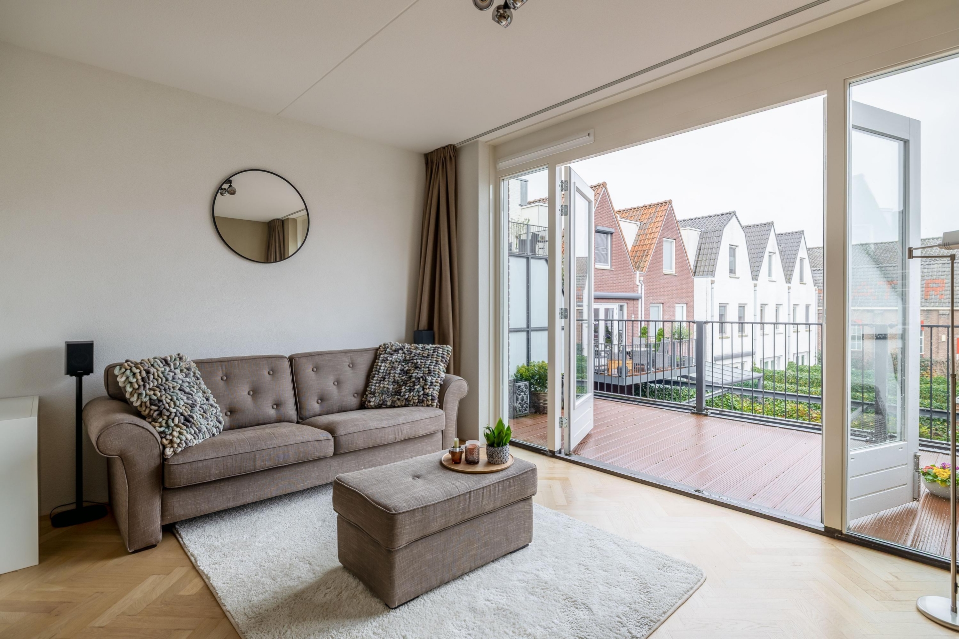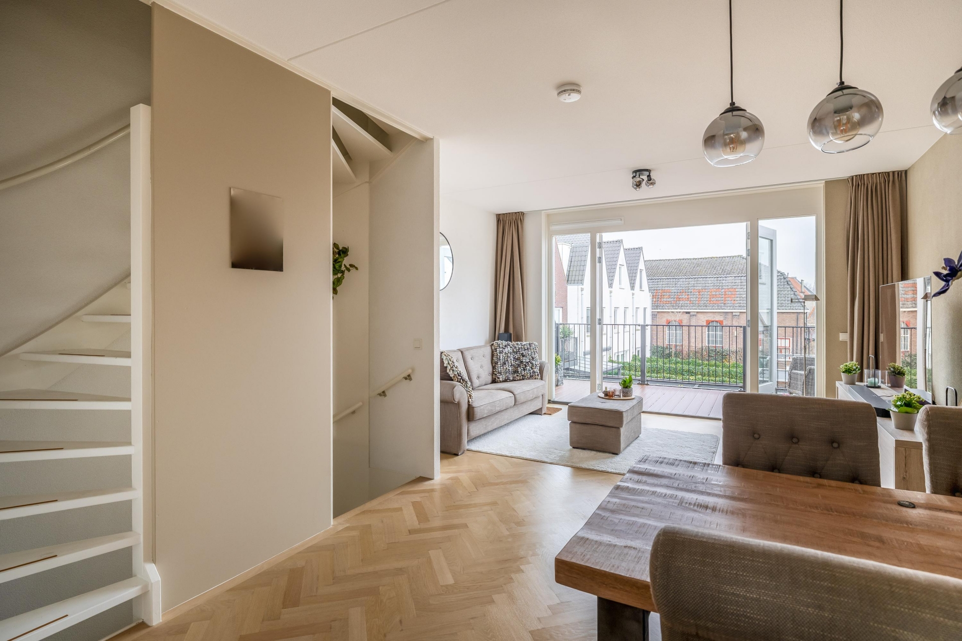 Wat direct opvalt zodra je de trap op loopt naar de 1e verdieping, is de prettige lichtinval. De woonkamer is ruim, fris en heeft een fijne indeling en is voorzien van een prachtige eiken parket visgraat vloer. De openslaande deuren geven toegang tot een knus terras waar je al snel lekker beschut zit. De open keuken sluit hier perfect op aan en is uitgevoerd in een rustige, moderne stijl met inbouwapparatuur waaronder een vaatwasser, Quooker, afzuigkap, koel-/vriescombi en een magnetron en voldoende werkruimte.