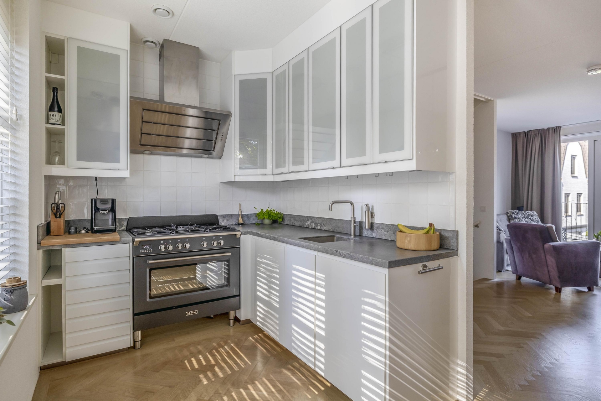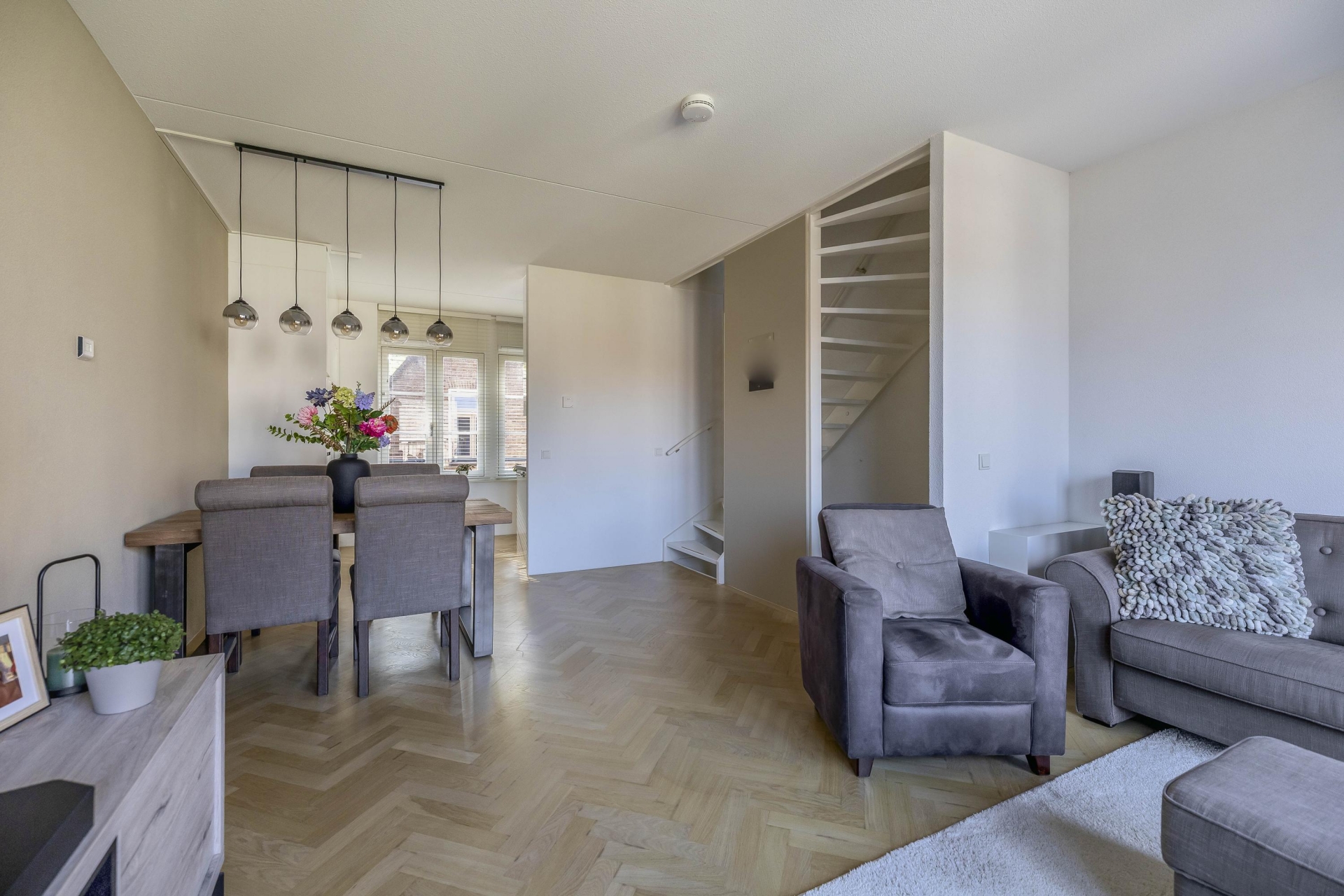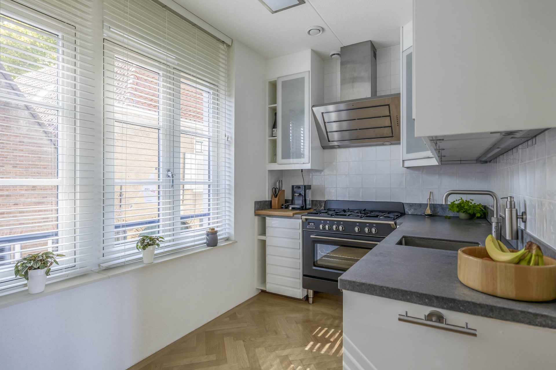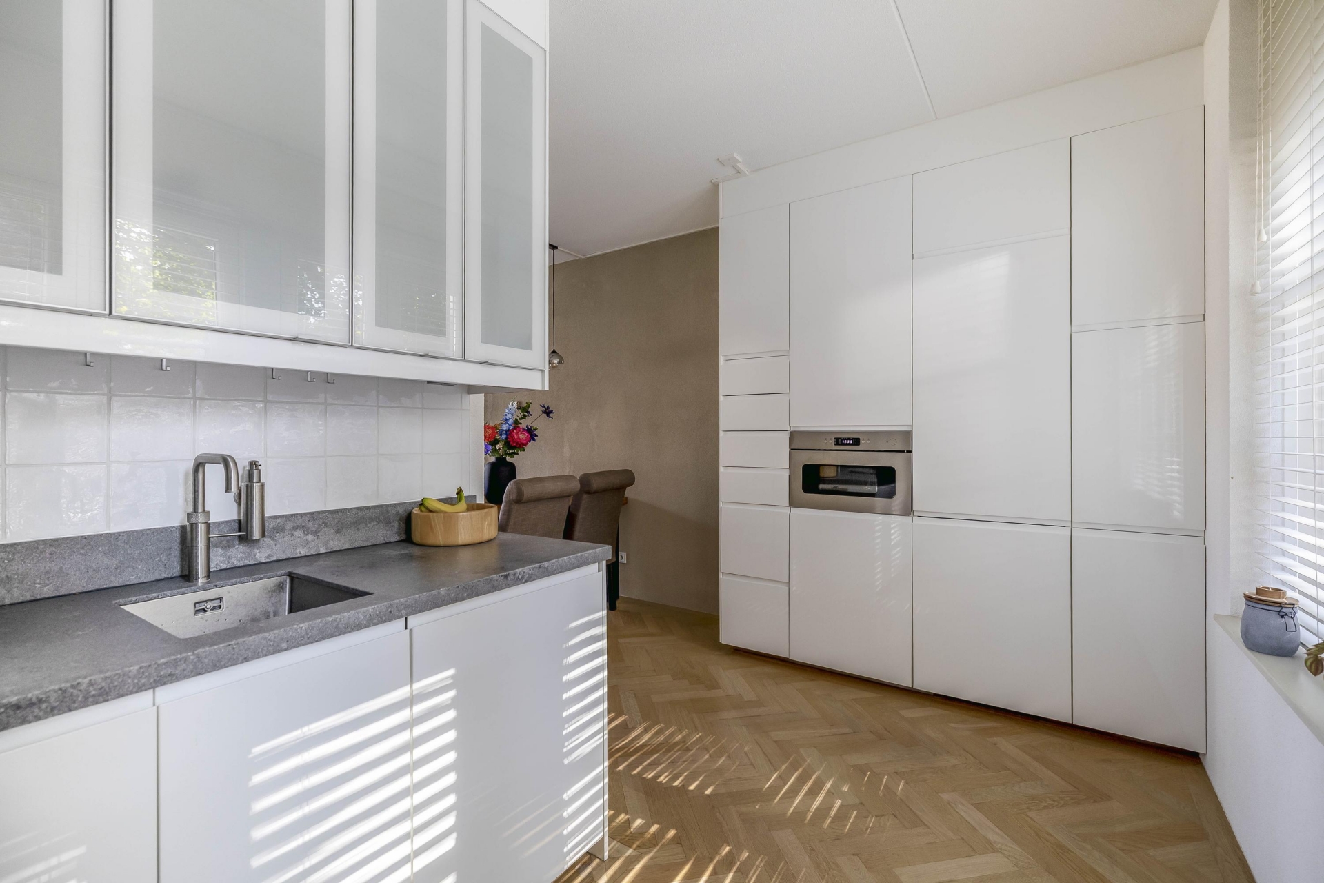 Wat direct opvalt zodra je de trap op loopt naar de 1e verdieping, is de prettige lichtinval. De woonkamer is ruim, fris en heeft een fijne indeling en is voorzien van een prachtige eiken parket visgraat vloer. De openslaande deuren geven toegang tot een knus terras waar je al snel lekker beschut zit. De open keuken sluit hier perfect op aan en is uitgevoerd in een rustige, moderne stijl met inbouwapparatuur waaronder een vaatwasser, Quooker, afzuigkap, koel-/vriescombi en een magnetron en voldoende werkruimte.