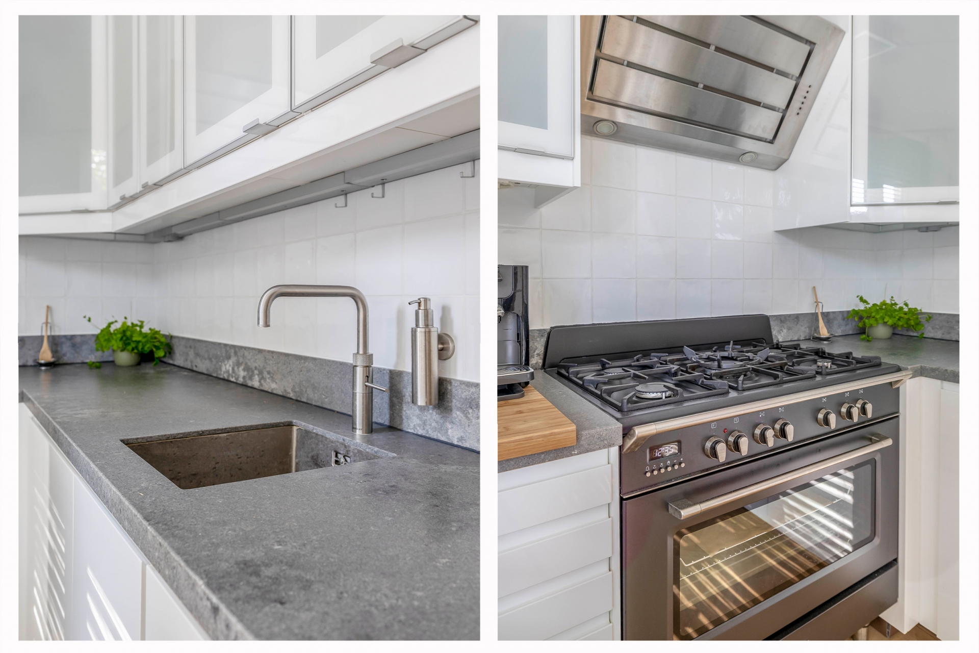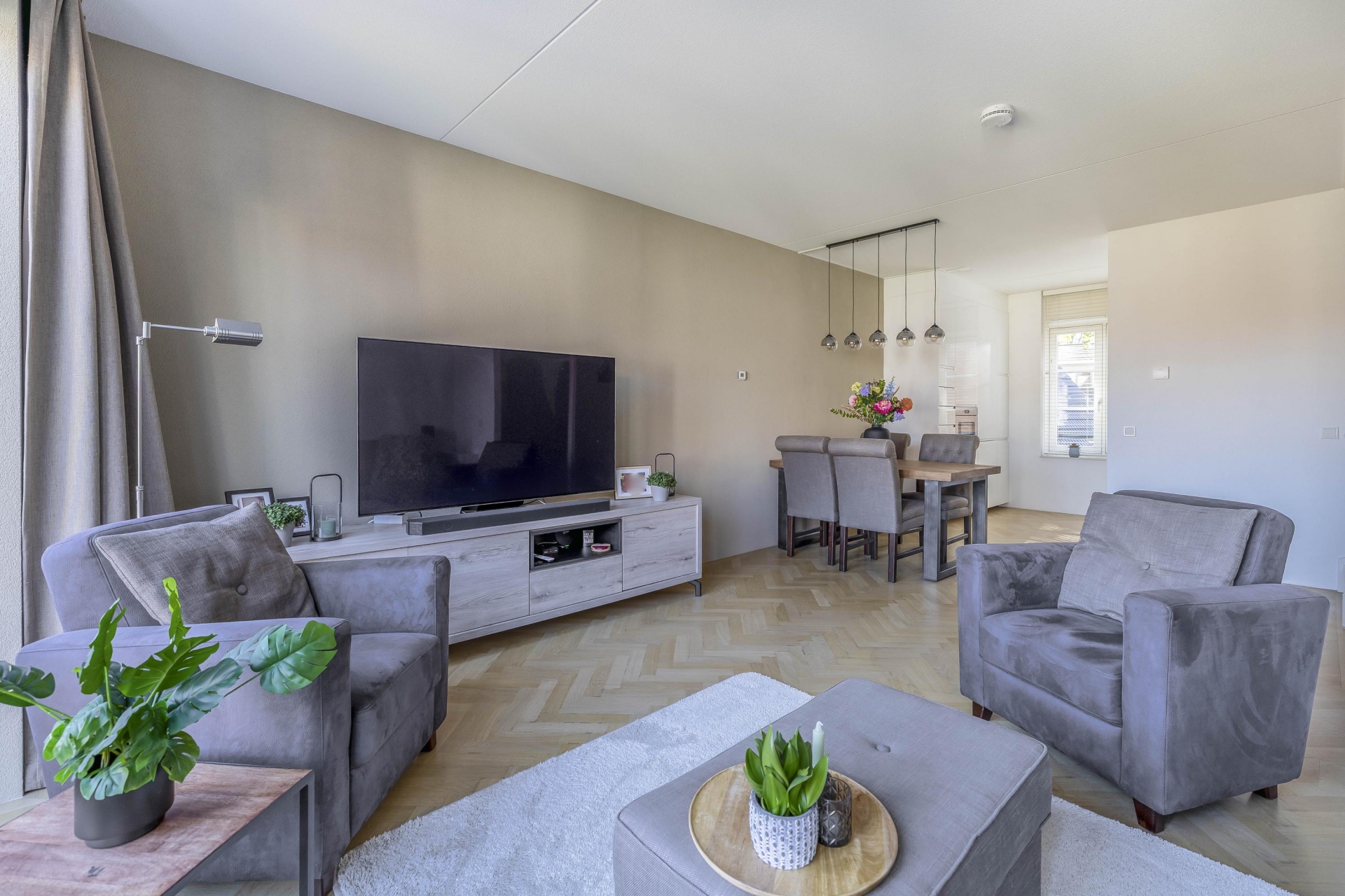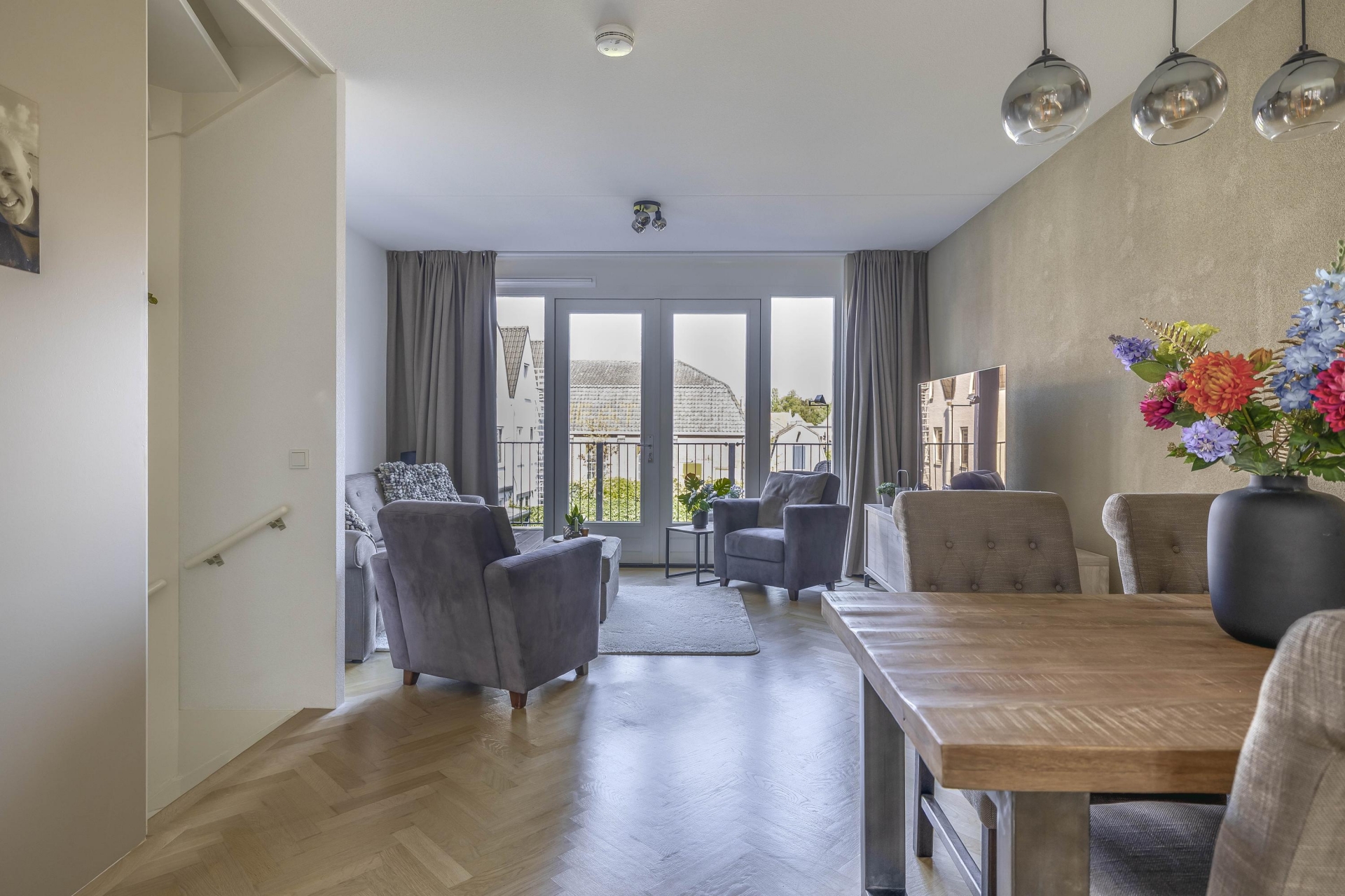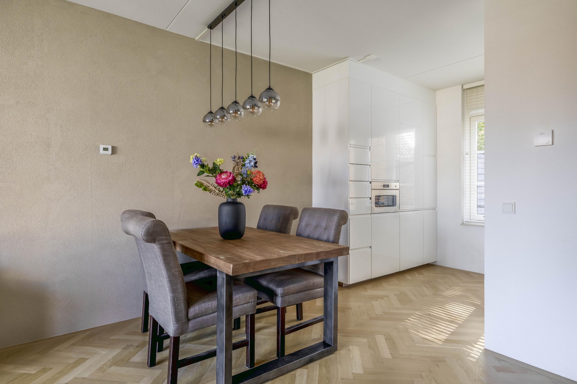 Wat direct opvalt zodra je de trap op loopt naar de 1e verdieping, is de prettige lichtinval. De woonkamer is ruim, fris en heeft een fijne indeling en is voorzien van een prachtige eiken parket visgraat vloer. De openslaande deuren geven toegang tot een knus terras waar je al snel lekker beschut zit. De open keuken sluit hier perfect op aan en is uitgevoerd in een rustige, moderne stijl met inbouwapparatuur waaronder een vaatwasser, Quooker, afzuigkap, koel-/vriescombi en een magnetron en voldoende werkruimte.