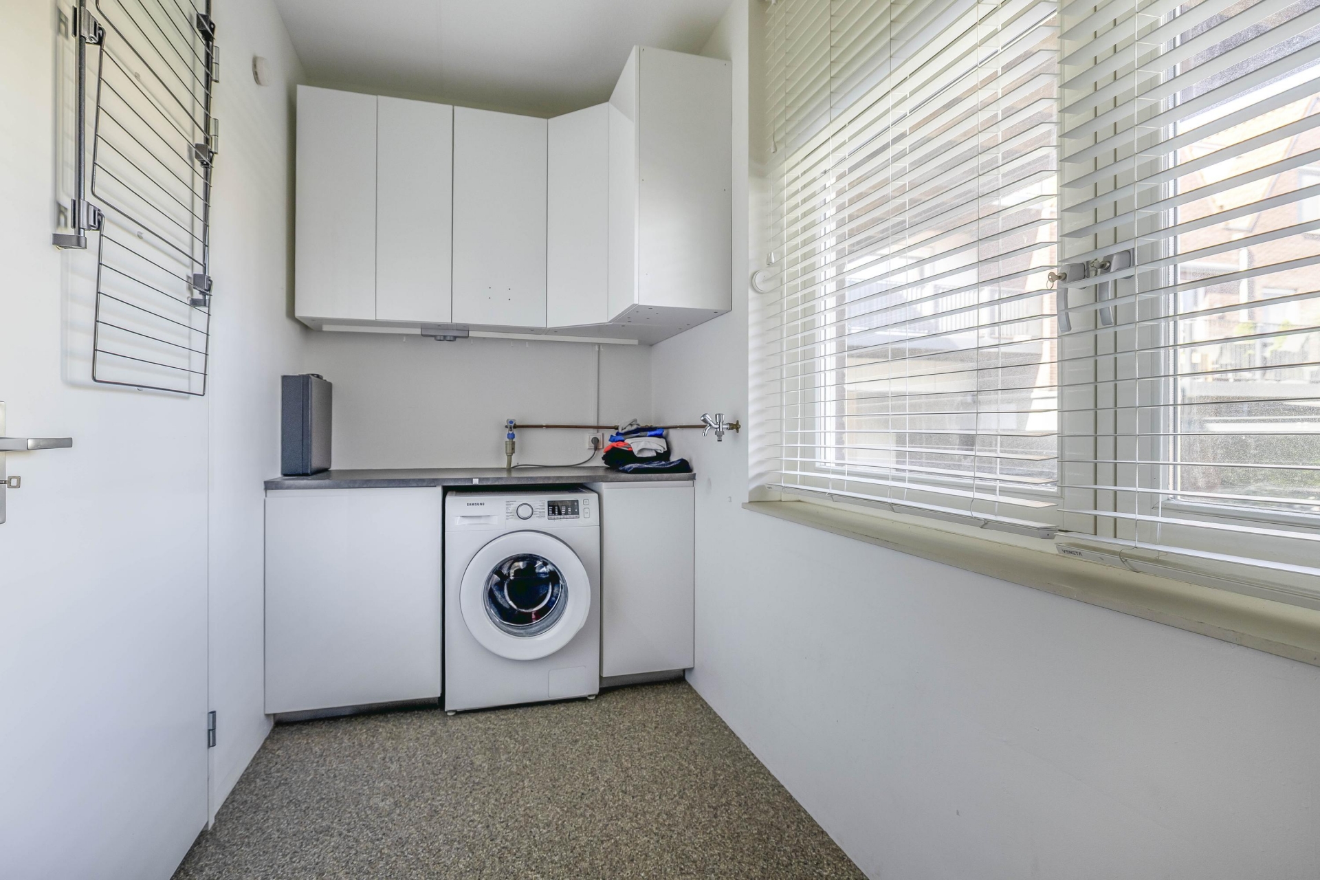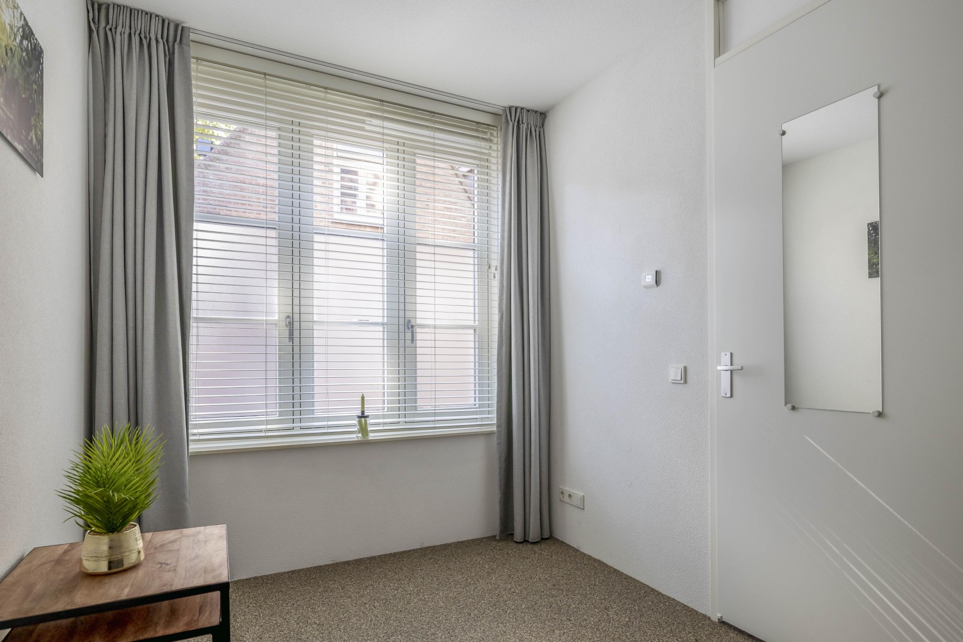 We komen binnen in een royale hal met rechts op de begane grond een comfortabele slaapkamer die ook heel makkelijk kan dienen als werkkamer, sportruimte e.d., voorzien van grote ramen en een nette afwerking. Als we verder lopen komen we in de royale bijkeuken of berging te noemen, ideaal voor opslag en fietsen en nog genoeg ruimte waar je de wasmachine en droger kwijt kunt. Dankzij deze indeling is het huis niet alleen bijzonder, maar ook nog eens heel praktisch.