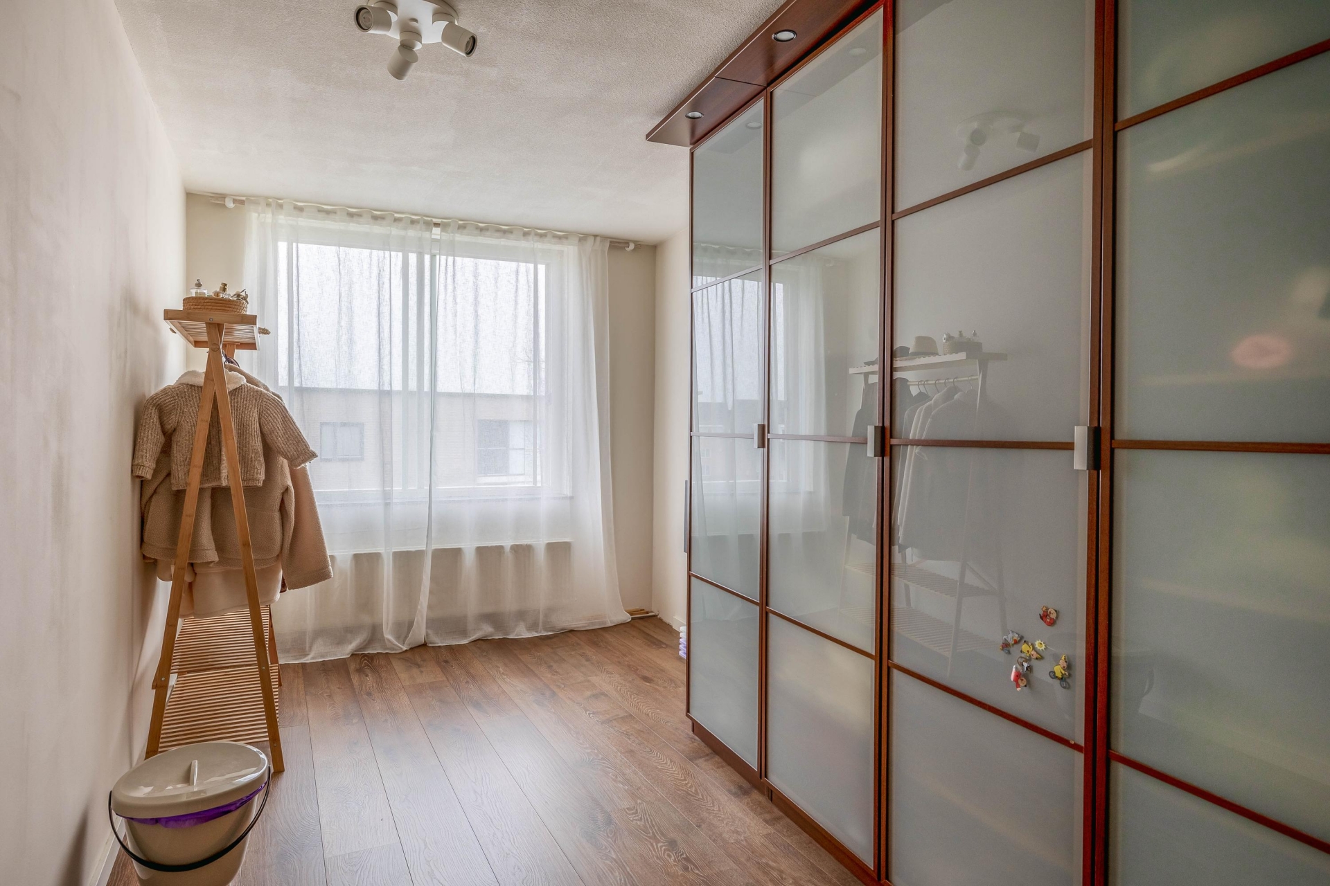 Op woonlaag onder de woonkamer bevinden zich drie slaapkamers, waarvan de grootste royaal is opgezet en ruimte biedt voor een tweepersoonsbed en een grote kast. De andere twee kamers zijn ideaal als kinderkamer, werkkamer of logeerruimte. De speelse indeling zorgt ervoor dat alle kamers goed tot hun recht komen en functioneel ingedeeld zijn.