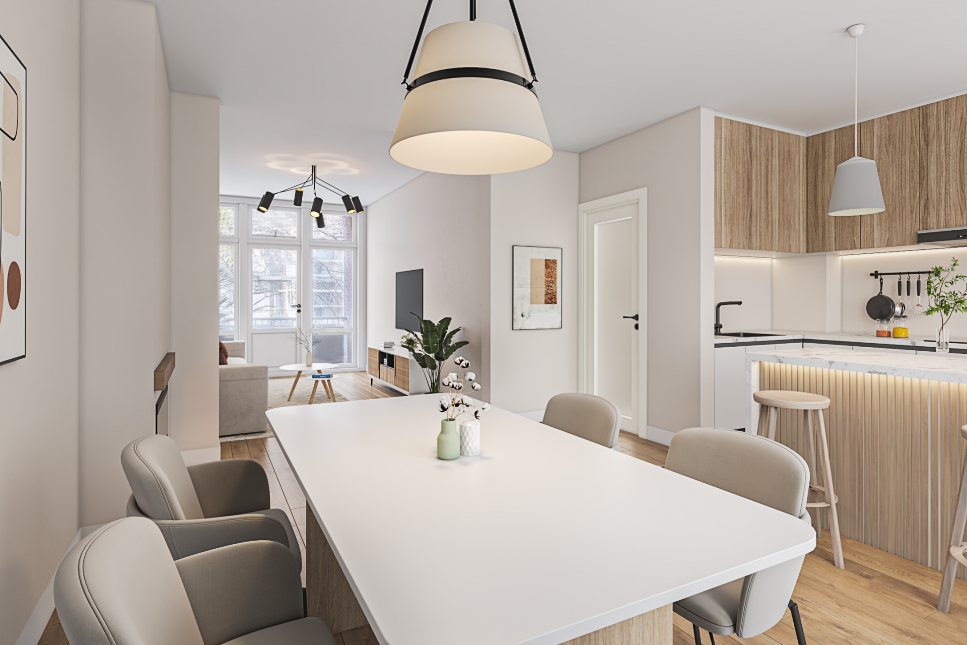 De woonkamer is prettig van formaat en profiteert van veel daglicht. Hier is genoeg ruimte voor een comfortabele zithoek én een eettafel. Aangrenzend vind je de functionele keuken en badkamer. De woning beschikt over twee slaapkamers, waarbij de grootste slaapkamer ideaal is als hoofdslaapkamer en de tweede kamer zich goed leent als werk-, logeer- of kinderkamer. De indeling is logisch en efficiënt, wat zorgt voor een fijn dagelijks gebruik.