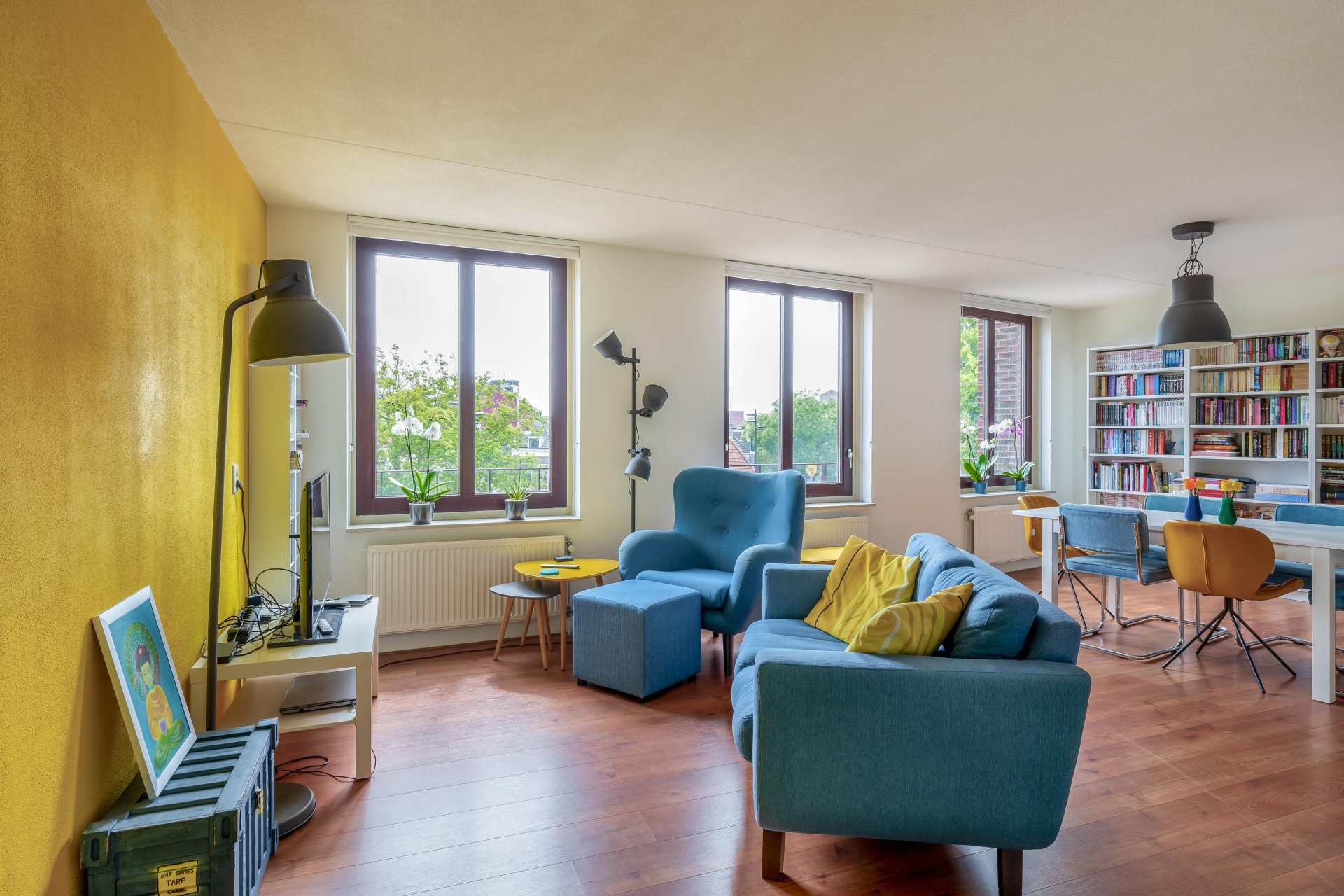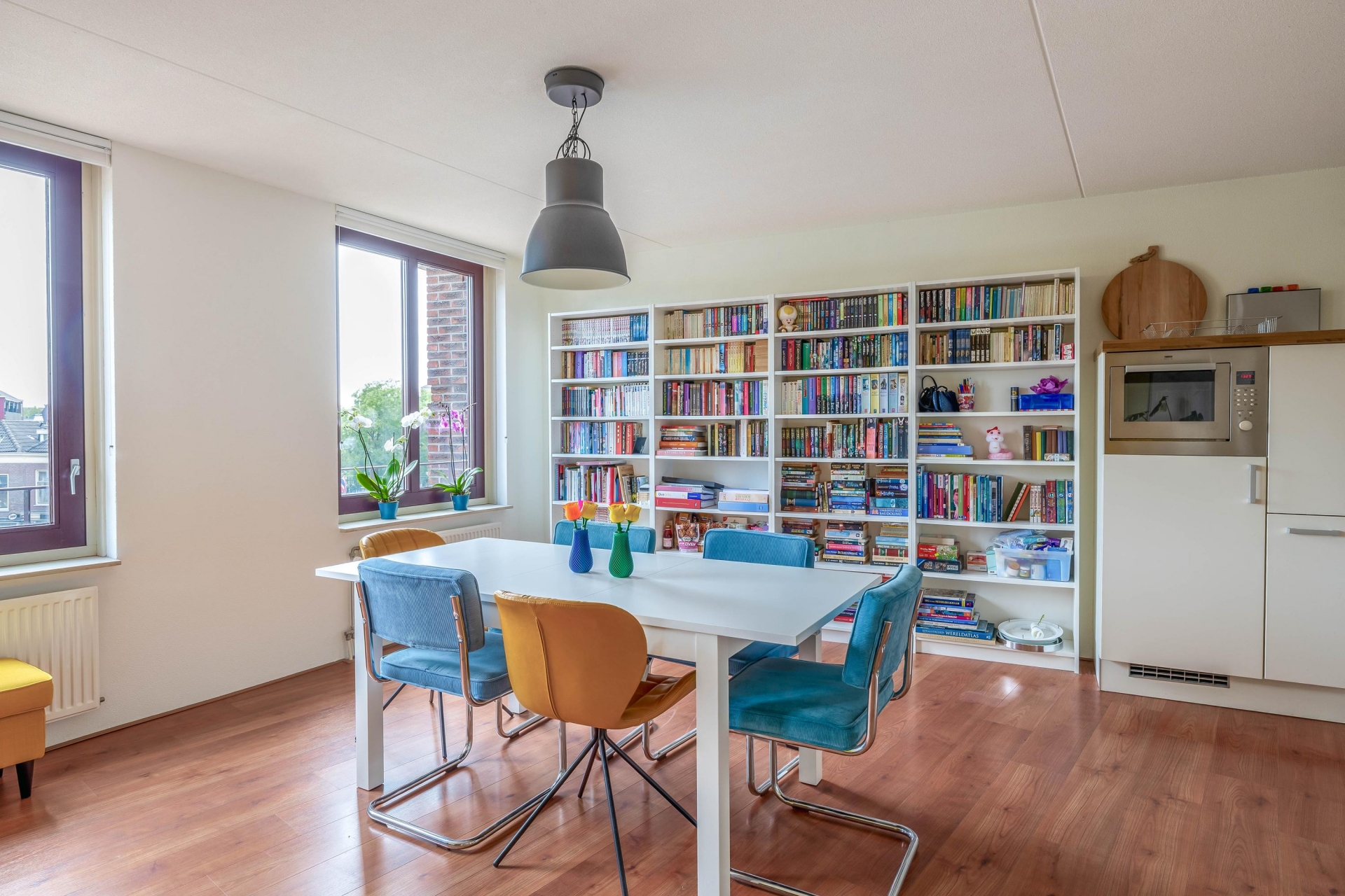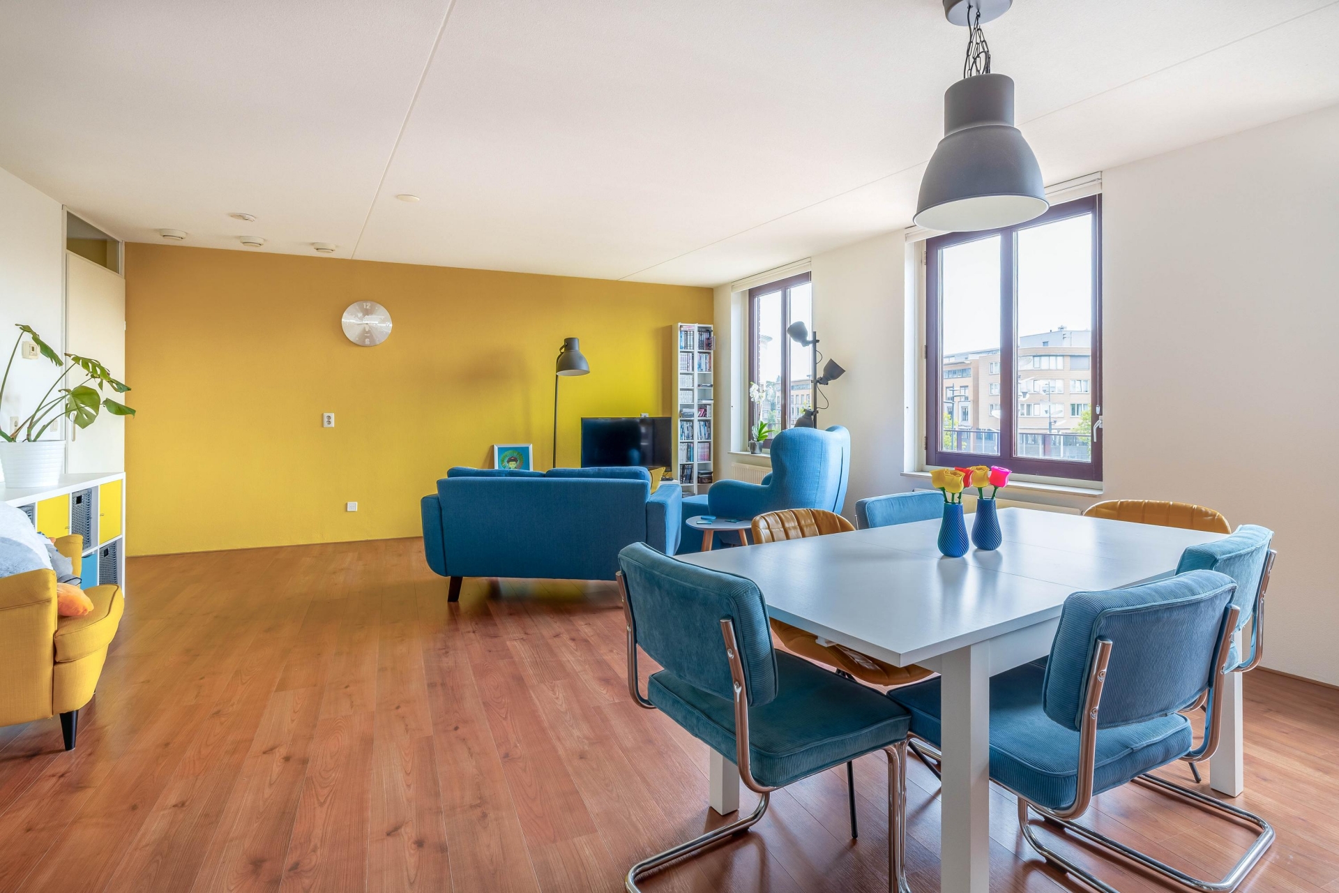 Centraal in het appartement bevindt zich de royale woonkamer met grote raampartijen. Deze zorgen niet alleen voor veel lichtinval, maar ook voor een fantastisch uitzicht over het levendige plein midden in het centrum van Schiedam.