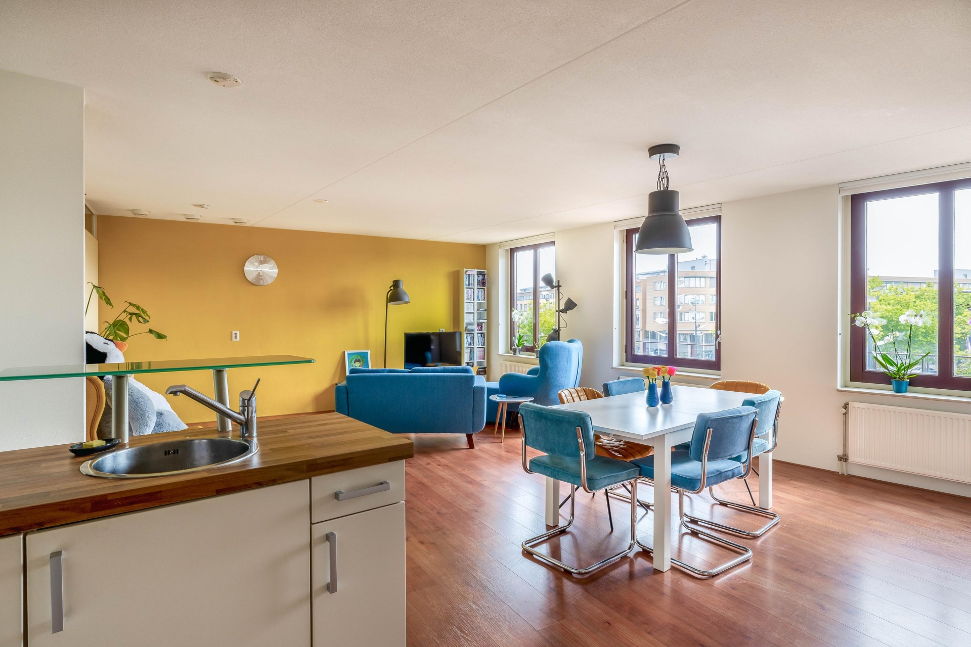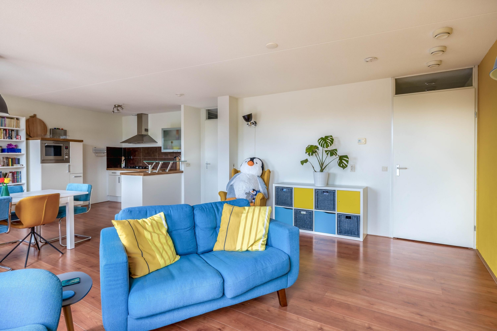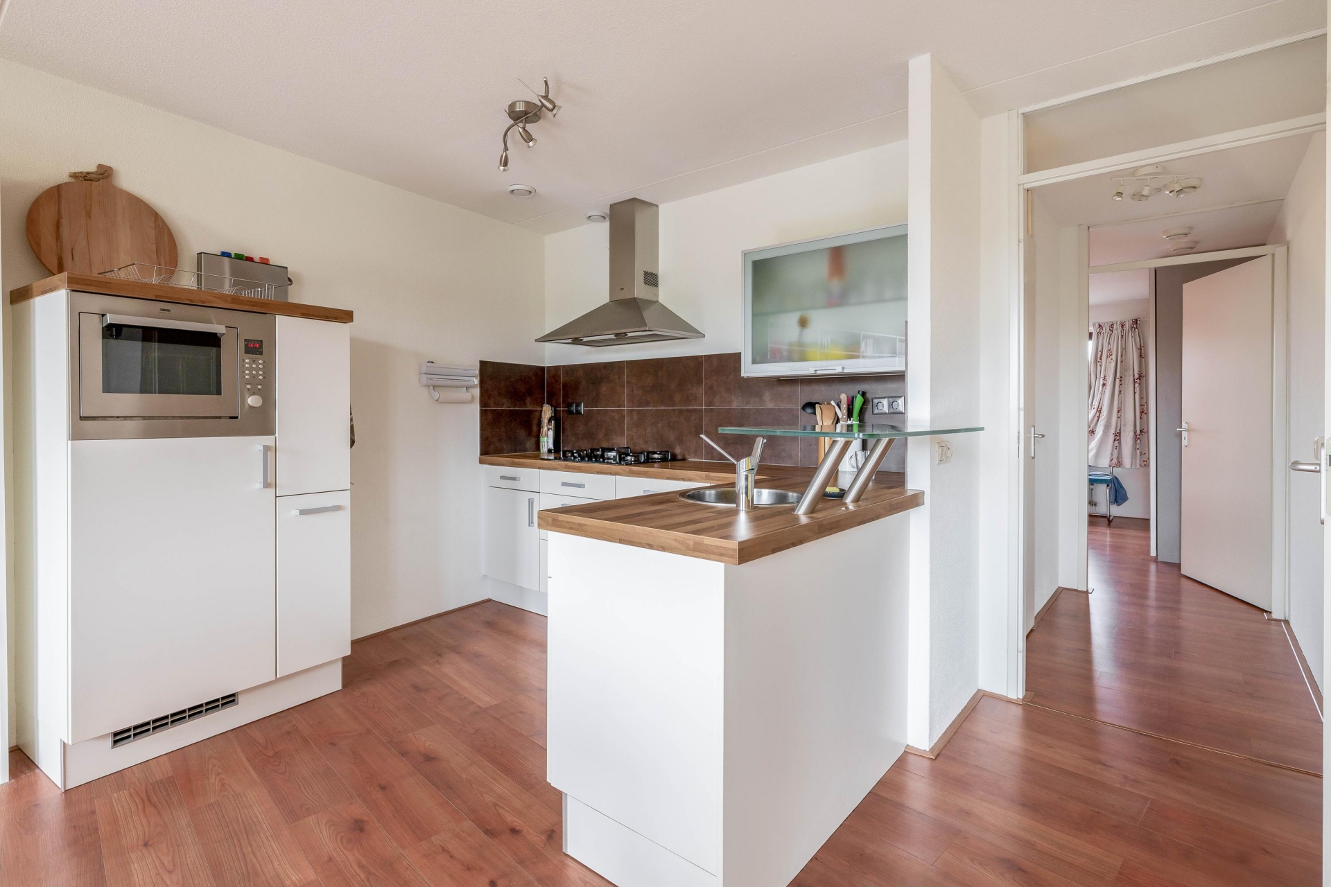 Binnen valt de verzorgde afwerking meteen op. Een lichte laminaatvloer loopt drempelloos door het hele appartement en geeft het geheel een rustige uitstraling.