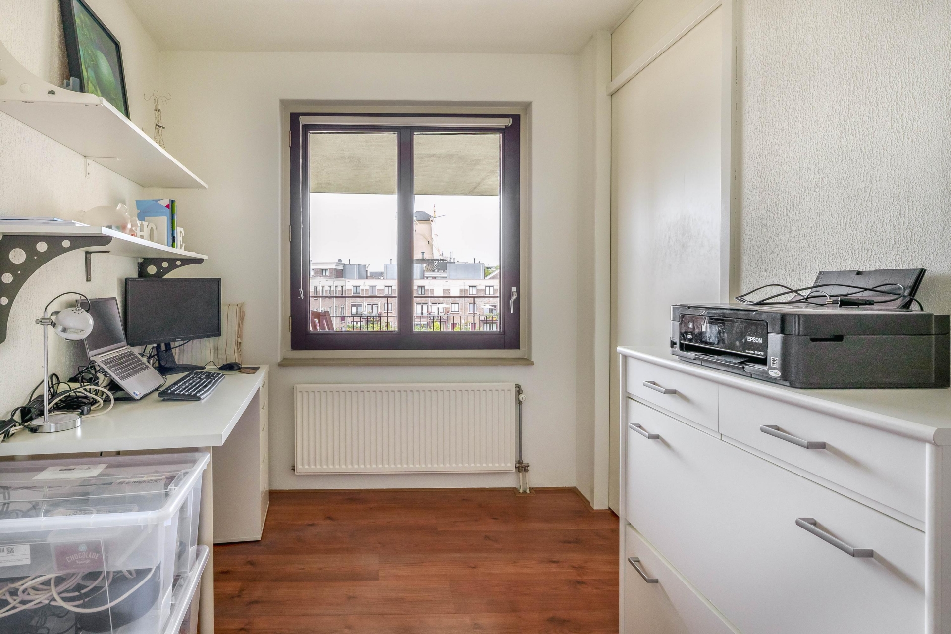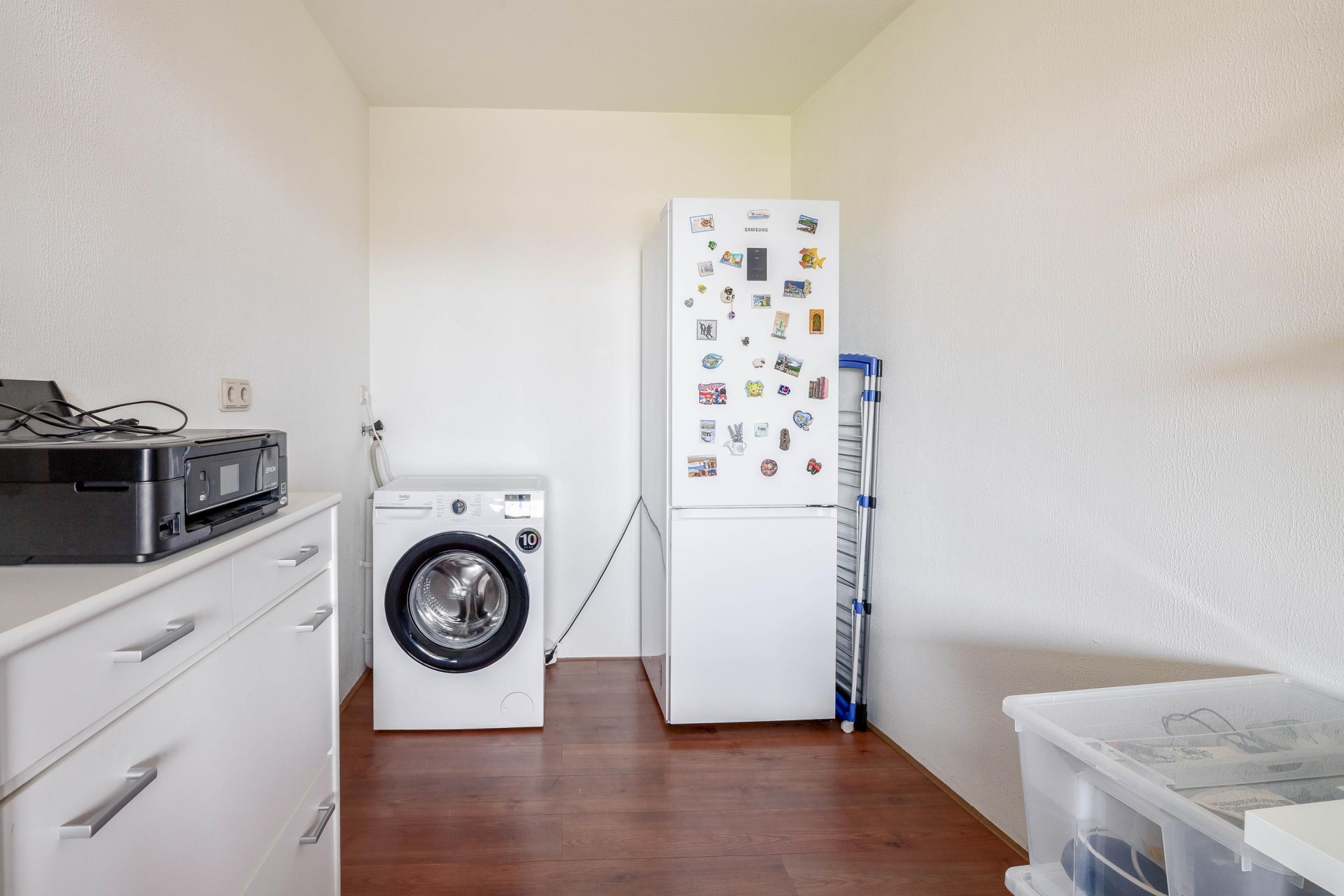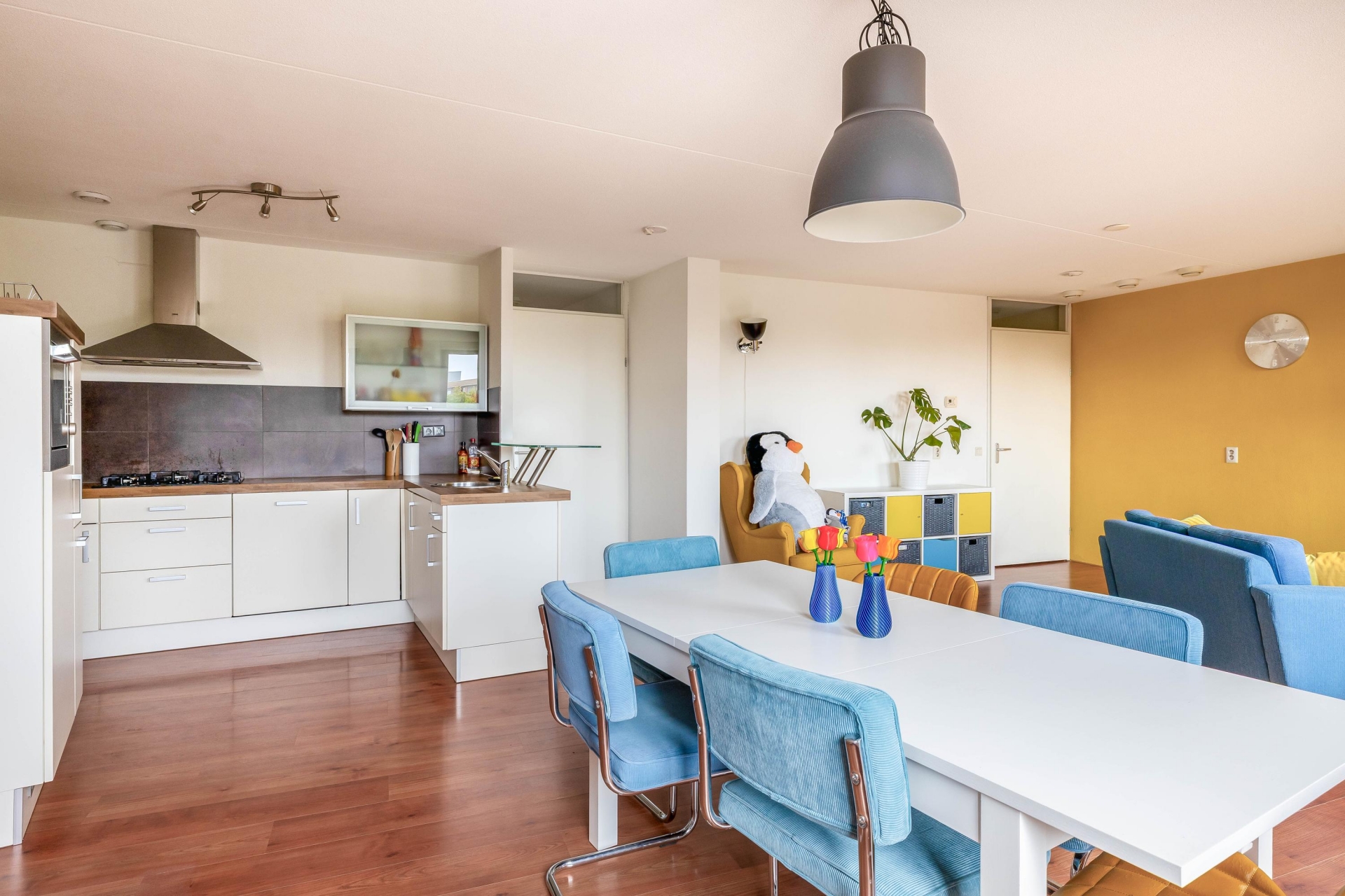 Binnen valt de verzorgde afwerking meteen op. Een lichte laminaatvloer loopt drempelloos door het hele appartement en geeft het geheel een rustige uitstraling.