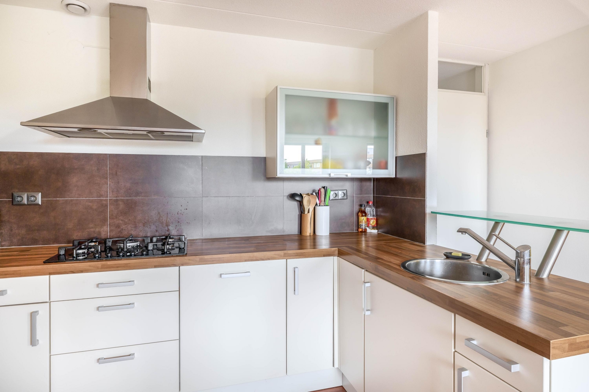 De open keuken is modern uitgevoerd in een lichte kleurstelling en sluit naadloos aan op de woonkamer. Hier vind je alle nodige inbouwapparatuur, waaronder een 5-pits gaskookplaat, vaatwasser, combimagnetron en koelkast. Dankzij de slimme indeling is er ook voldoende kastruimte beschikbaar.