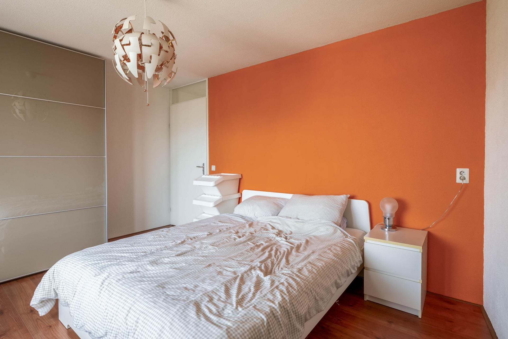Aan de achterzijde van het appartement ligt de ruime ouderslaapkamer, heerlijk rustig en met uitzicht op het groene binnenterrein.