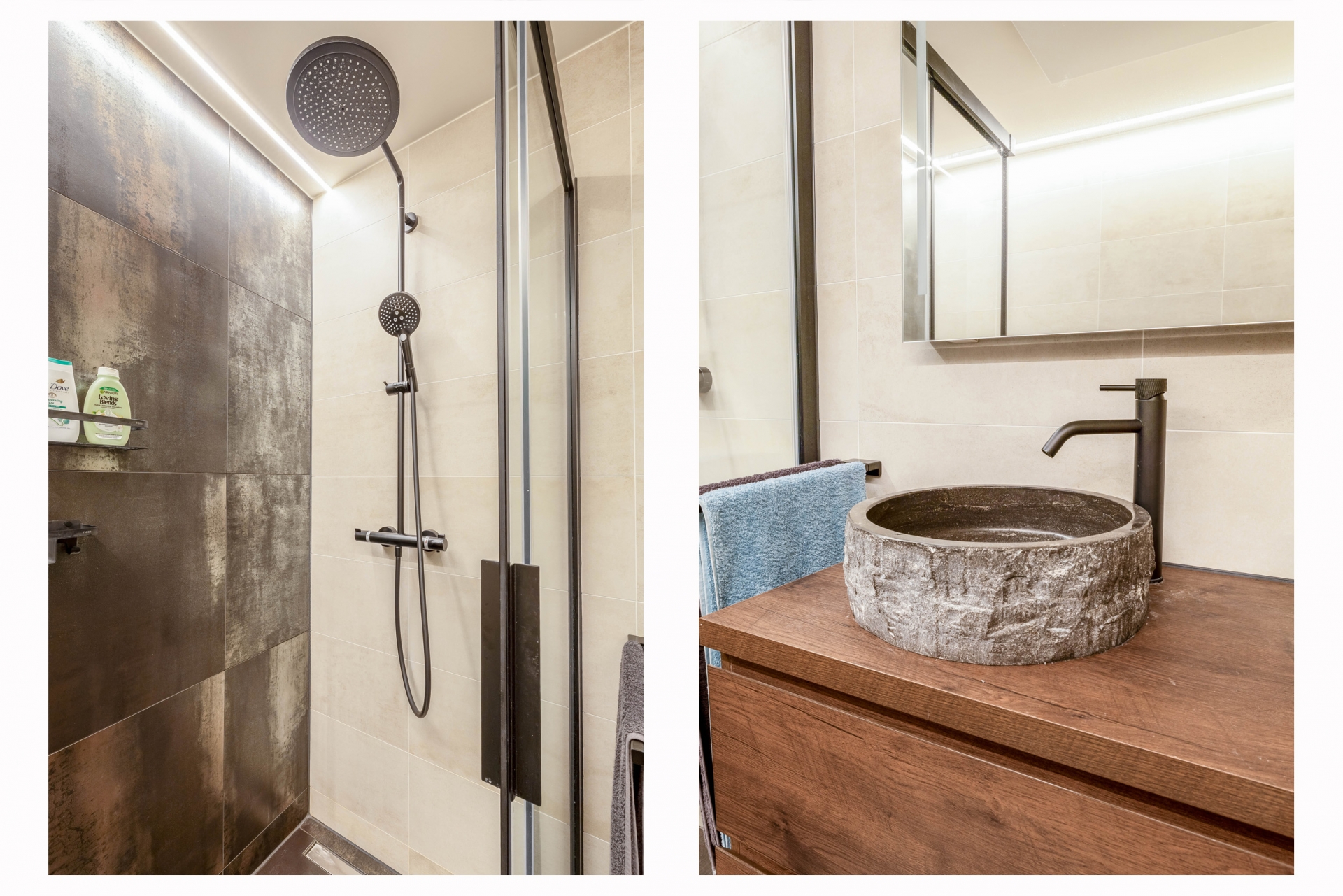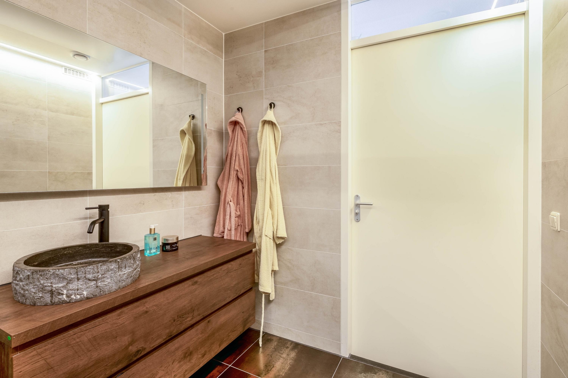De badkamer (2022) is stijlvol afgewerkt en voorzien van alle comfort. Denk aan een volledig betegelde ruimte met een inloopdouche, een modern wastafelmeubel met natuurstenen waskom en goede verlichting. Ook deze ruimte is perfect onderhouden.