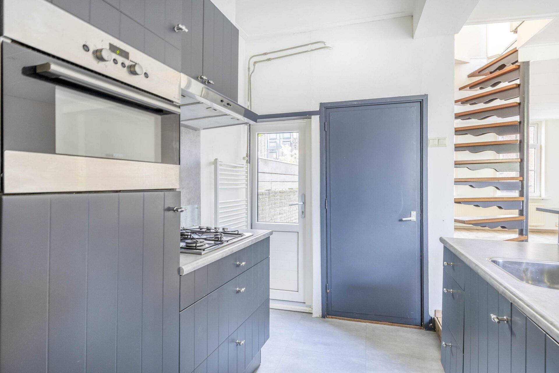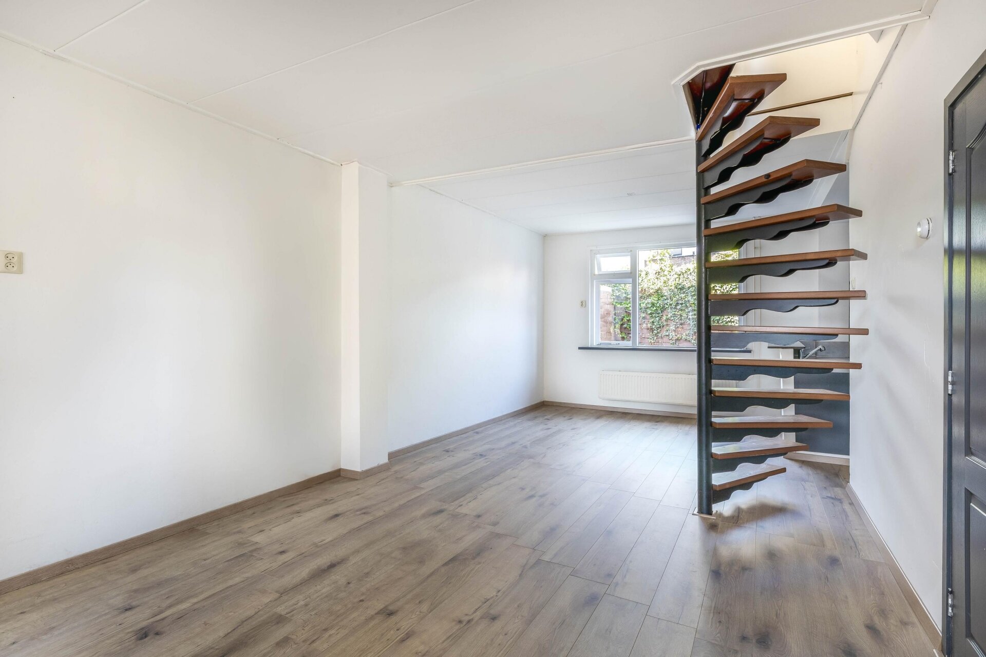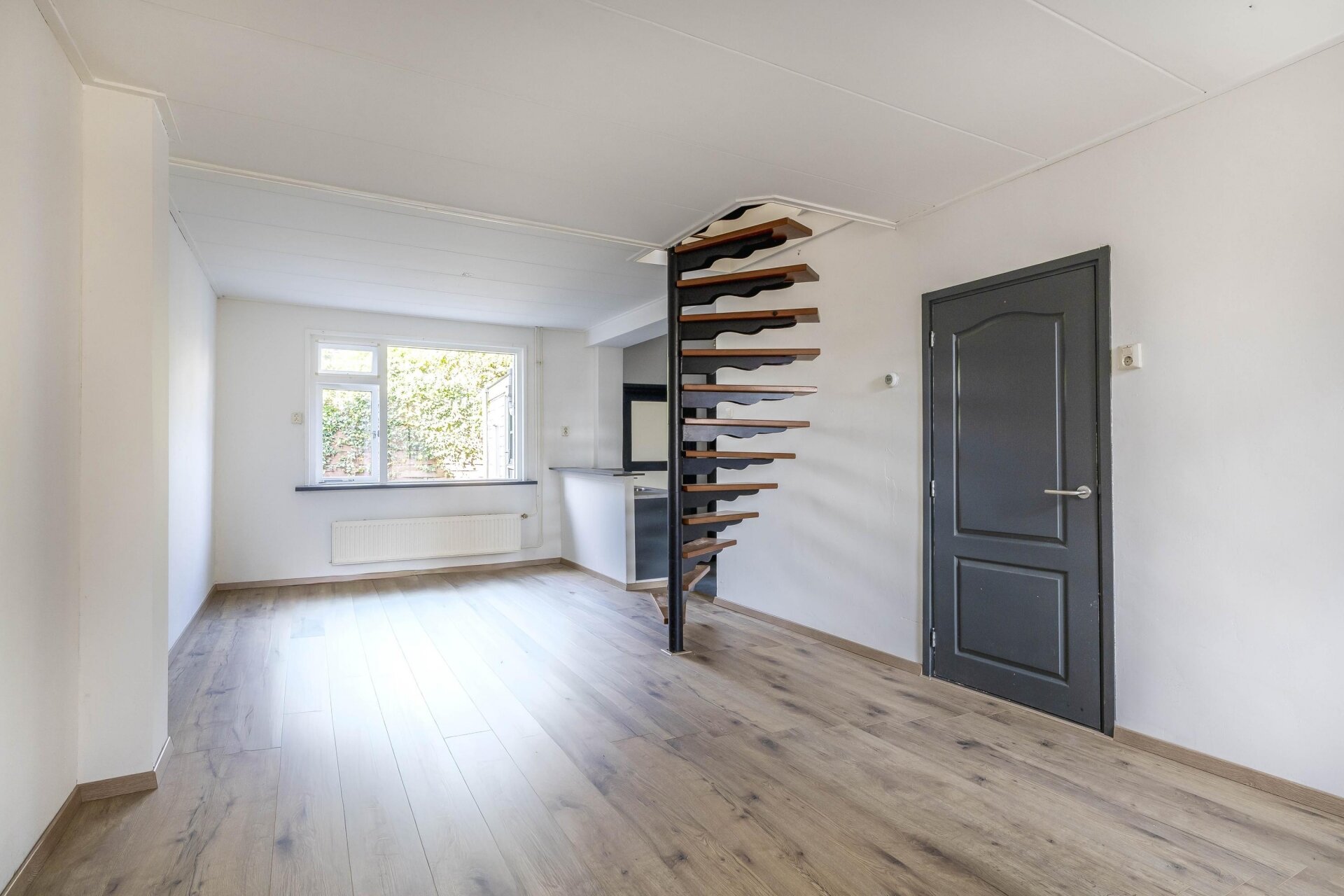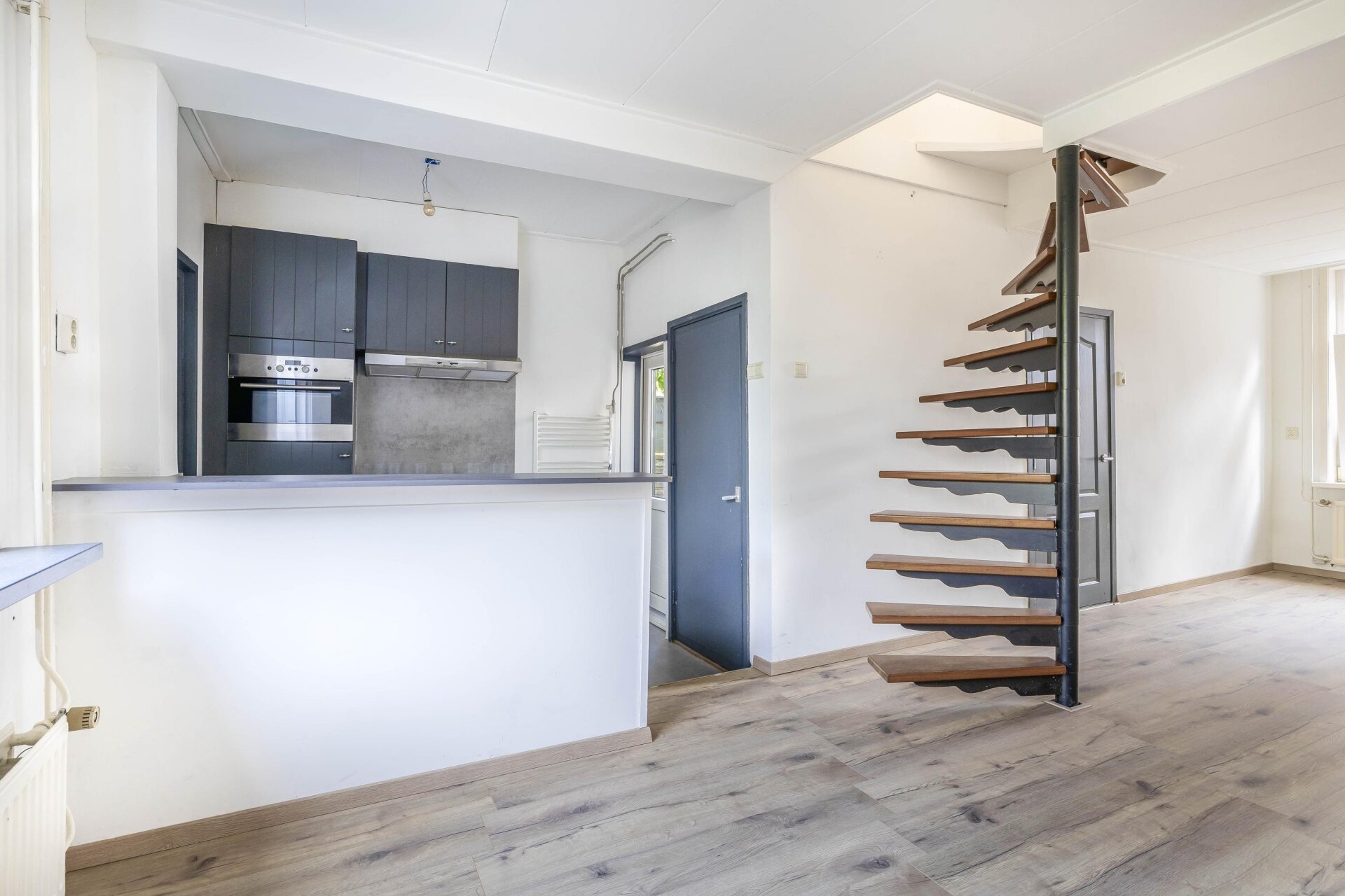 De woonkamer valt op door het strakke, lichte karakter dankzij de nieuwe laminaatvloer en frisse wanden. De open trap naar boven zorgt voor een speels effect en het raam aan de voorzijde laat prettig daglicht binnenstromen. De halfopen keuken ligt aan de achterzijde van het huis en is uitgevoerd in een moderne, donkere kleurstelling met gaskookplaat, afzuigkap, oven, koelkast, vaatwasser, designradiator en deur naar voorzijde, eenvoudig toilet, bijkeuken/berging met deur naar plaatsje aan achterzijde
