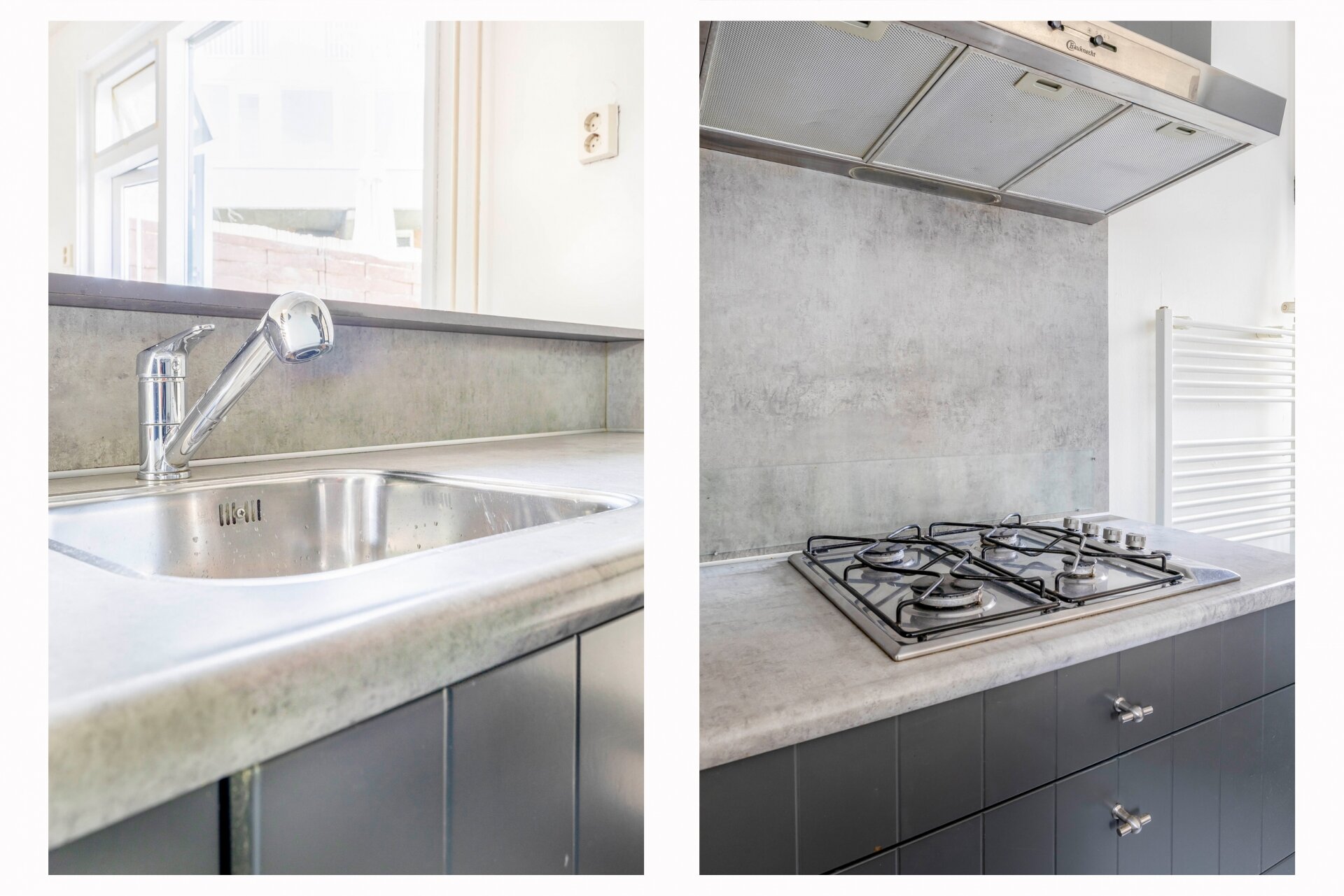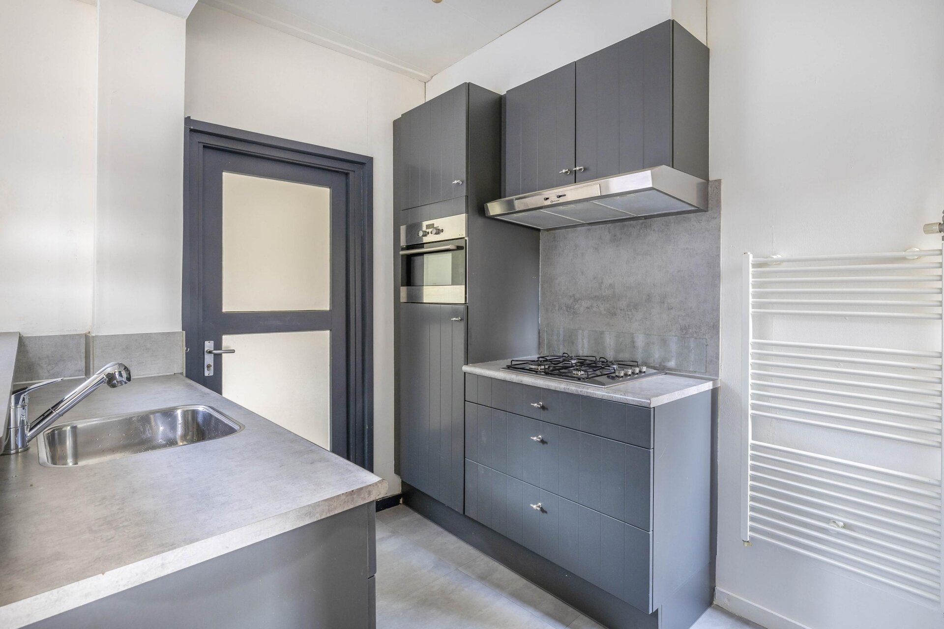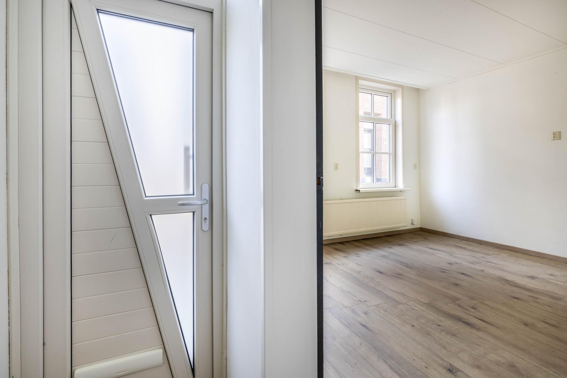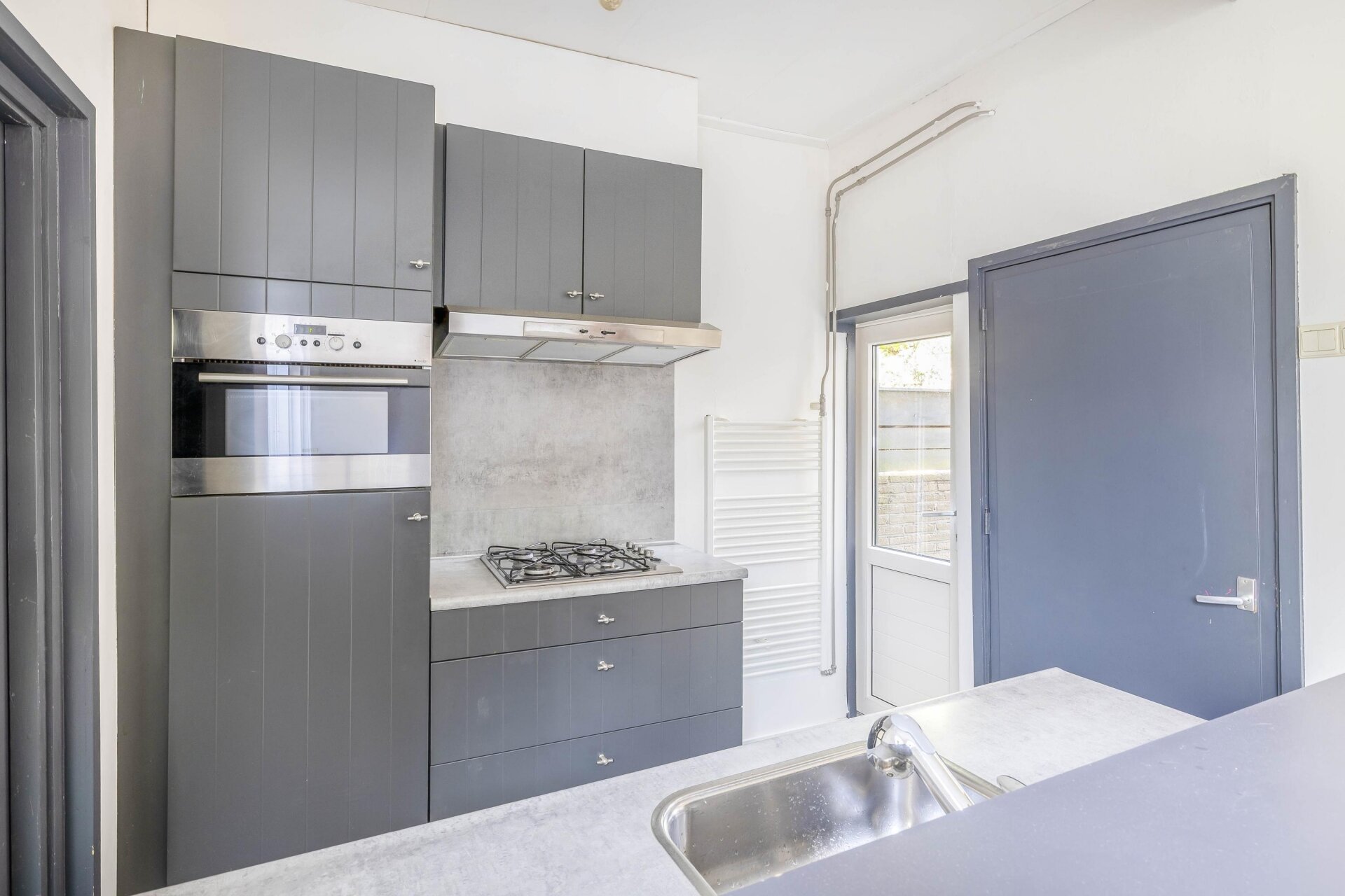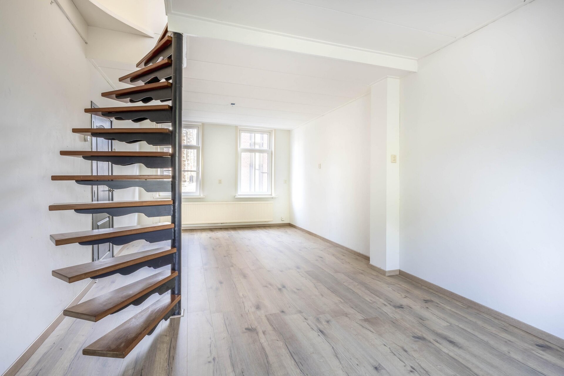 De woonkamer valt op door het strakke, lichte karakter dankzij de nieuwe laminaatvloer en frisse wanden. De open trap naar boven zorgt voor een speels effect en het raam aan de voorzijde laat prettig daglicht binnenstromen. De halfopen keuken ligt aan de achterzijde van het huis en is uitgevoerd in een moderne, donkere kleurstelling met gaskookplaat, afzuigkap, oven, koelkast, vaatwasser, designradiator en deur naar voorzijde, eenvoudig toilet, bijkeuken/berging met deur naar plaatsje aan achterzijde
