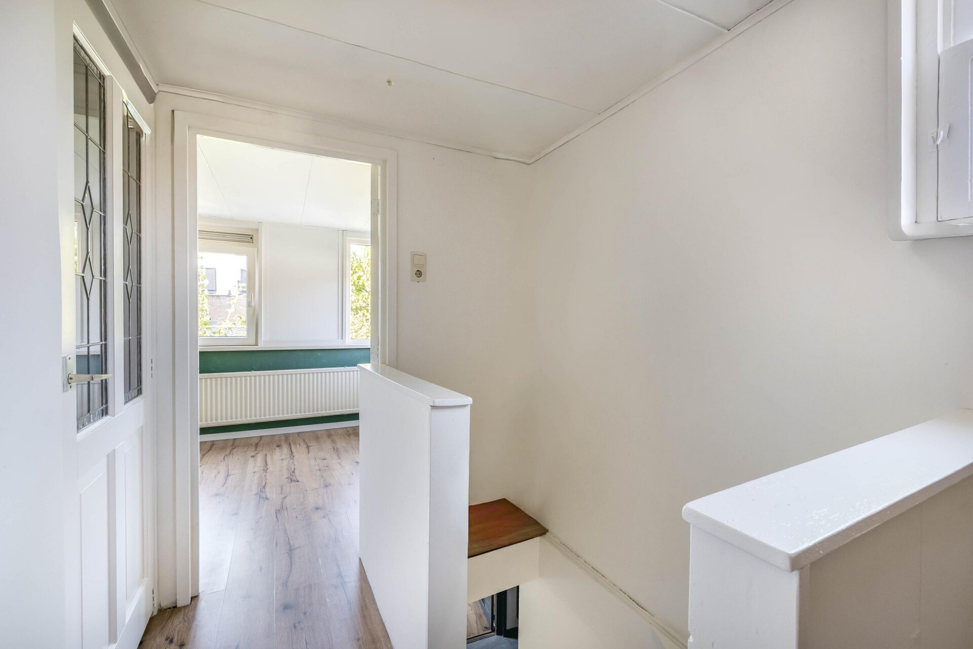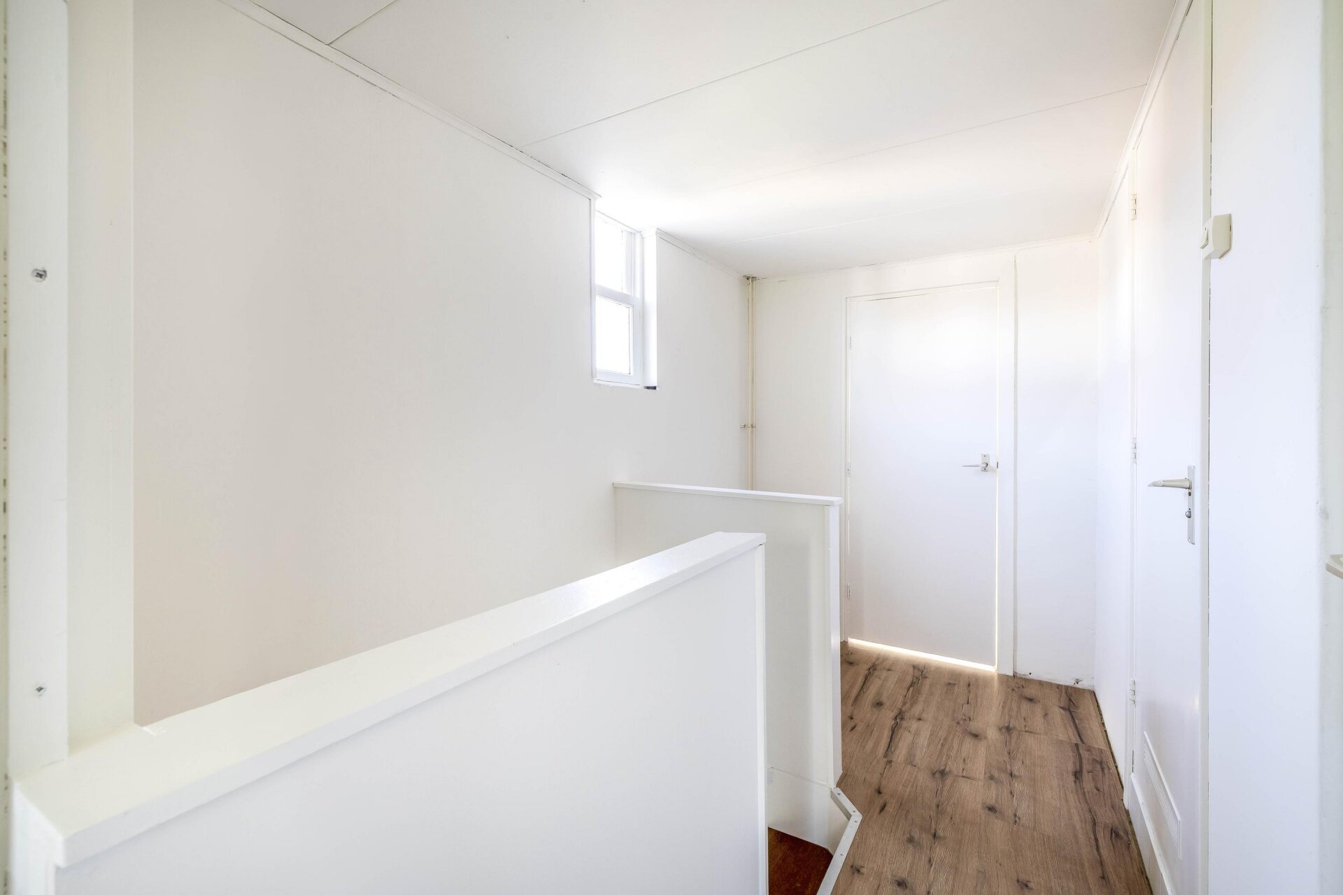 overloop met zijraam, lichte slaapkamer aan voorzijde met laminaat en kunststof kozijnen, lichte slaapkamer aan achterzijde met kunststof kozijnen, eenvoudige maar ruime badkamer met douche, wastafel, 2e toilet en aansluiting wasmachine