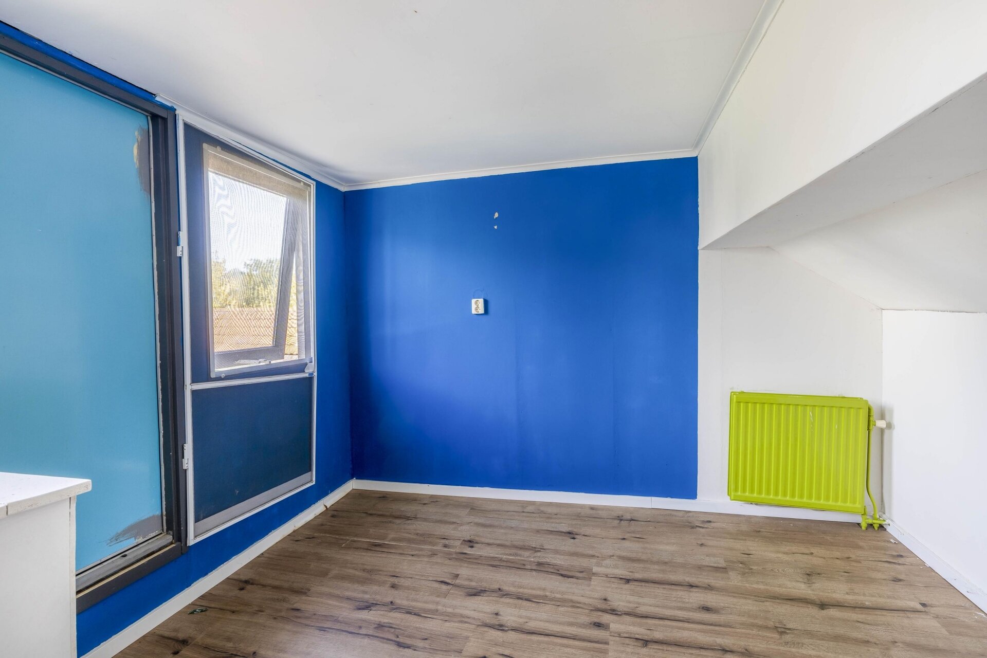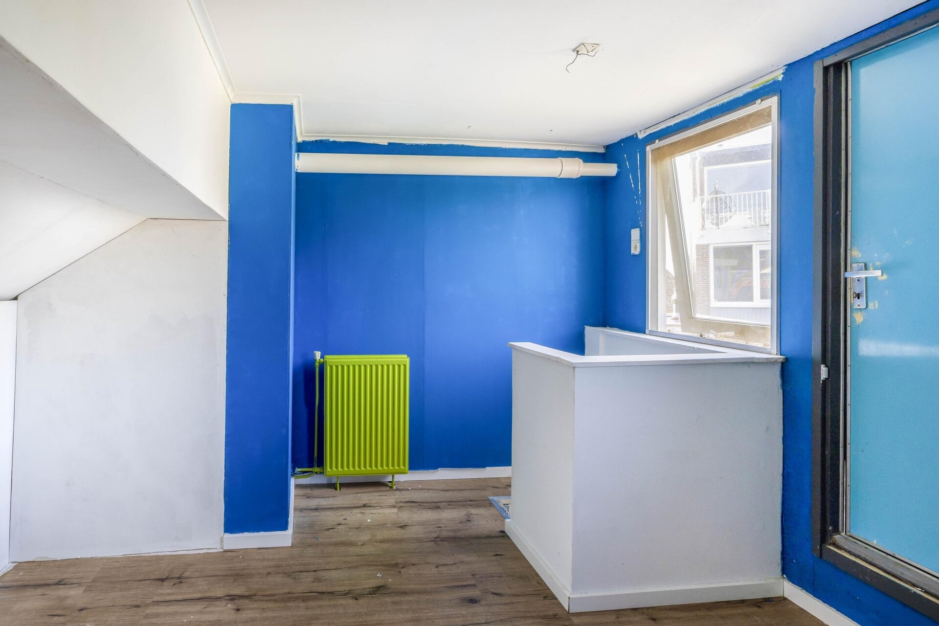slaapkamer met houten kozijnen met dubbel glas en bergruimte achter de knieschotten