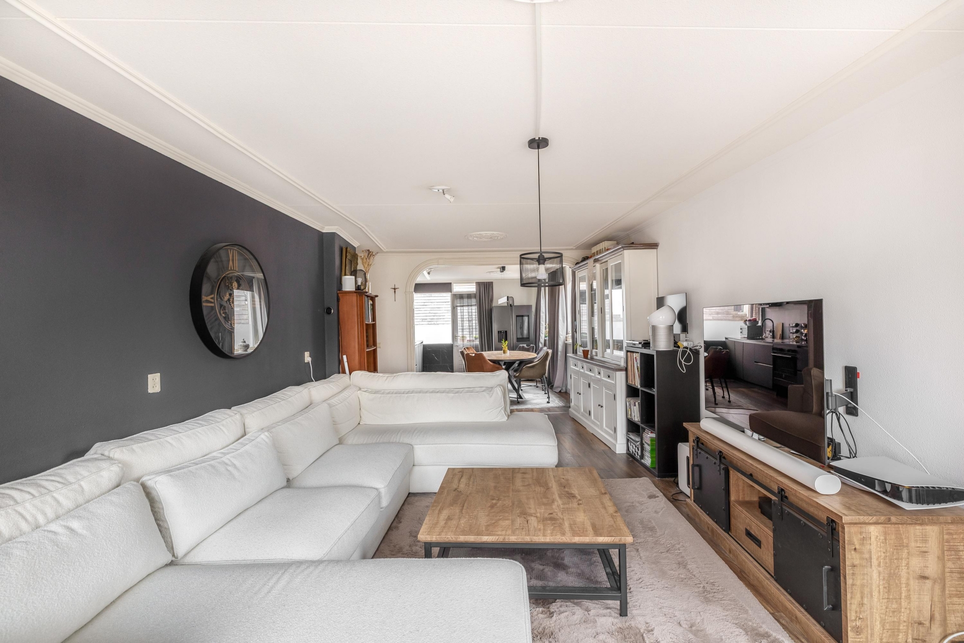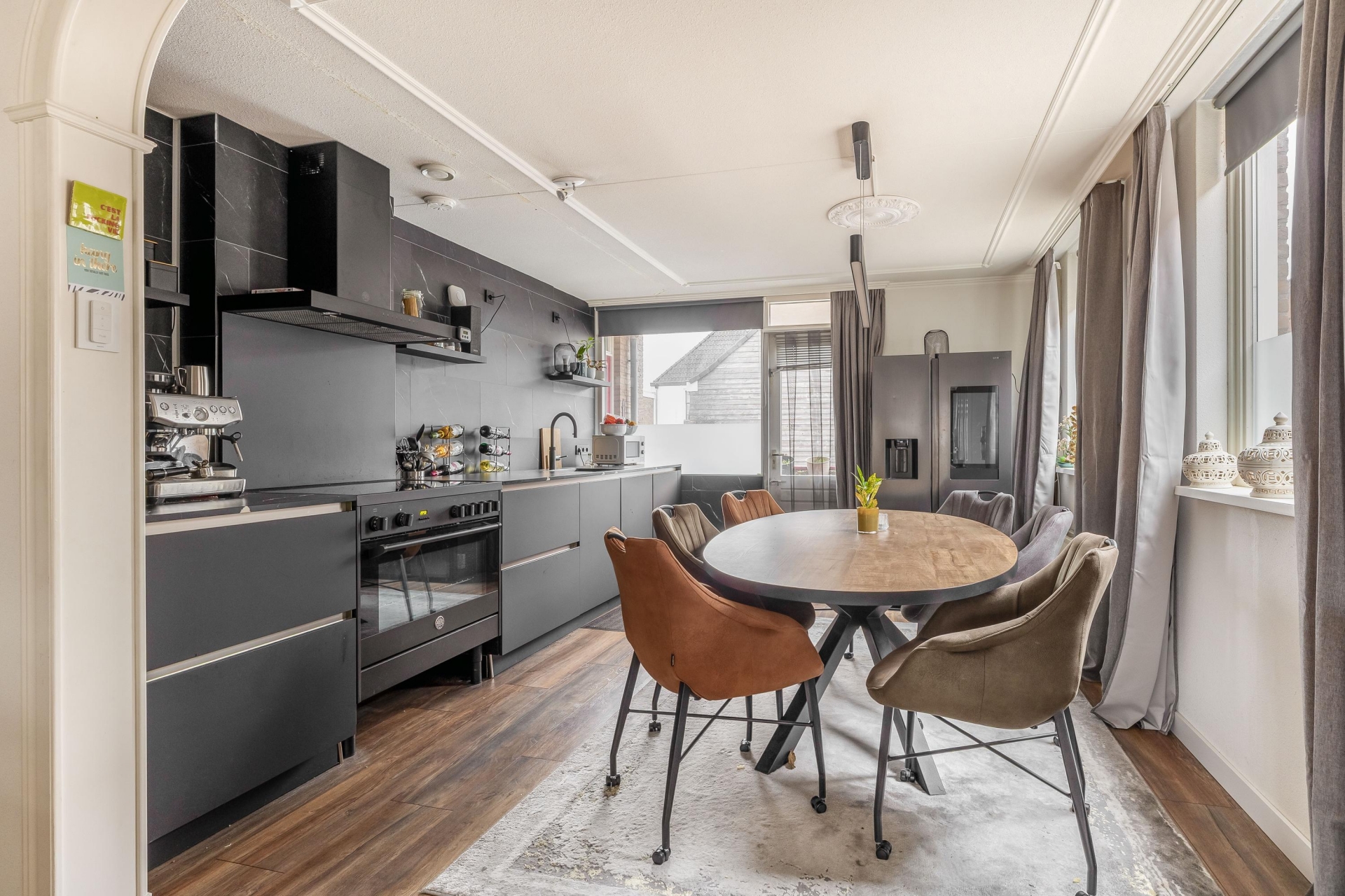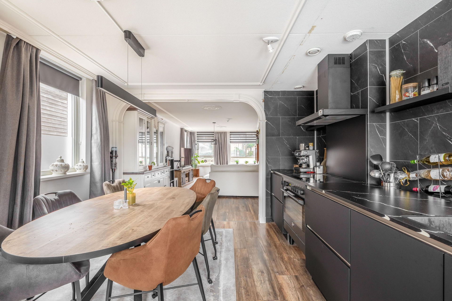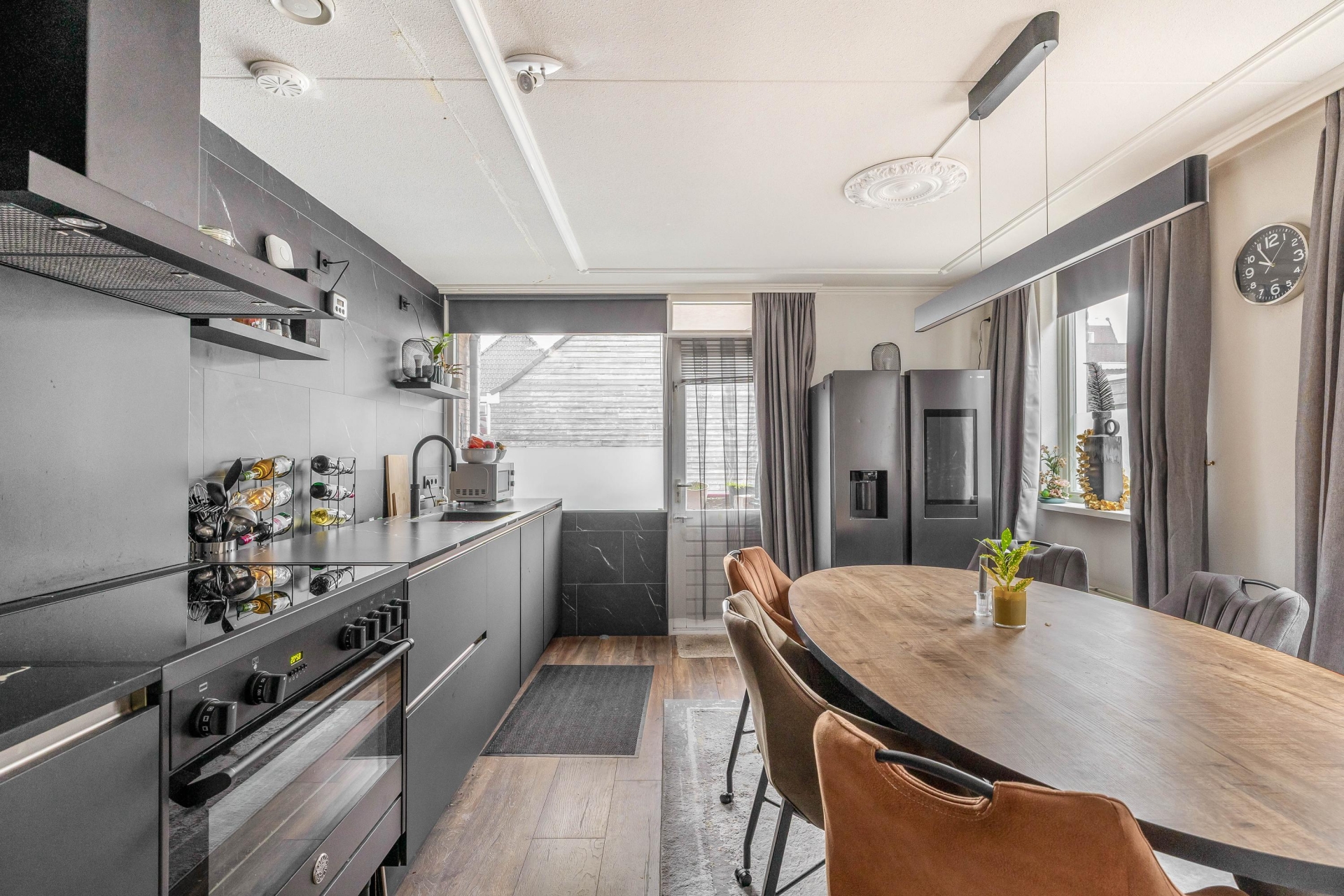 De ruime woonkamer en open keuken vormen samen een fijne leefruimte waar sfeer en functionaliteit perfect samengaan. Grote ramen zorgen voor een prettige lichtinval en een rustige uitstraling. De keuken is in 2023 compleet vernieuwd en vormt met zijn moderne uitstraling en hoogwaardige afwerking het kloppend hart van het huis. Zwarte fronten, een stijlvol werkblad en luxe inbouwapparatuur maken het een genot om hier te koken. Of je nu een diner maakt voor vrienden of snel iets klaarmaakt voor jezelf; in deze keuken kan het allemaal.