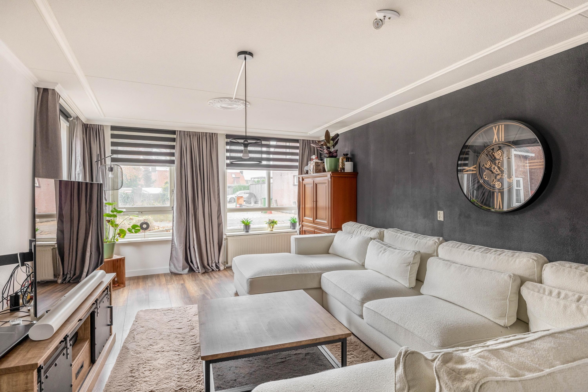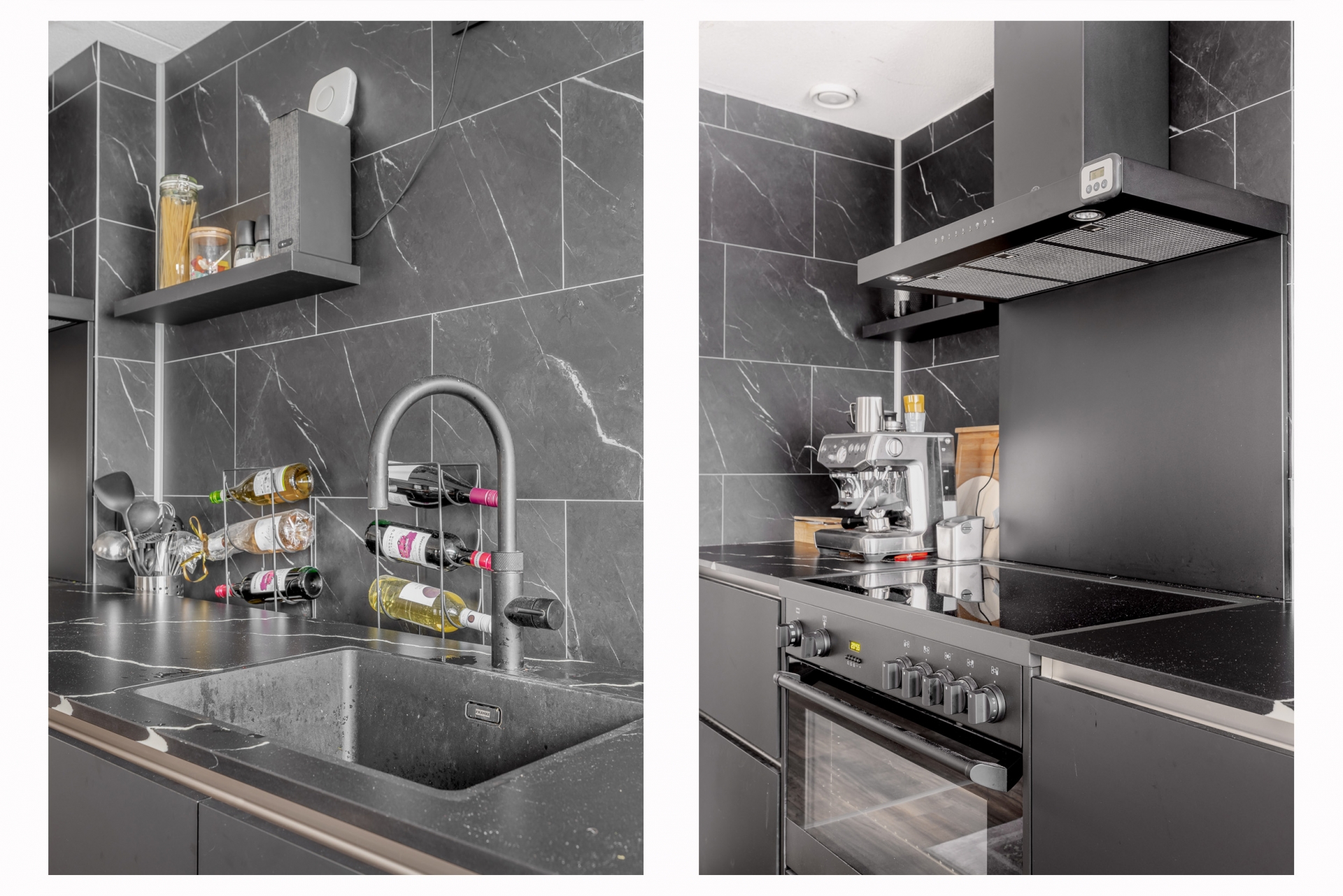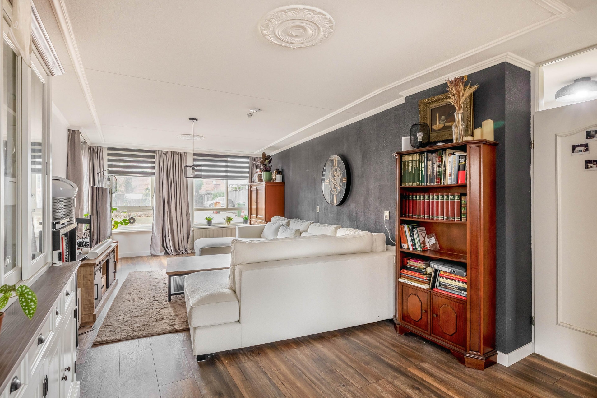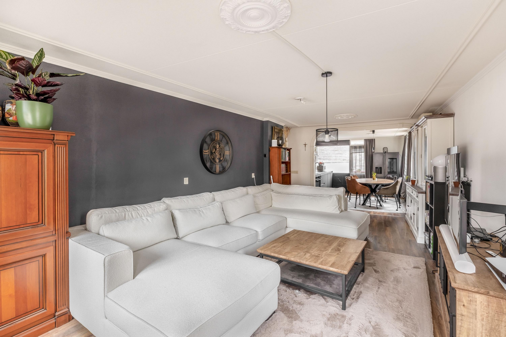 De ruime woonkamer en open keuken vormen samen een fijne leefruimte waar sfeer en functionaliteit perfect samengaan. Grote ramen zorgen voor een prettige lichtinval en een rustige uitstraling. De keuken is in 2023 compleet vernieuwd en vormt met zijn moderne uitstraling en hoogwaardige afwerking het kloppend hart van het huis. Zwarte fronten, een stijlvol werkblad en luxe inbouwapparatuur maken het een genot om hier te koken. Of je nu een diner maakt voor vrienden of snel iets klaarmaakt voor jezelf; in deze keuken kan het allemaal.