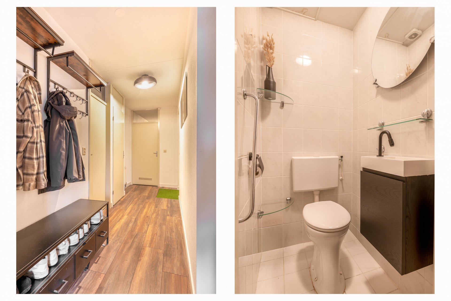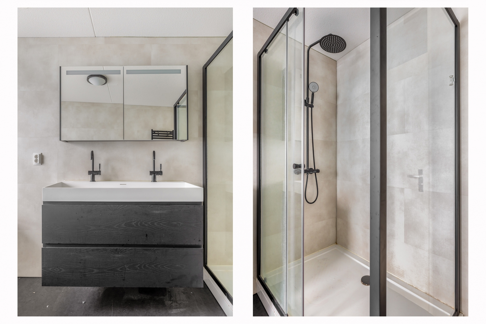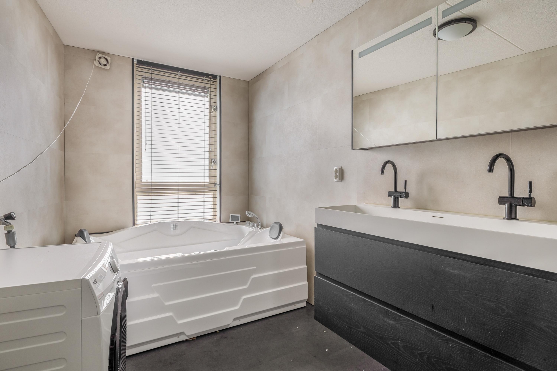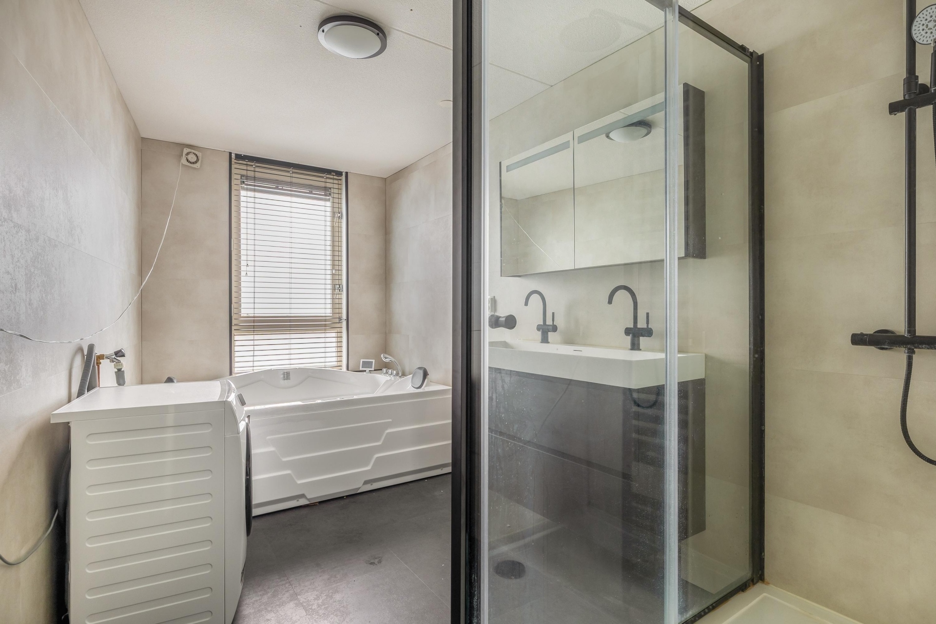 De badkamer is, net als de keuken, in 2023 vernieuwd en straalt luxe uit. Er is gekozen voor een moderne afwerking met grote tegels, zwarte accenten en een praktische indeling. Je beschikt hier over een inloopdouche, ligbad en dubbele wastafel met bijpassend meubel. Ook de aansluiting voor de wasmachine is hier netjes weggewerkt. Het separate toilet bevindt zich in de hal.