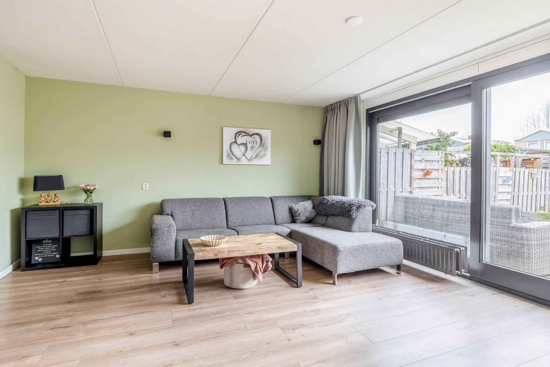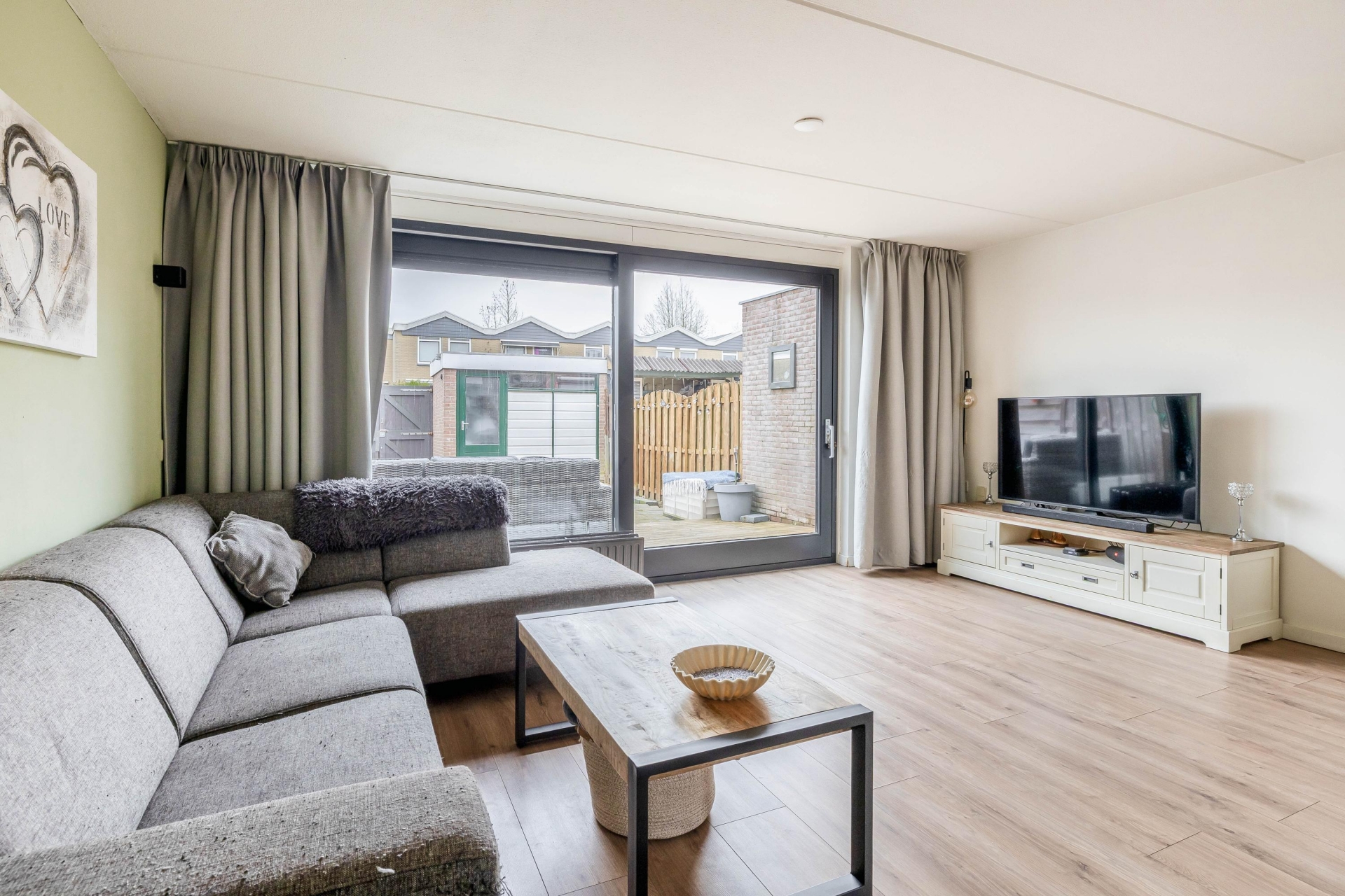 Bij binnenkomst kom je in de entree met toegang tot het toilet, de meterkast en de trap naar boven. Vanuit hier loop je door naar de woonkamer aan de achterzijde van het huis. Deze ruimte is prettig licht dankzij de grote schuifpui en biedt voldoende plek voor een ruime zithoek. Het contact met de tuin maakt dit een fijne leefruimte waar binnen en buiten moeiteloos in elkaar overlopen.