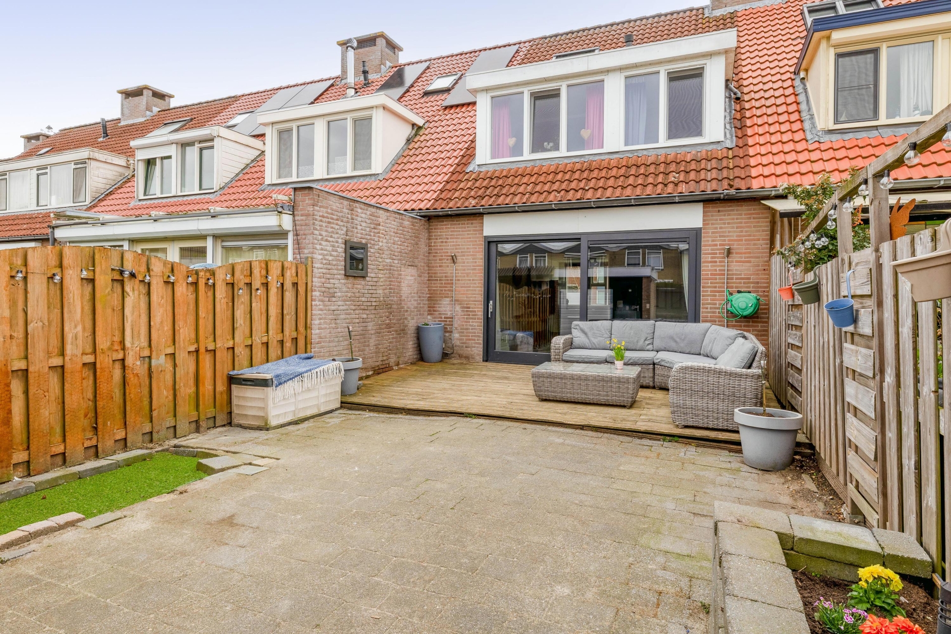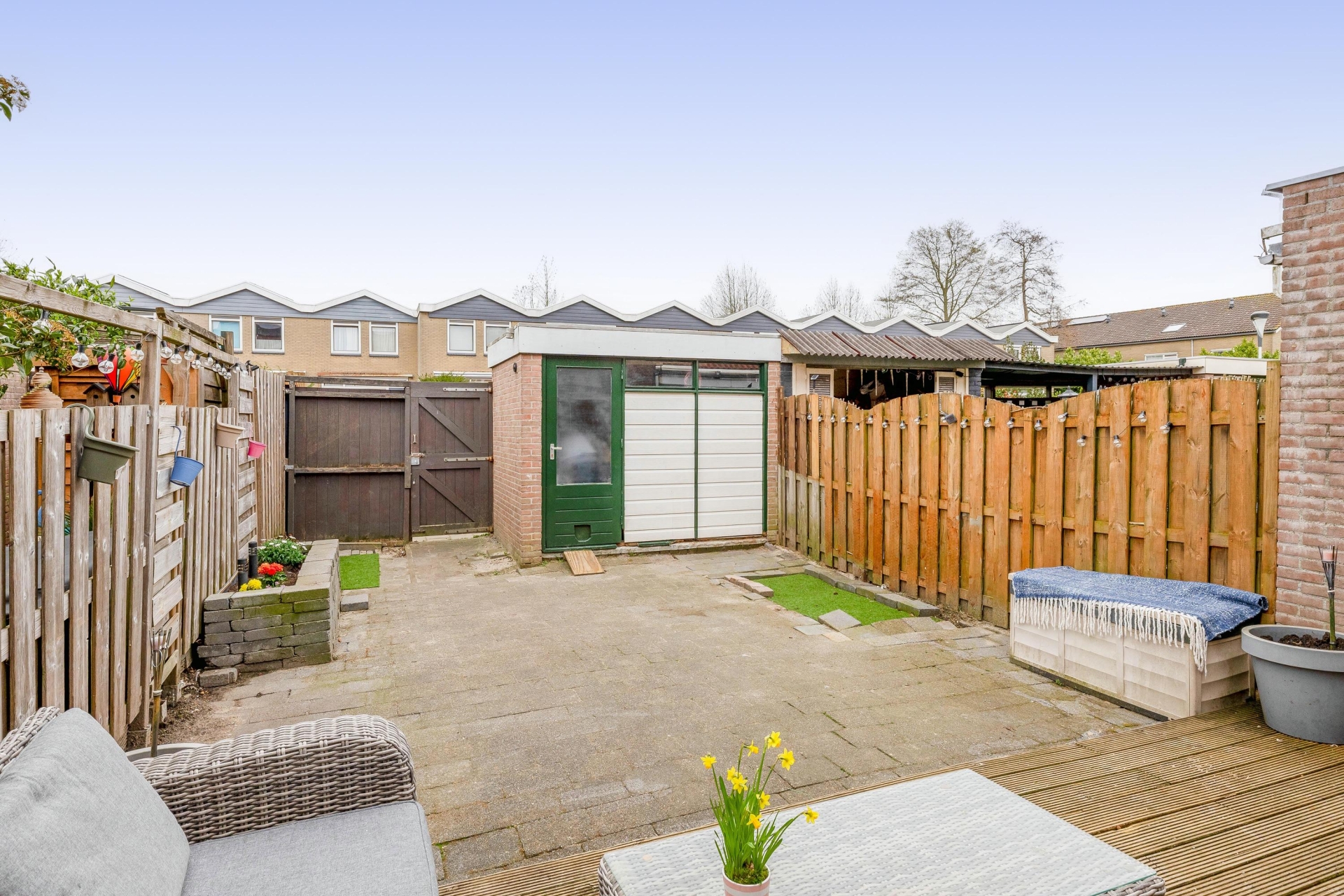 De achtertuin is gelegen op het oosten en biedt een fijne plek om de dag te starten met een kop koffie in de ochtendzon. De tuin is grotendeels bestraat en daardoor onderhoudsvriendelijk ingericht. Achterin staat een berging, ideaal voor fietsen en tuingereedschap. De tuin is diep genoeg om verschillende zitplekken te creëren en biedt voldoende ruimte voor zowel ontspanning als spelende kinderen.