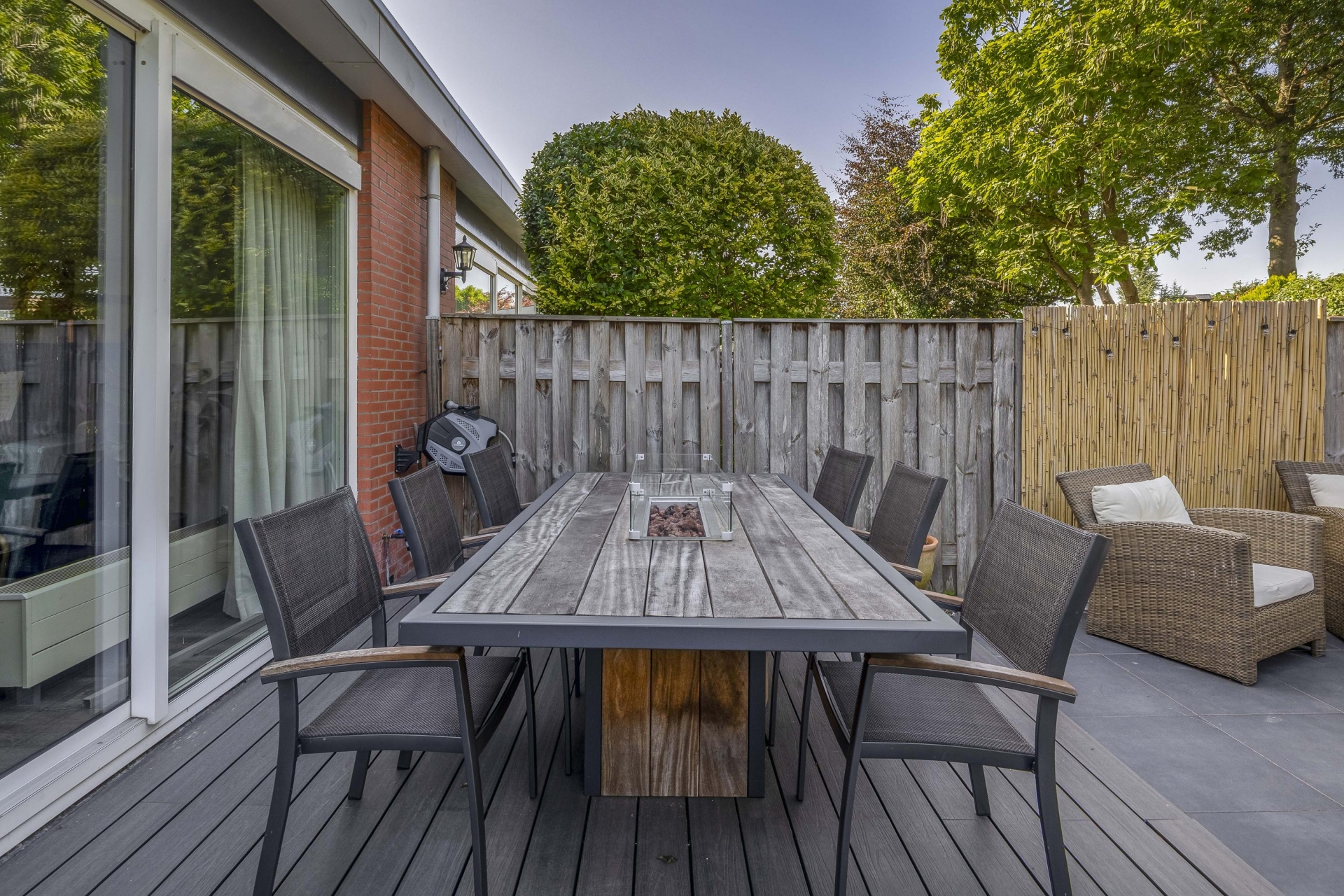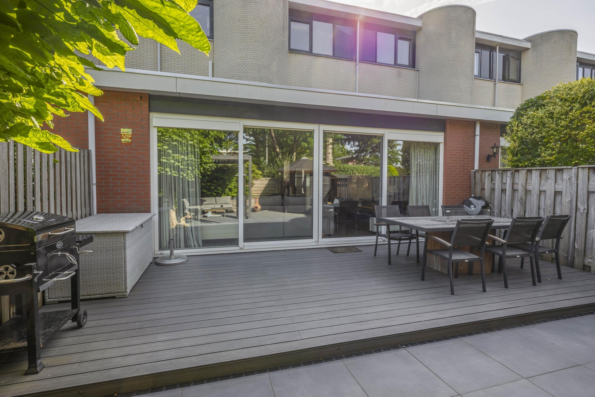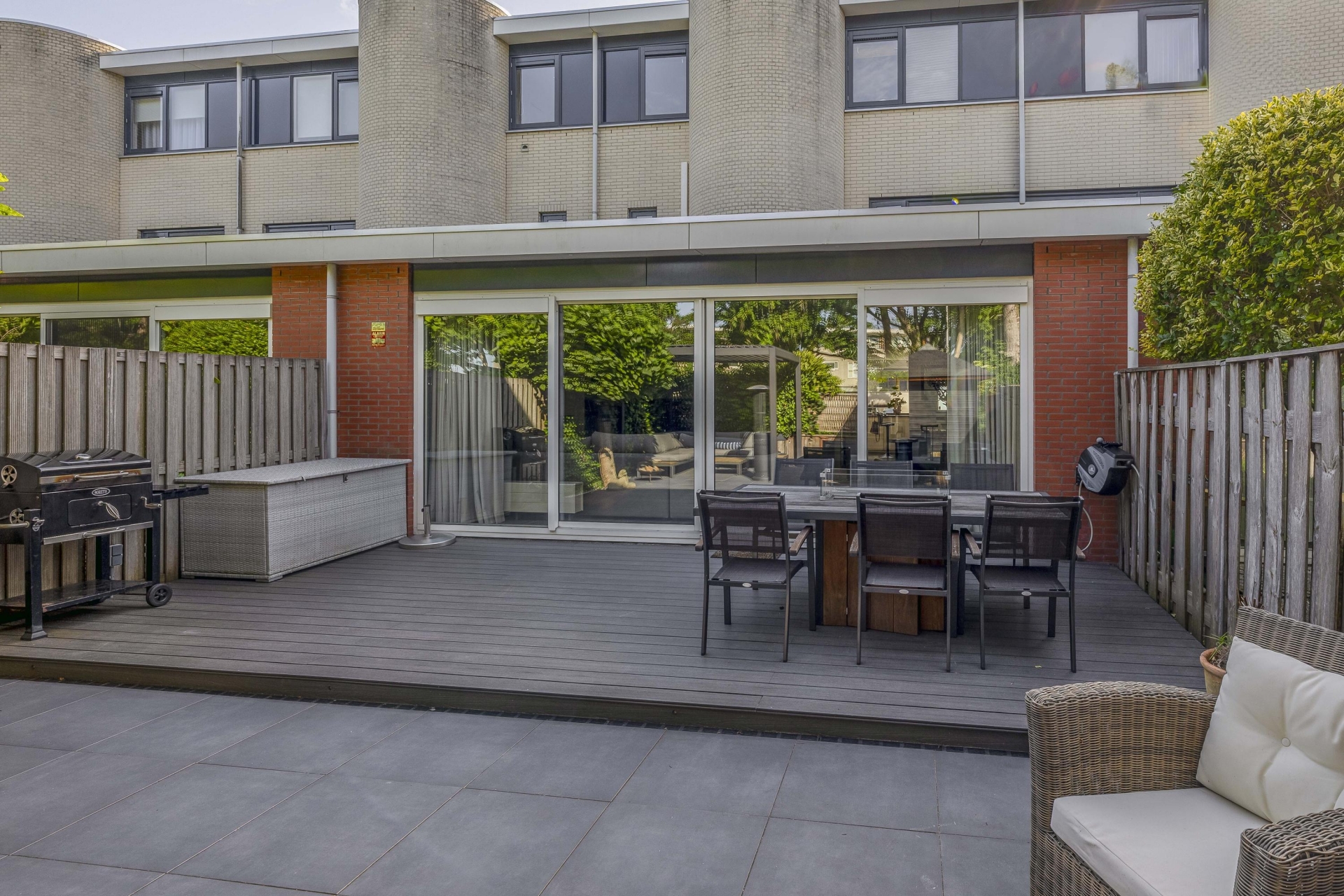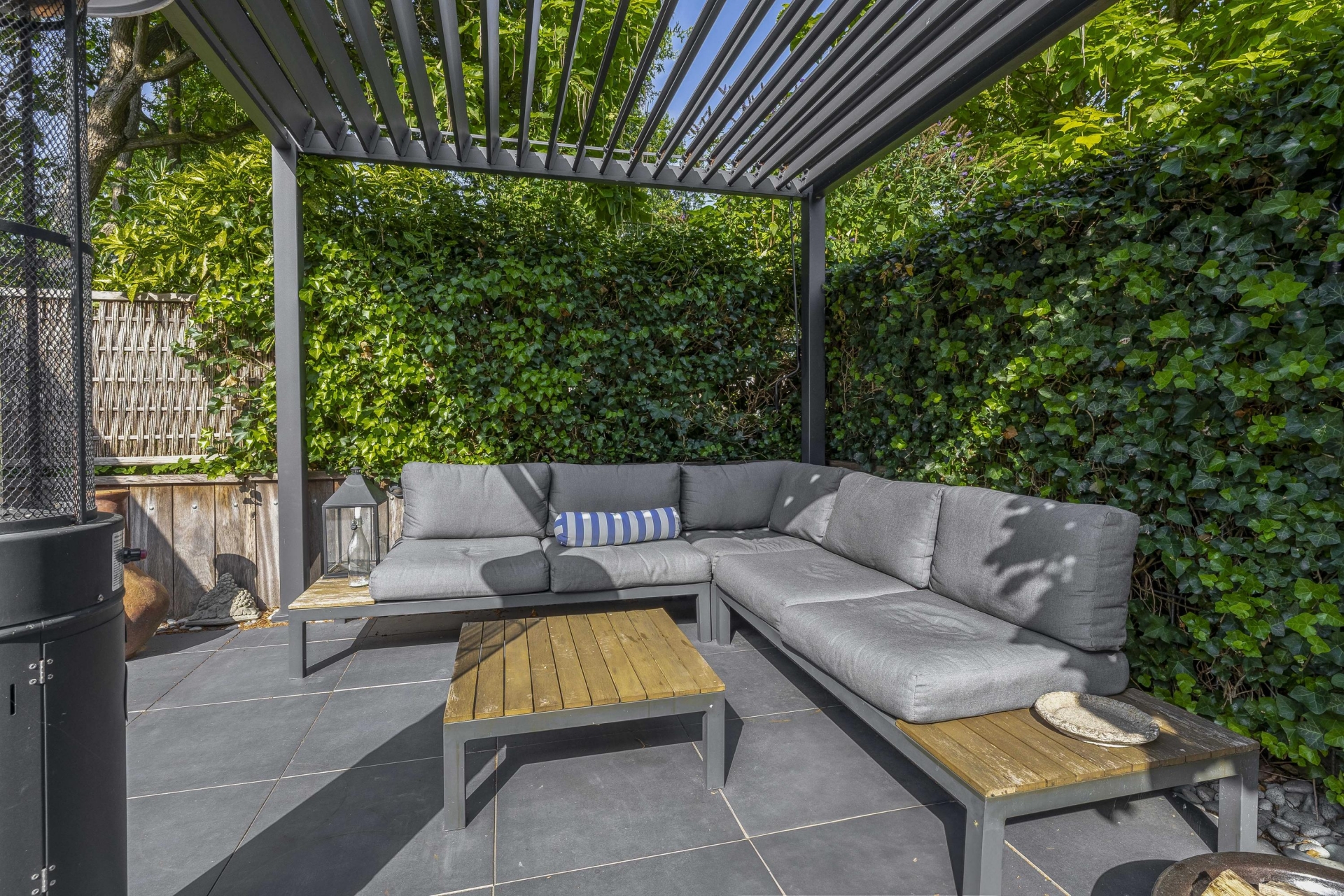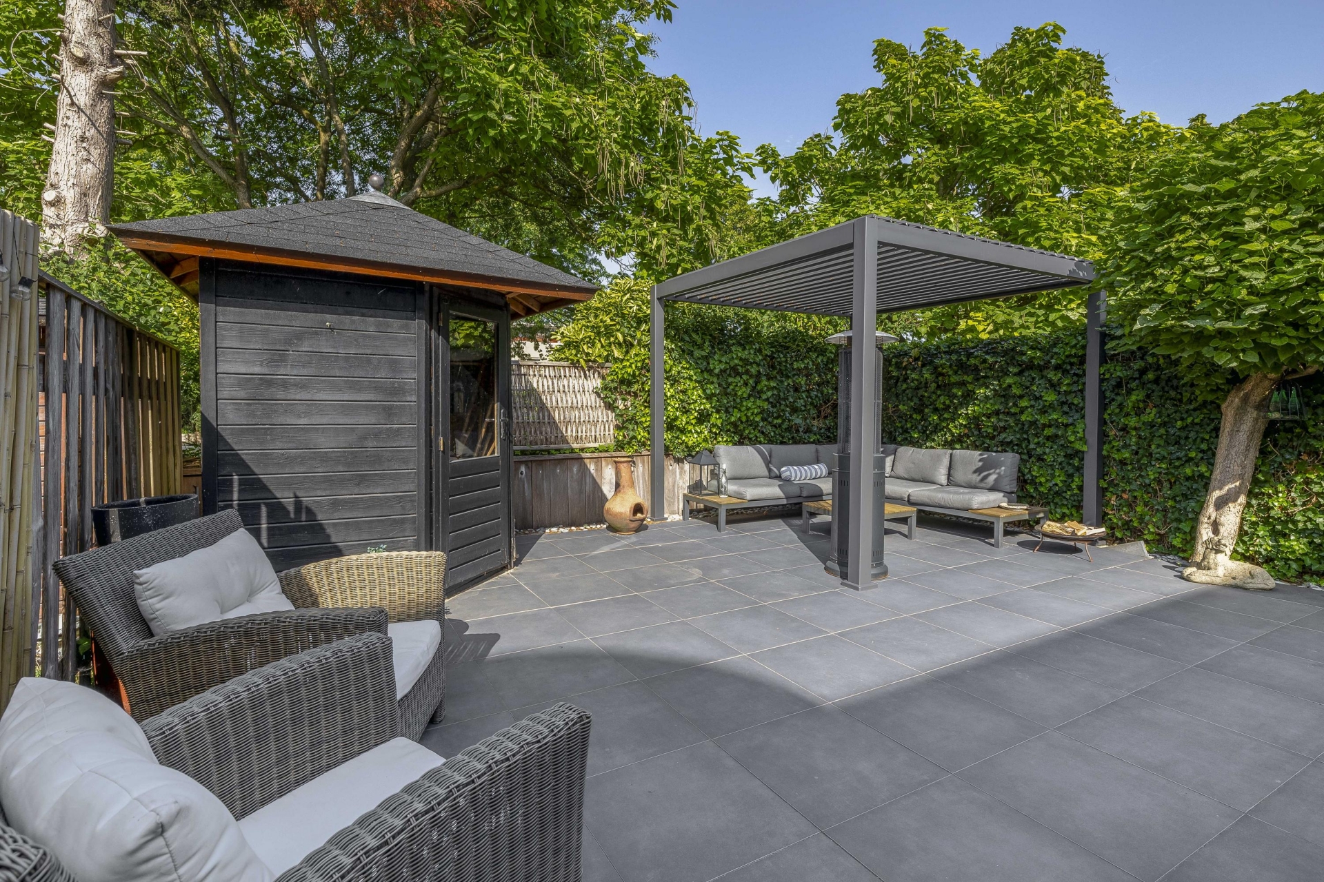 Ook buiten is aan alles gedacht. De recent vernieuwde achtertuin (2020) beschikt over een fraaie metalen overkapping met beweegbaar lamellendak, waardoor je op elk moment van de dag kunt kiezen voor zon of schaduw. Er is voldoende ruimte om te loungen of te dineren in de open lucht.