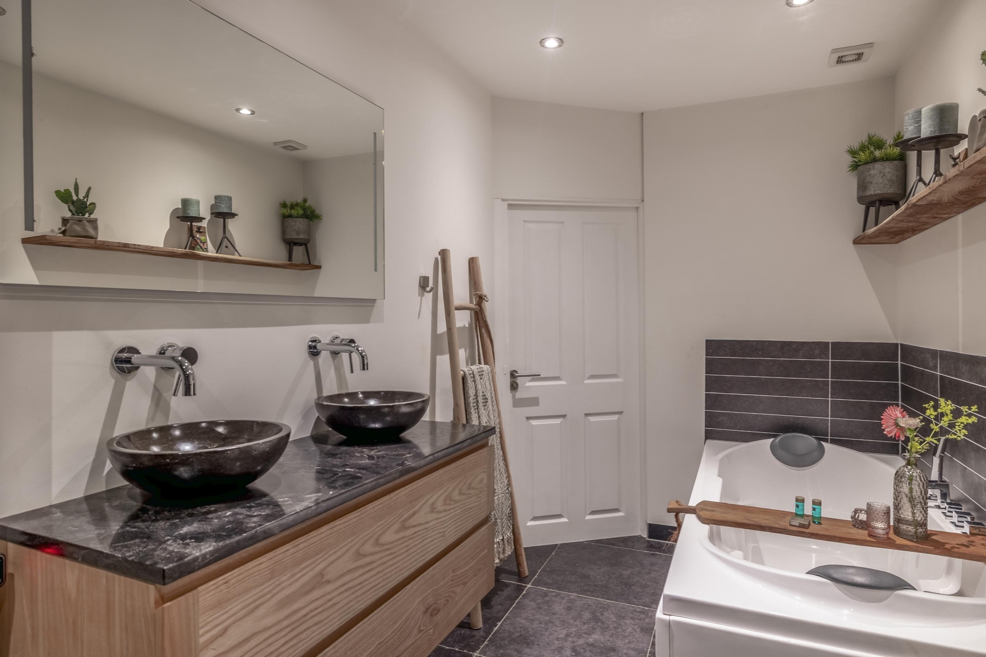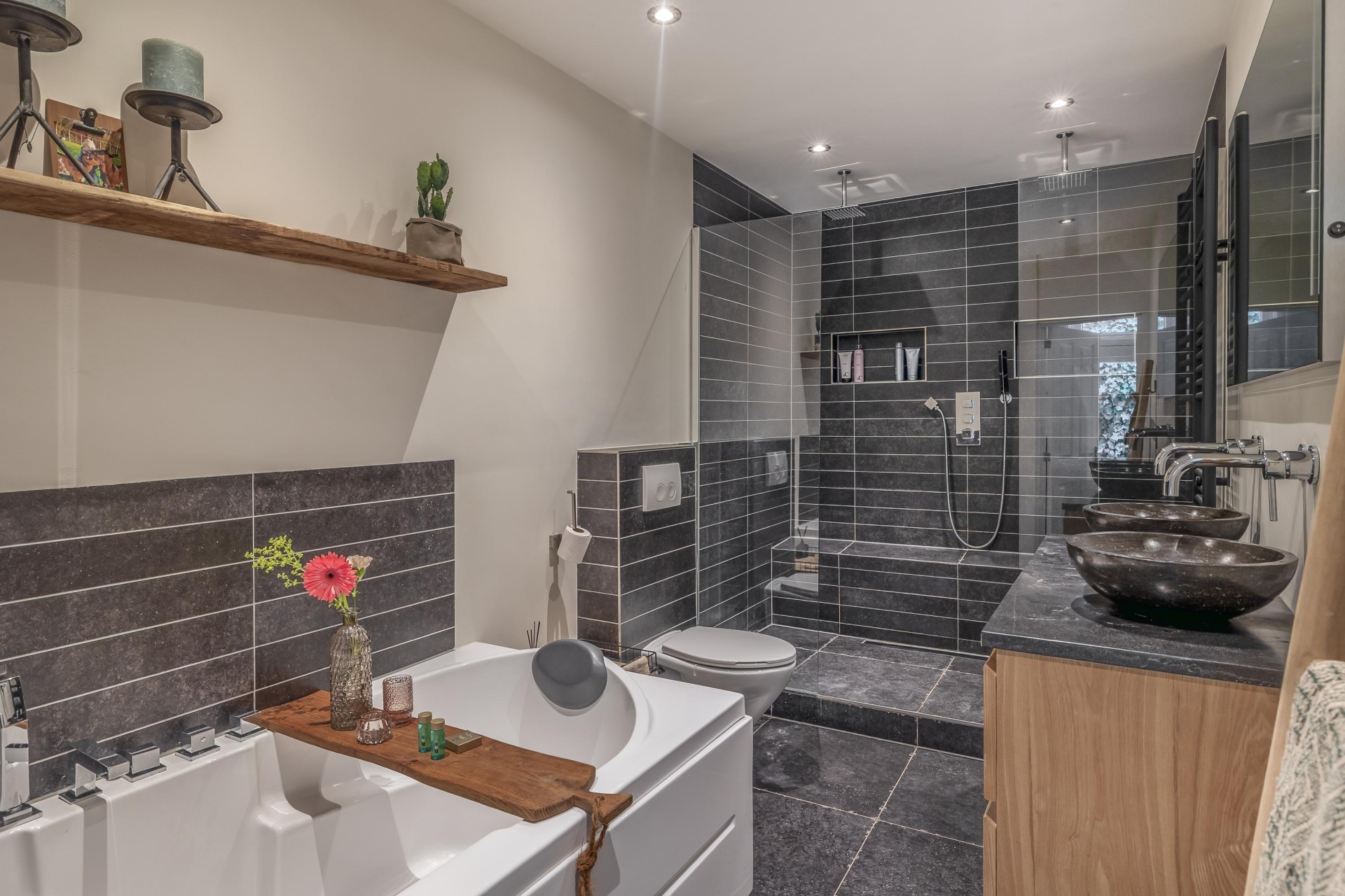 Op de benedenverdieping vind je een verrassend luxe uitgevoerde badkamer. Denk aan een ruime inloopdouche, dubbele waskommen, een stijlvol bad en smaakvolle tegelafwerking: alles klopt. Hier kom je tot rust na een lange dag. De rest van deze verdieping is ingericht als multifunctionele ruimte en biedt toegang tot de kantoor-/praktijkruimte aan huis. Of je nu een werkruimte zoekt, een atelier, praktijkruimte of een plek voor hobby’s - of een 4e slaapkamer...het is hier allemaal mogelijk. Dankzij een eigen entree is deze ruimte ook prima te gebruiken voor werk met cliënten of bezoekers.