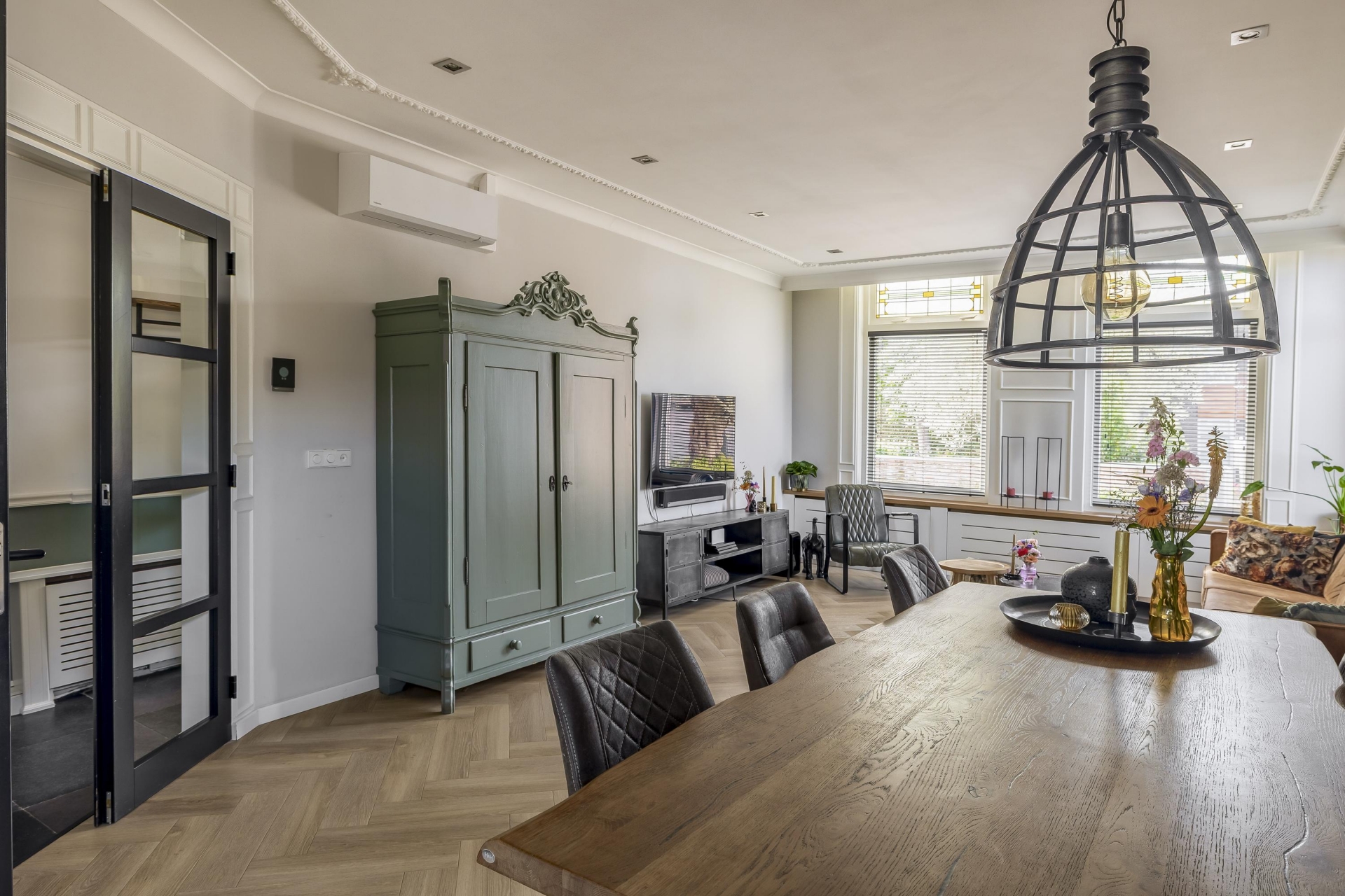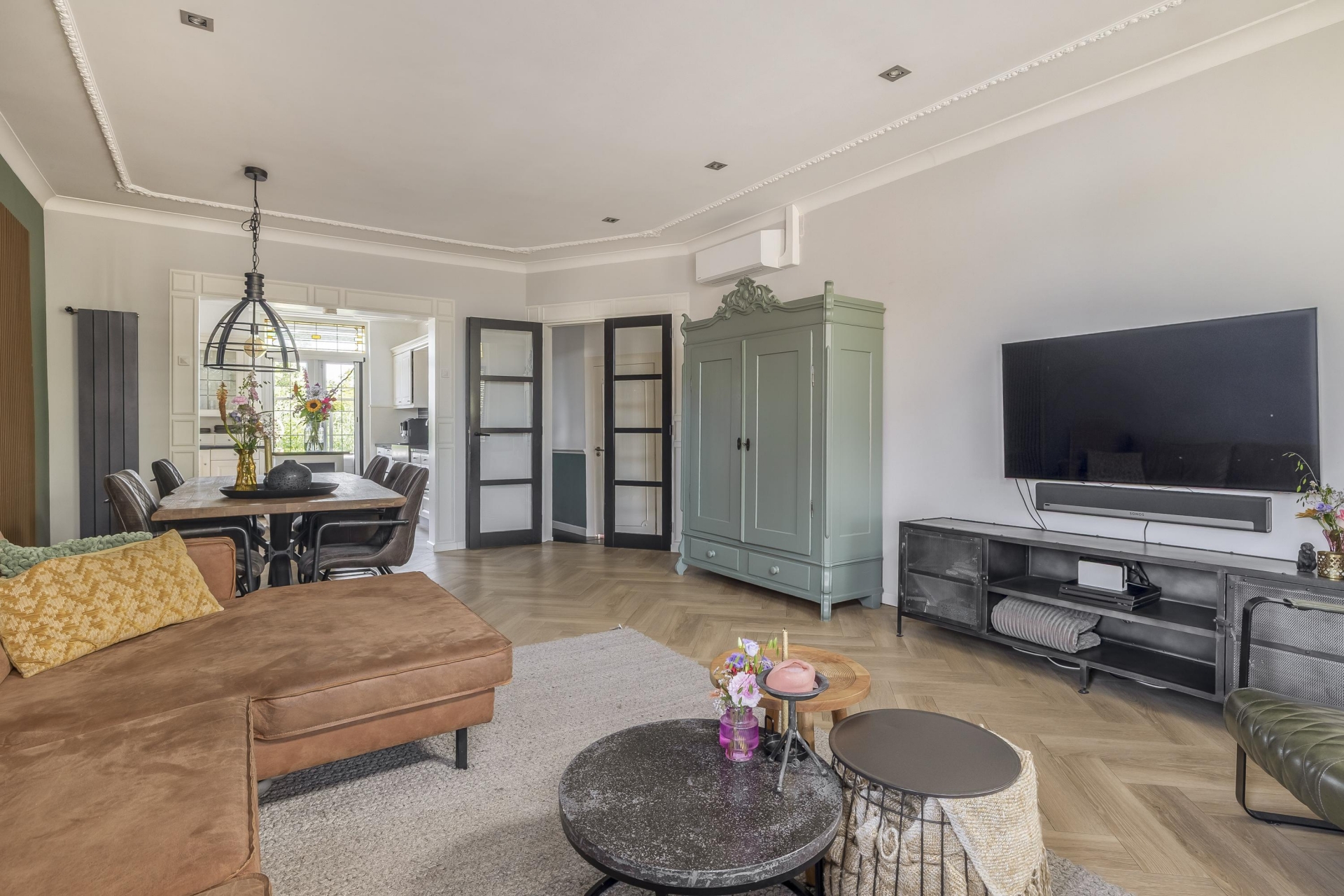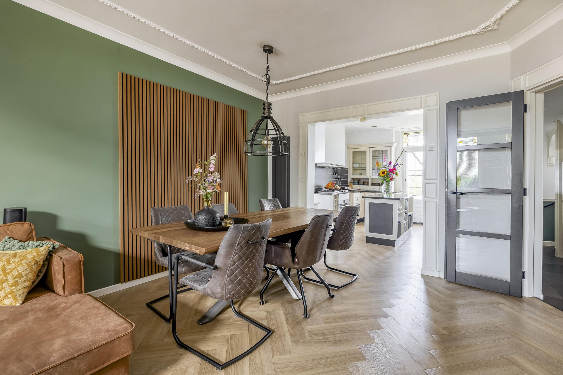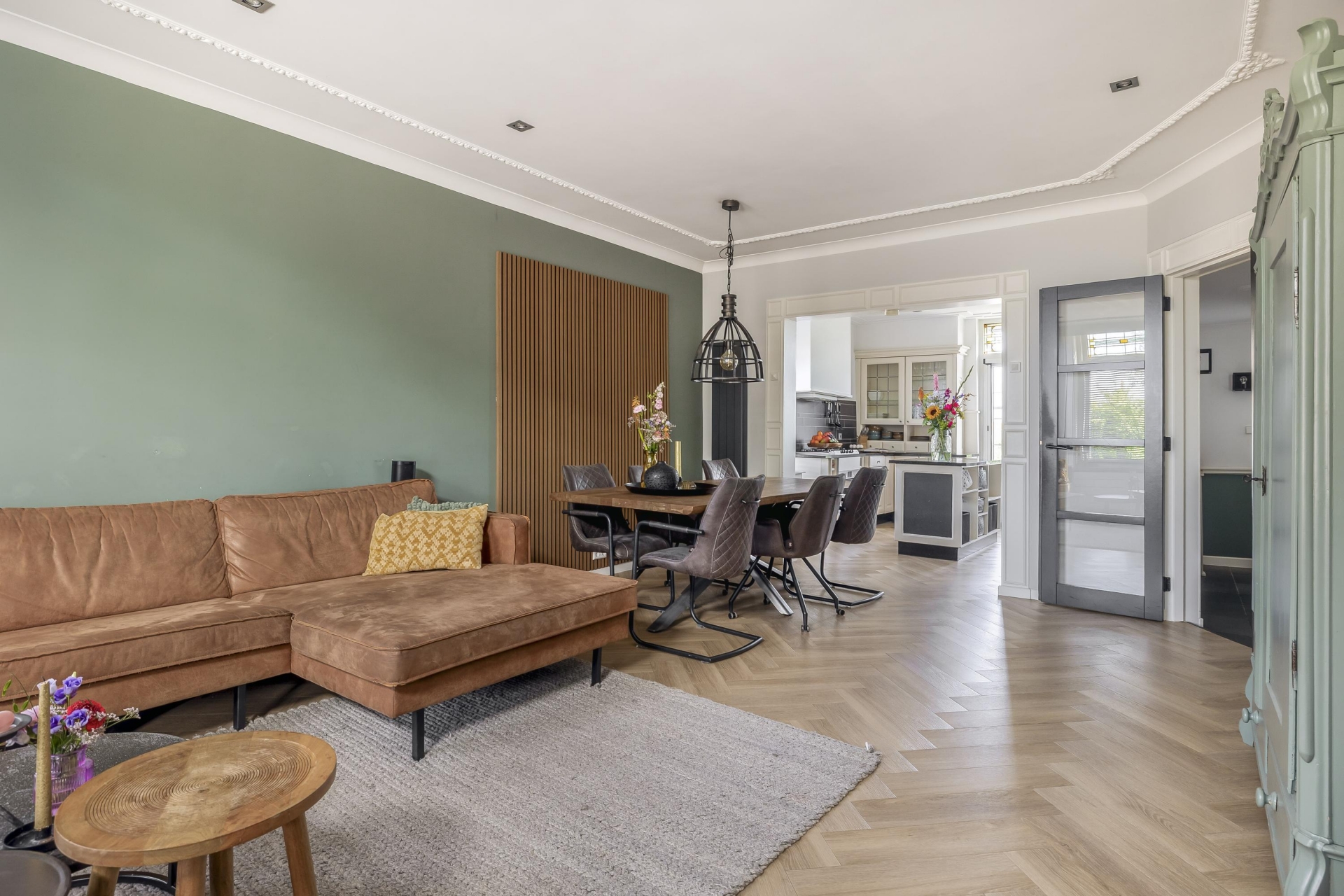 Zodra je de woonkamer binnen stapt, voel je het: hier wordt met liefde en smaak gewoond. De royale leefruimte op dijkniveau is licht, ruim en warm ingericht. De mooie visgraatvloer, hoge plafonds en open verbinding naar de keuken geven het geheel een prettige sfeer. De woonkamer biedt ruimte voor een grote zithoek én een eettafel — ideaal voor gezellige etentjes met familie of vrienden.