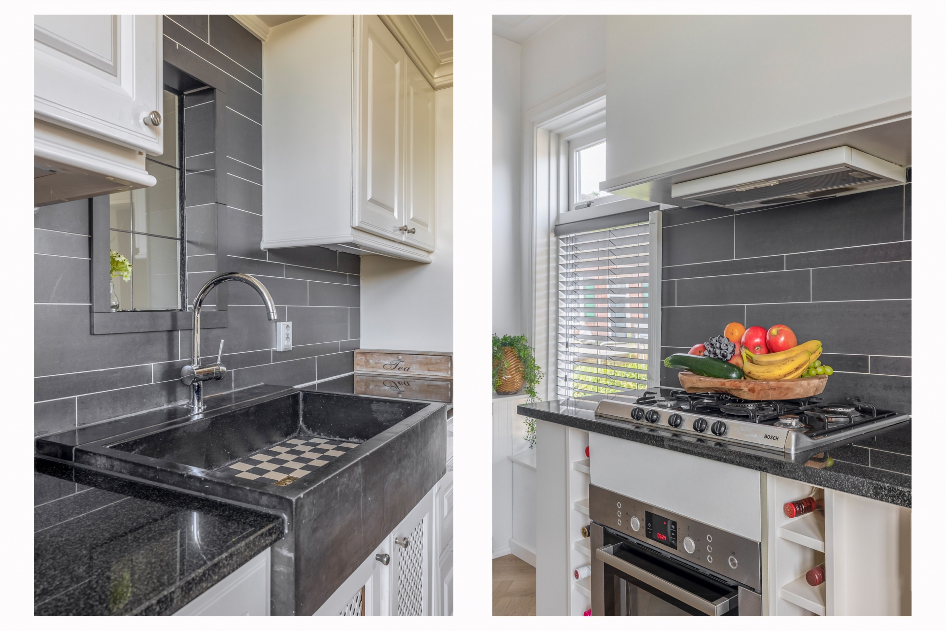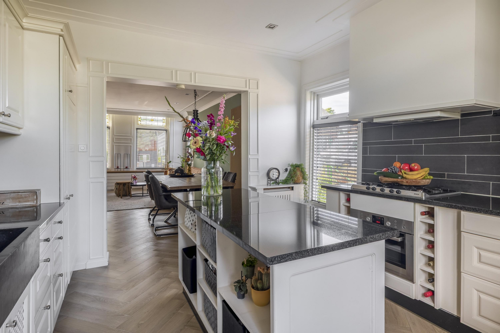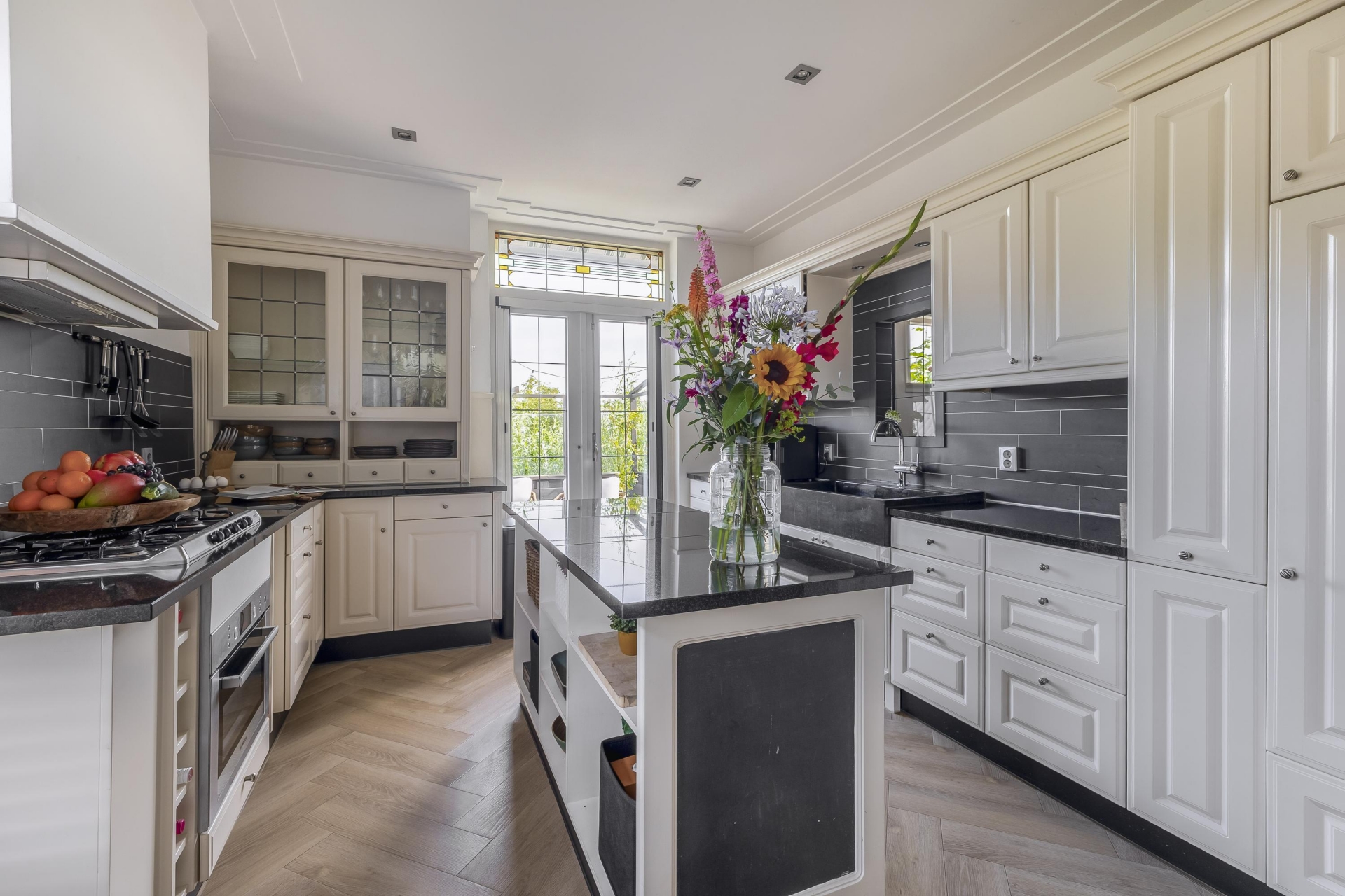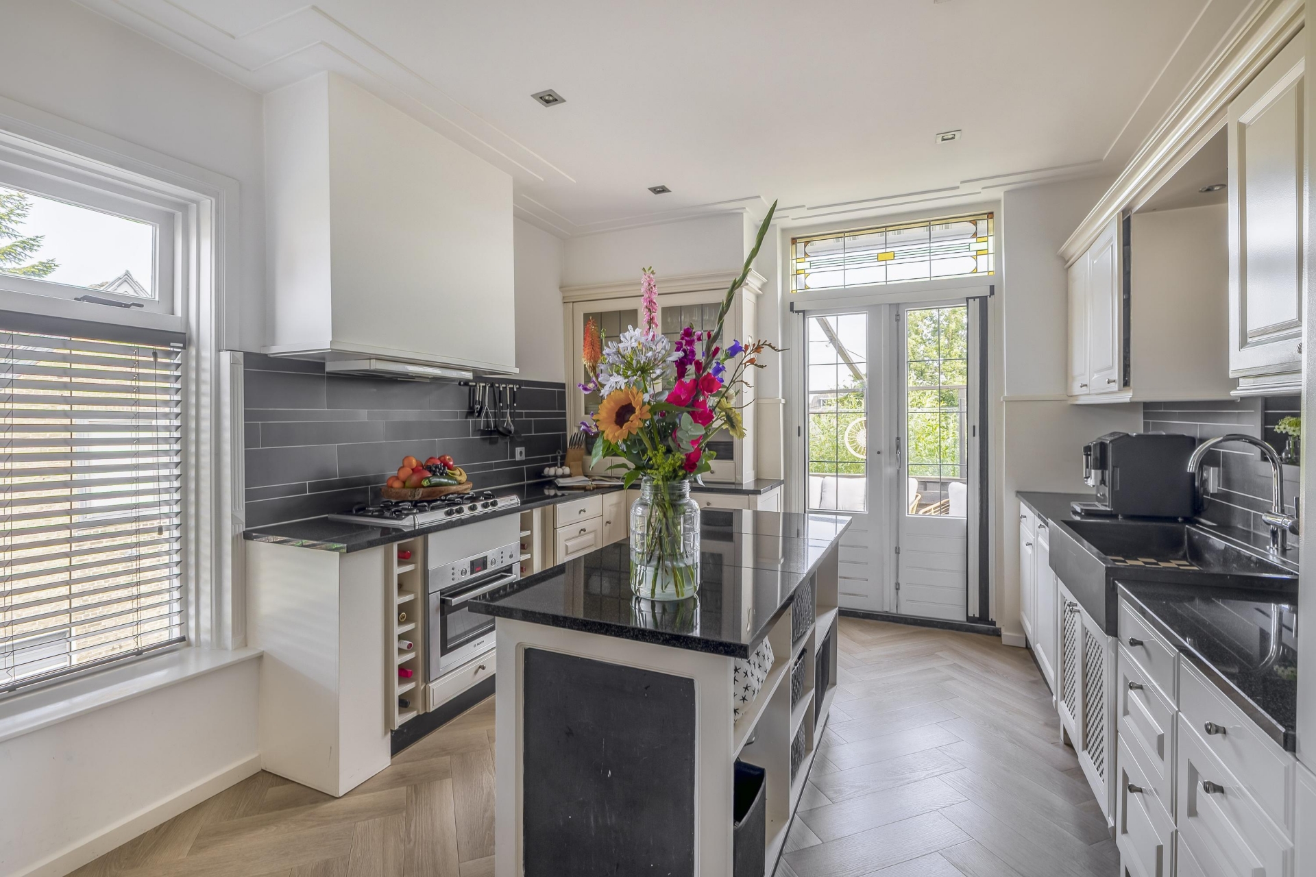 De aangrenzende keuken is praktisch ingedeeld, voorzien van alle moderne gemakken en beschikt over veel bergruimte. De combinatie van sfeervolle details met hedendaags comfort zorgt voor een fijne plek waar koken vanzelf ontspanning wordt. Het terras aan de achterzijde is een verlengde van de woonkeuken.