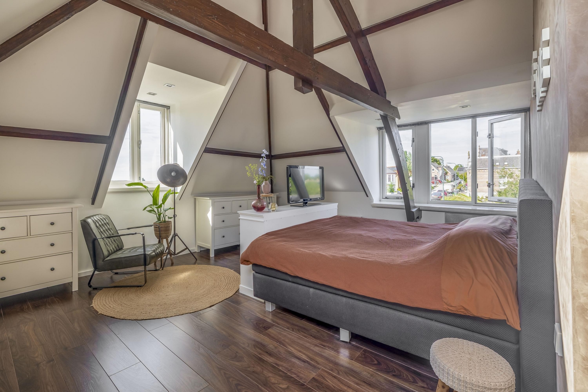 De verdieping telt 3 slaapkamers. De grootste kamer met zicht op De Lek voelt extra ruimtelijk aan dankzij de dakkapel. De andere kamers zijn eveneens netjes afgewerkt en van een goed formaat.